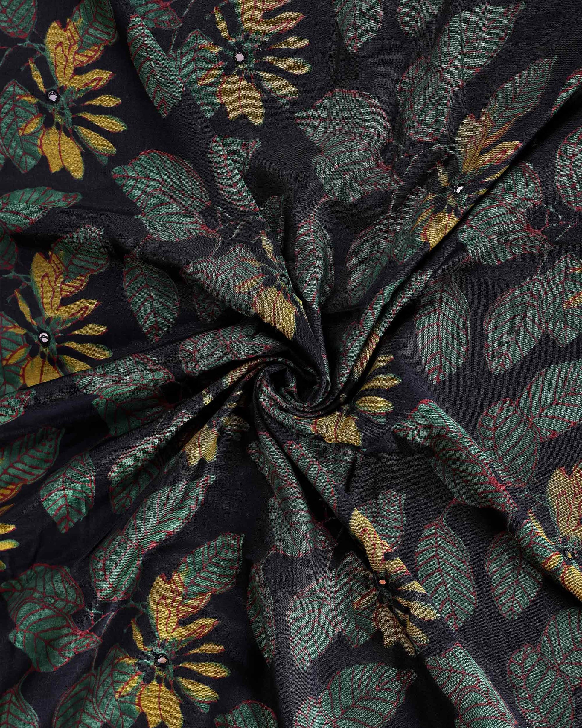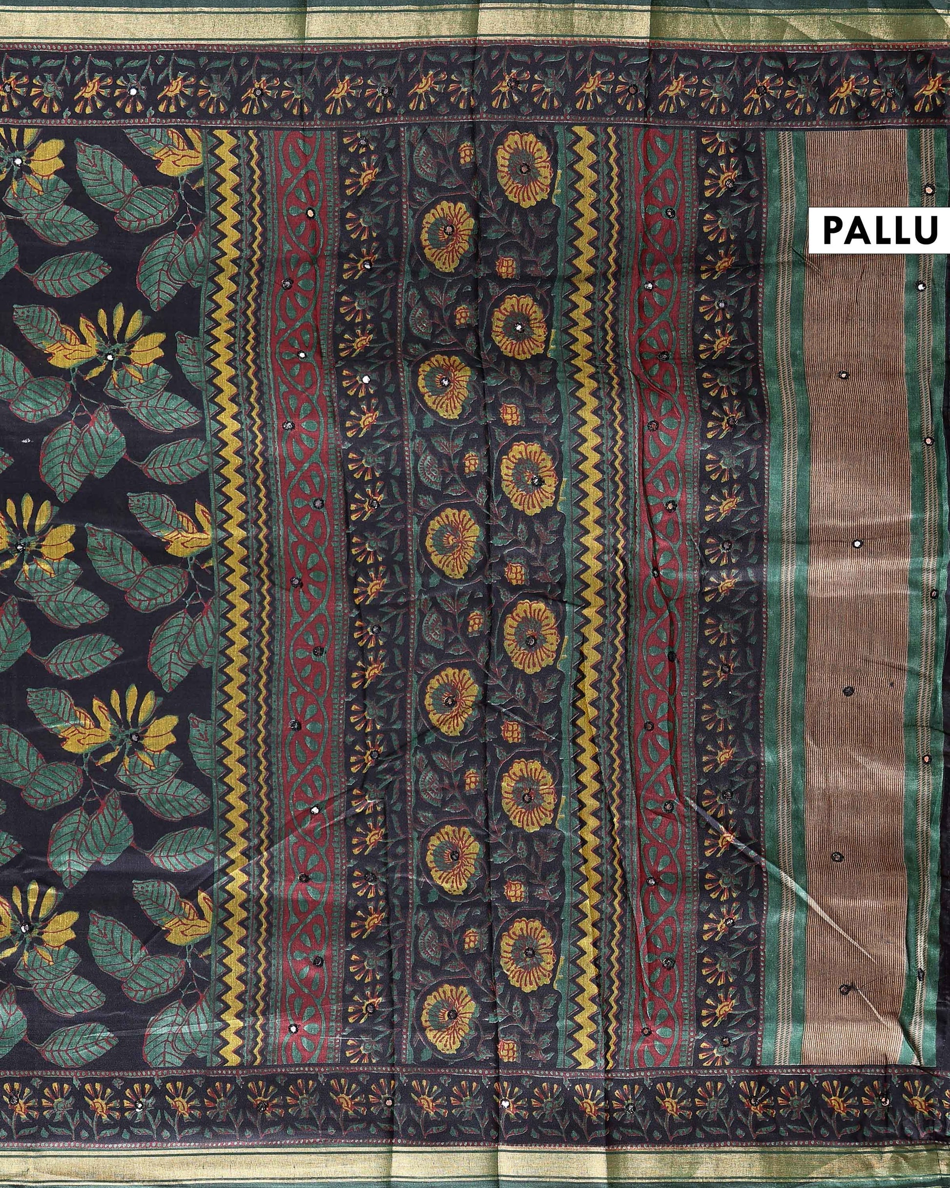 - This is an elegant Black colour semi chanderi saree with Floral inspired all over print and intricate golden zari border perfect for everyday elegance.