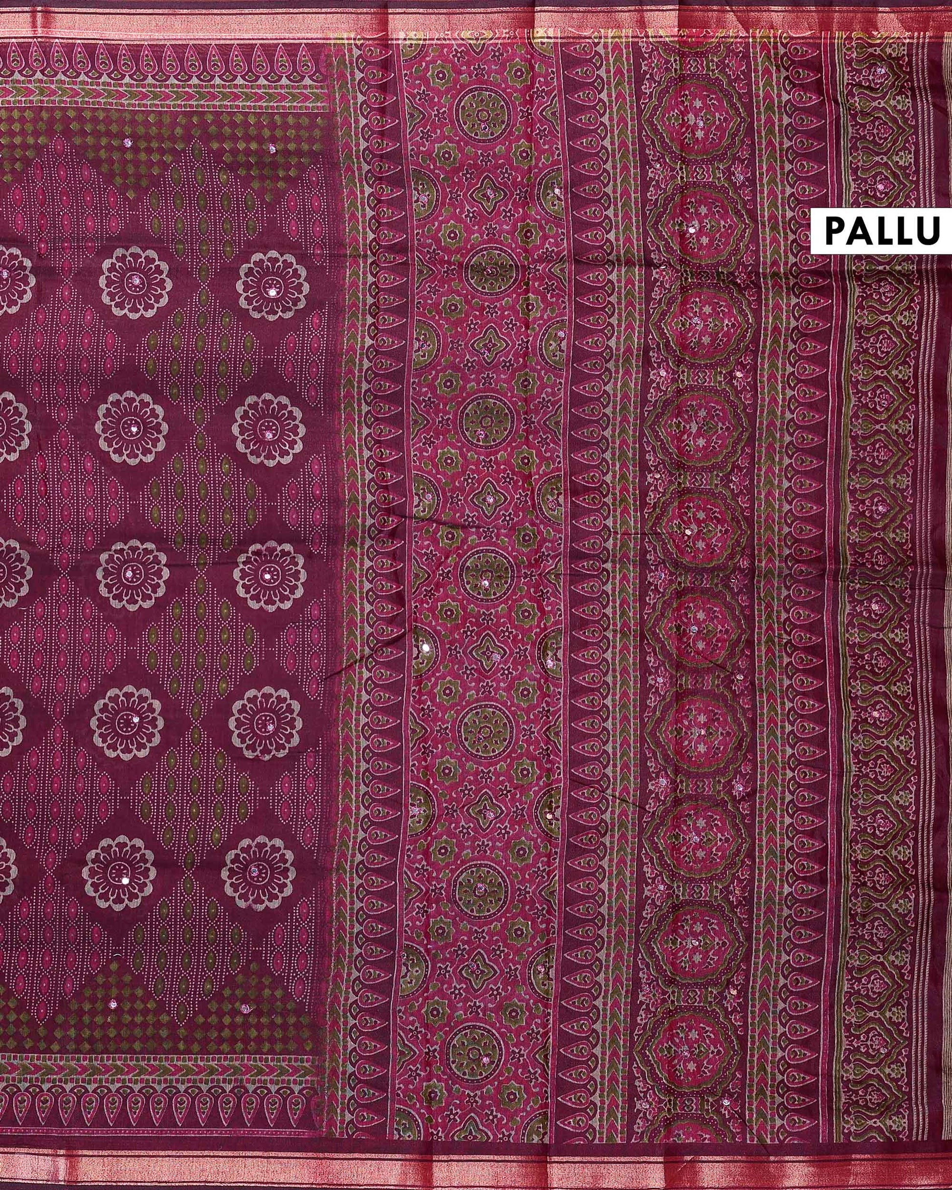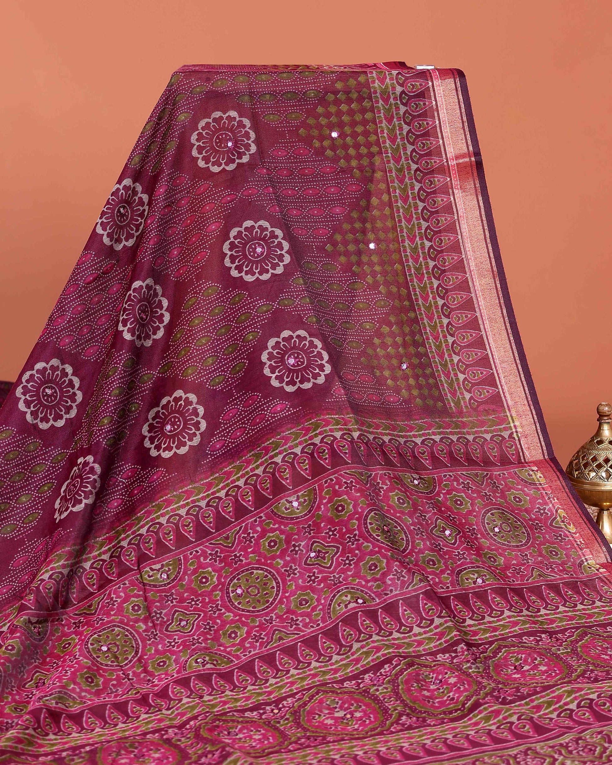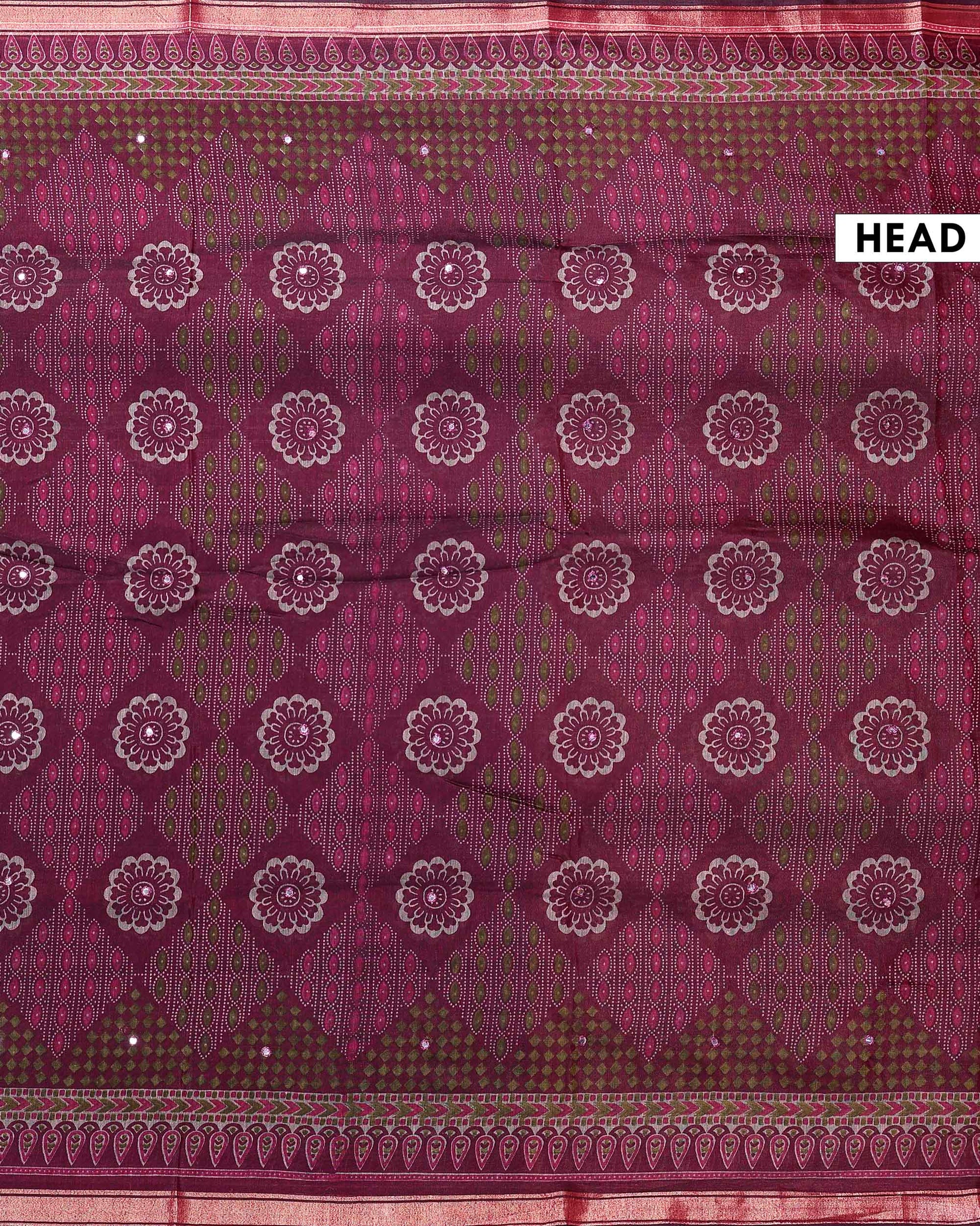 Classic Semi Chanderi Saree with Floral Inspired Print and Zari Border - Burgundy