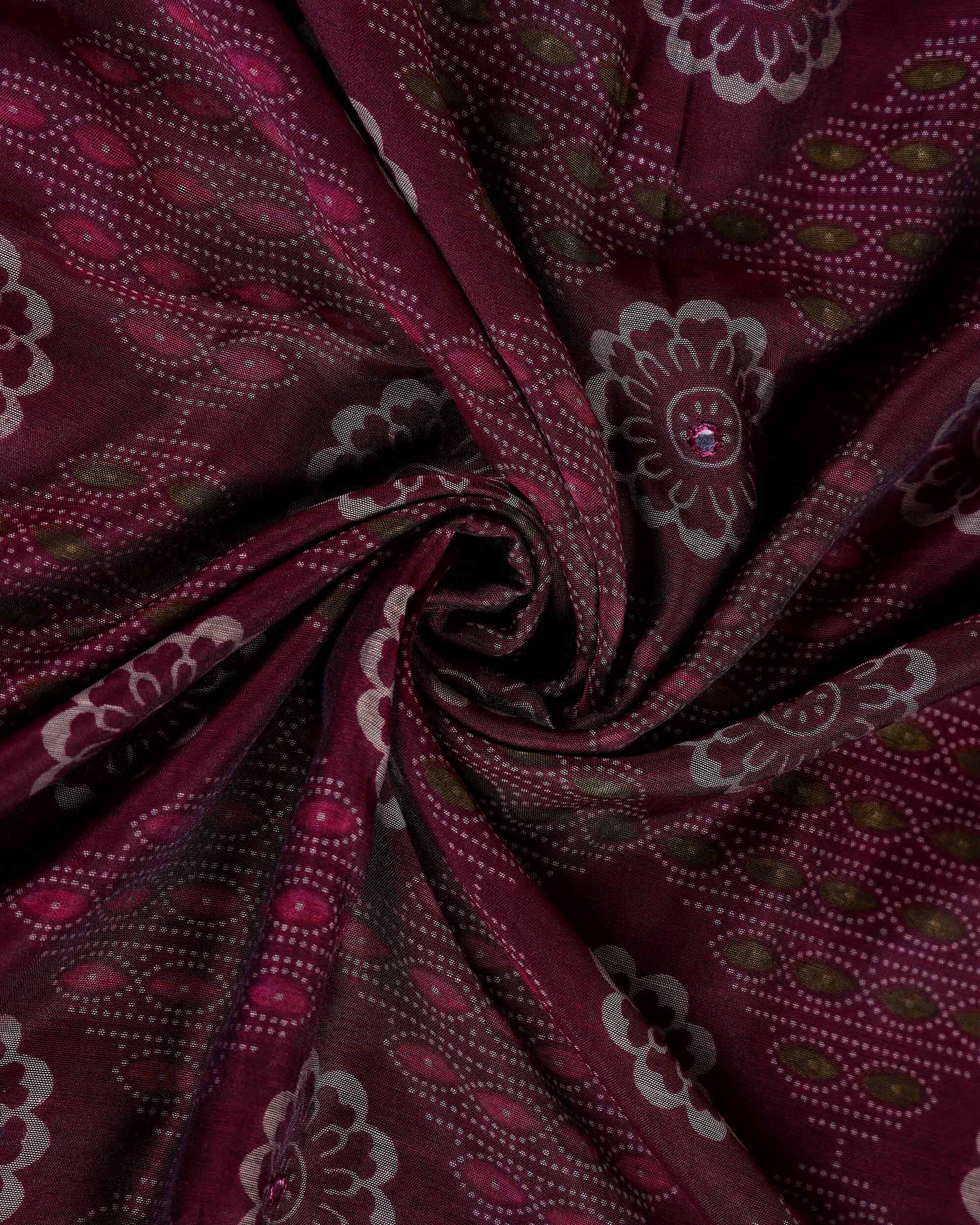 - This is an elegant Burgundy colour semi chanderi saree with Floral inspired all over print and intricate golden zari border perfect for everyday elegance.