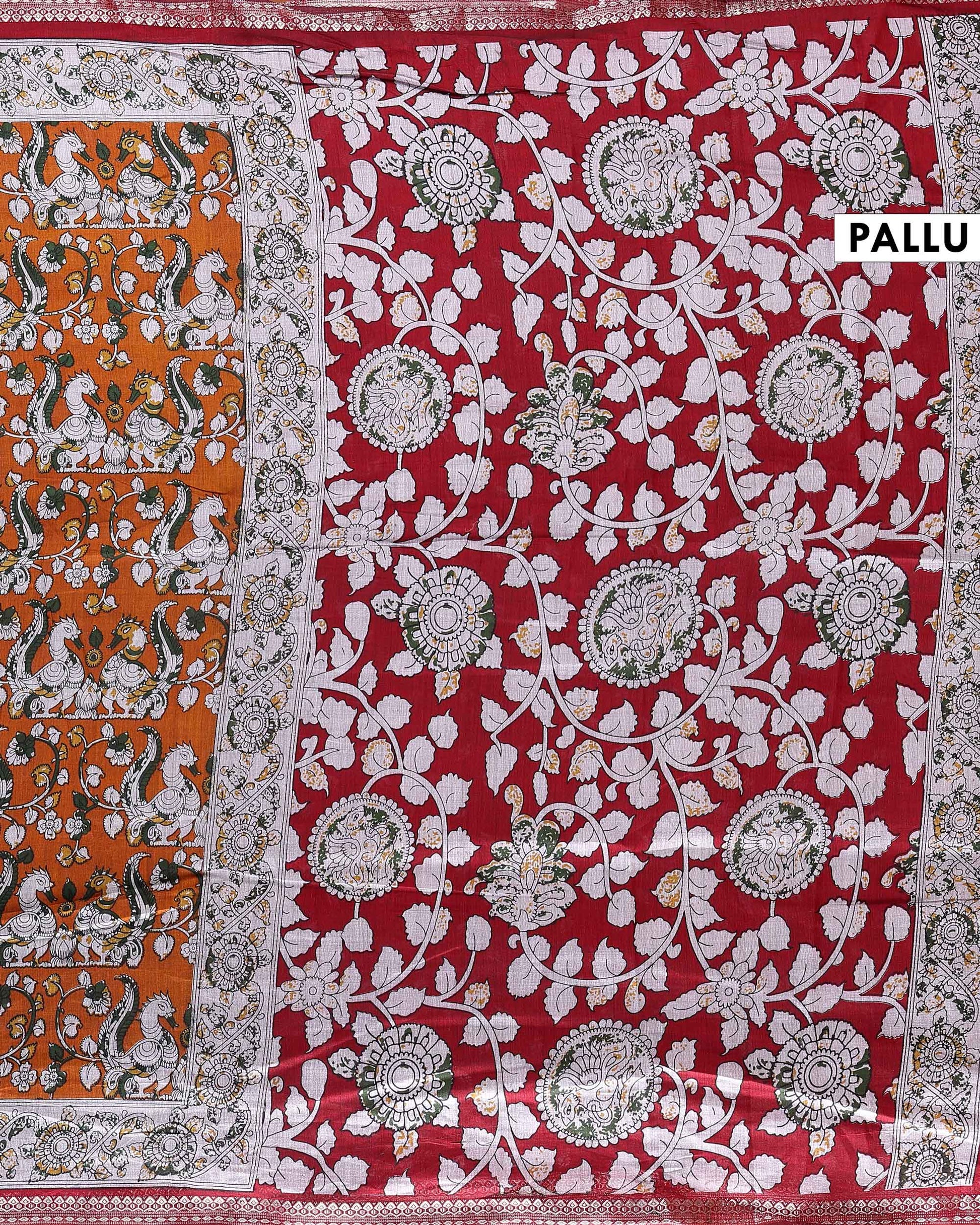 Classic Semi Chanderi Saree with Kalamkari Inspired Print and Zari Border - Yellow