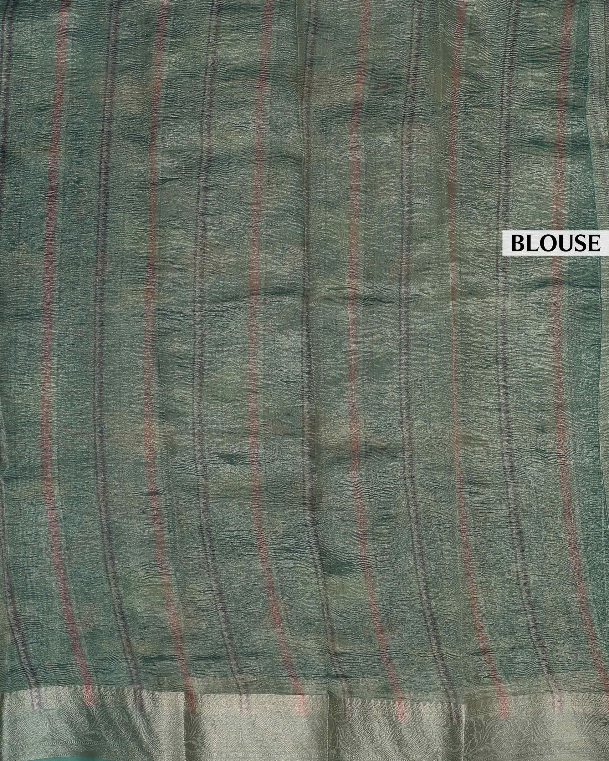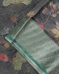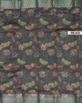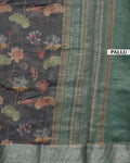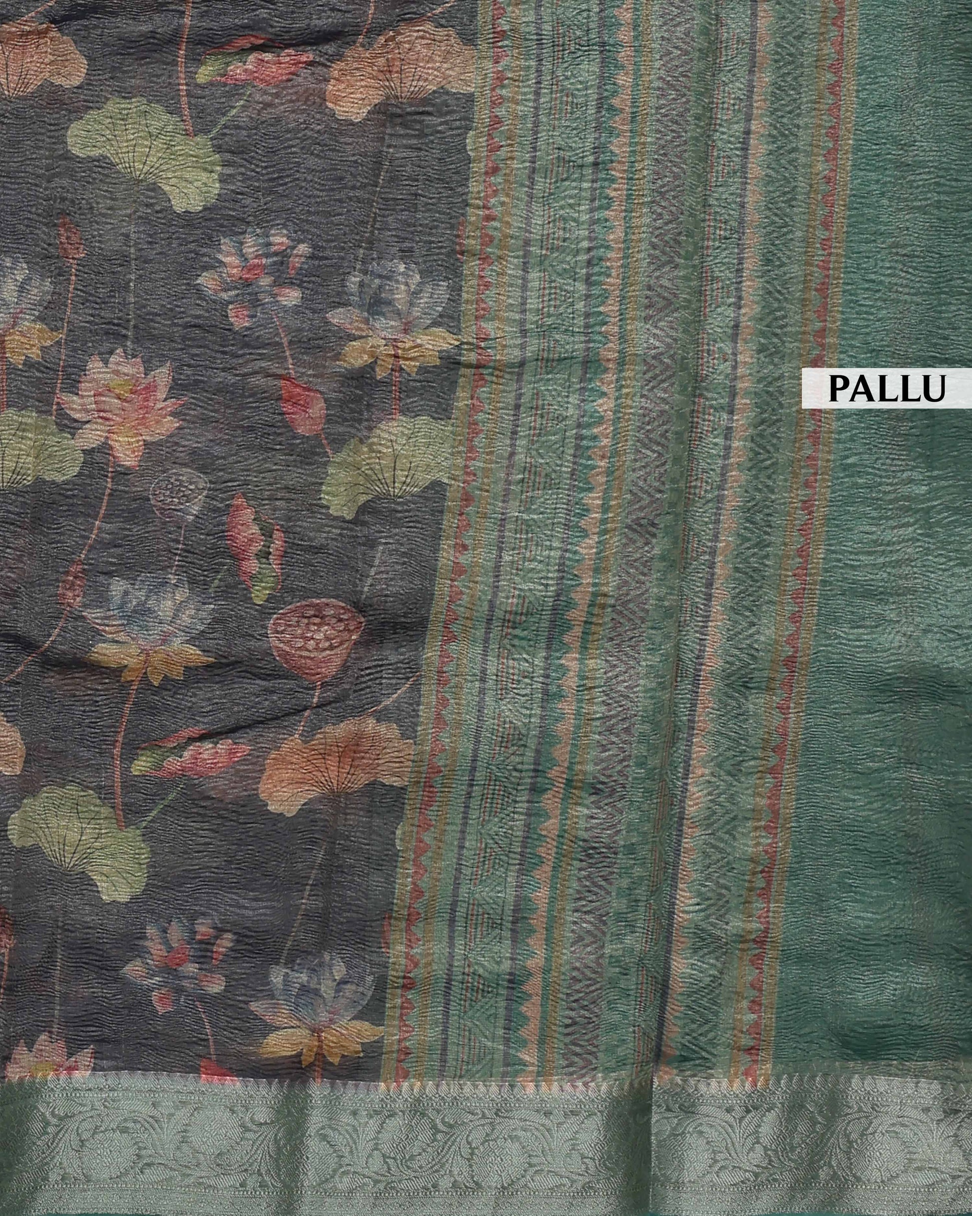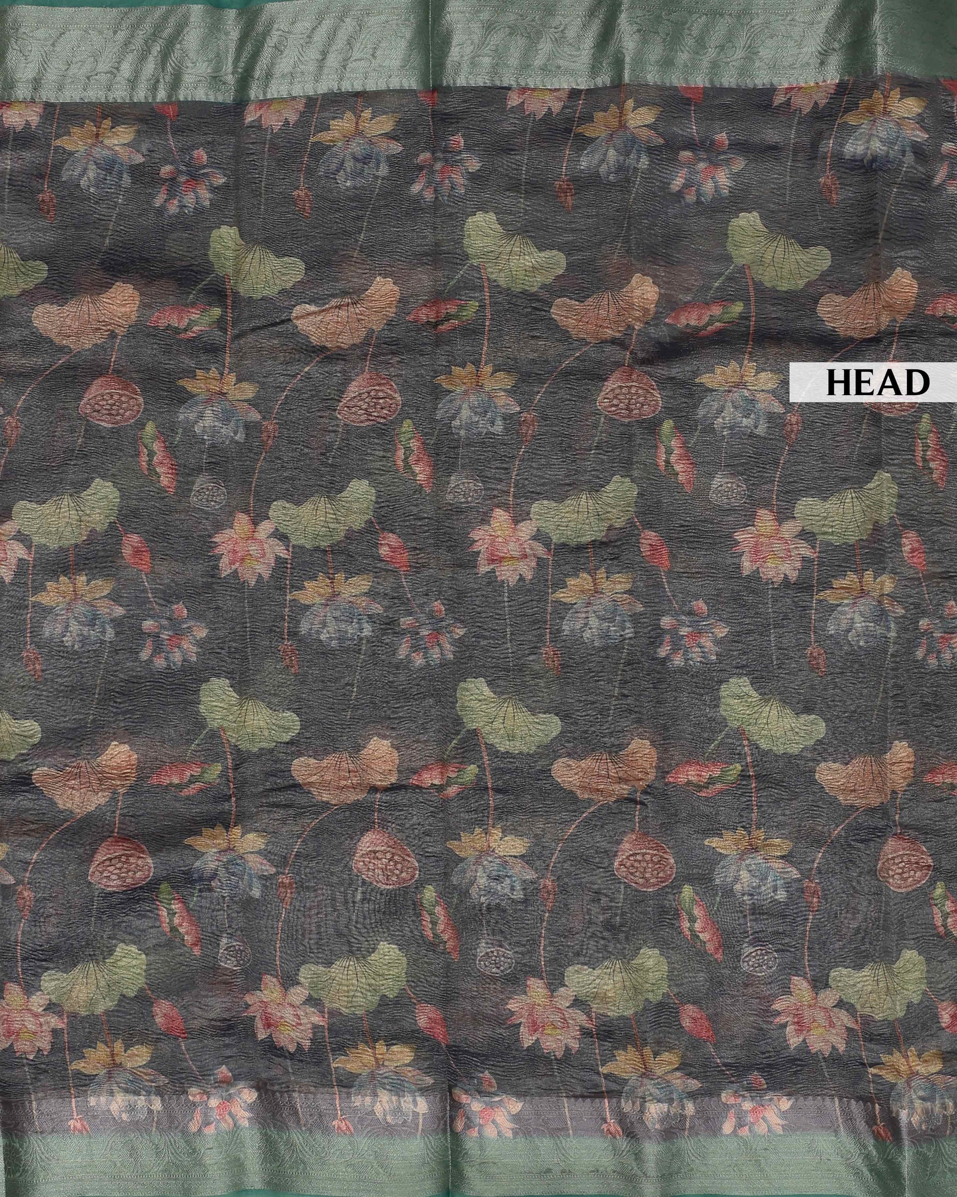 Elevate your ethnic wardrobe with this stunning dark-toned tissue saree, featuring a captivating print of lotus flowers and leaves. -