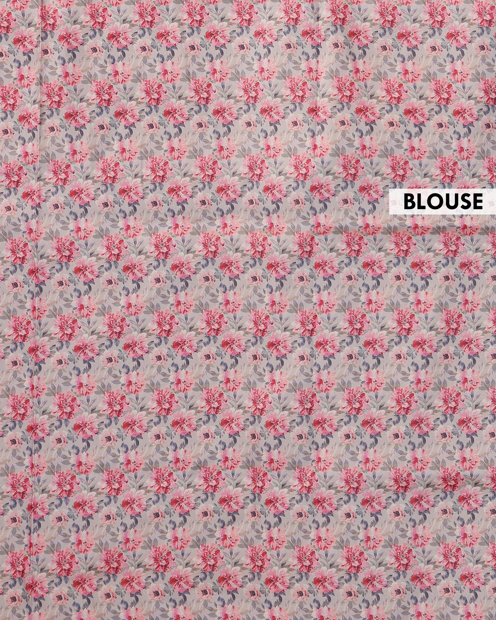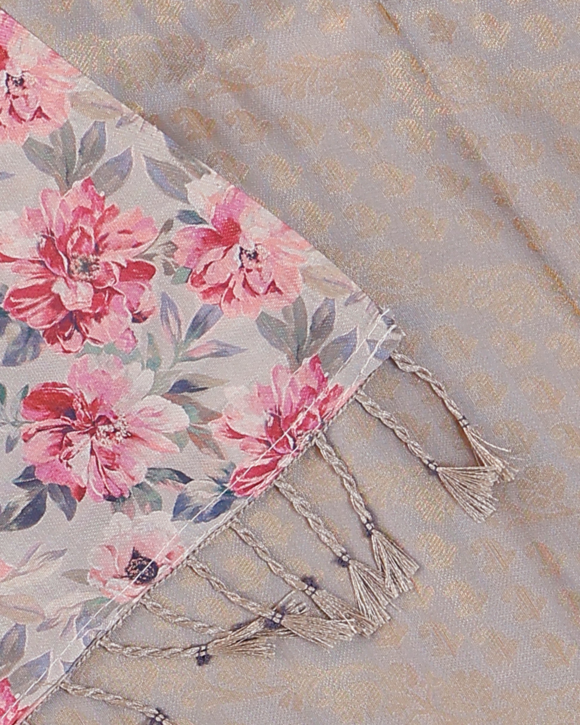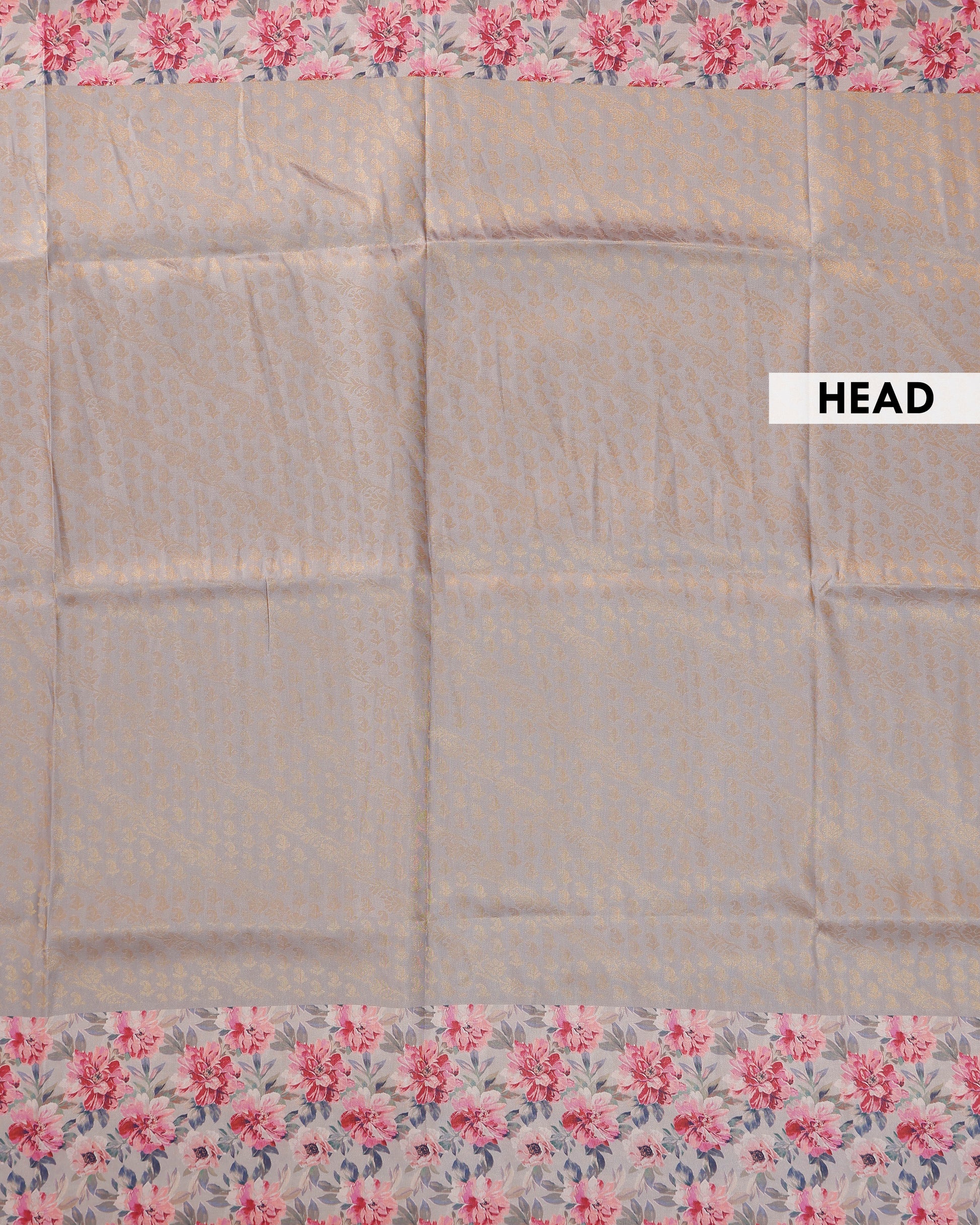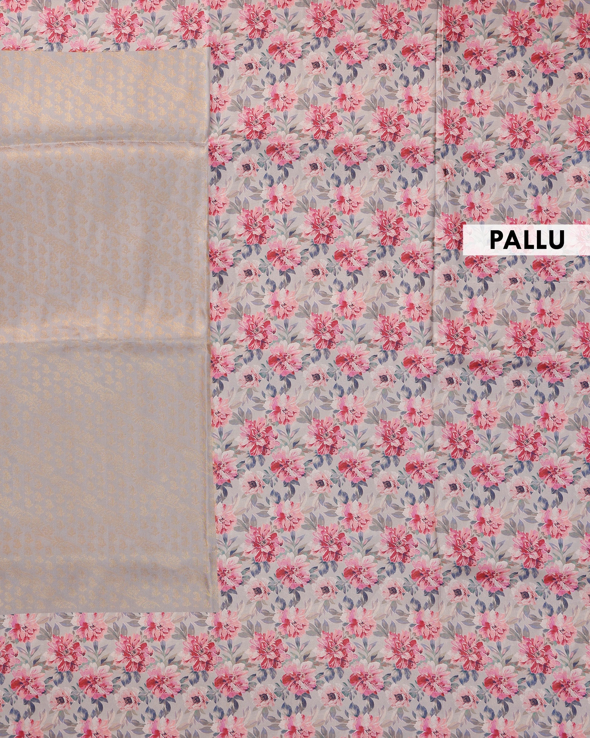 Solid Soft Silk Saree With Floral Printed Blouse - Beige