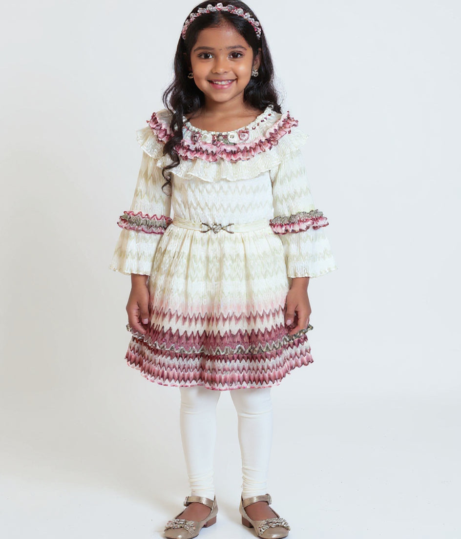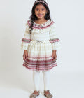 Girls' Tiered Ruffle Western Wear Dress with Embroidered Yoke & Bell Sleeves - Cream