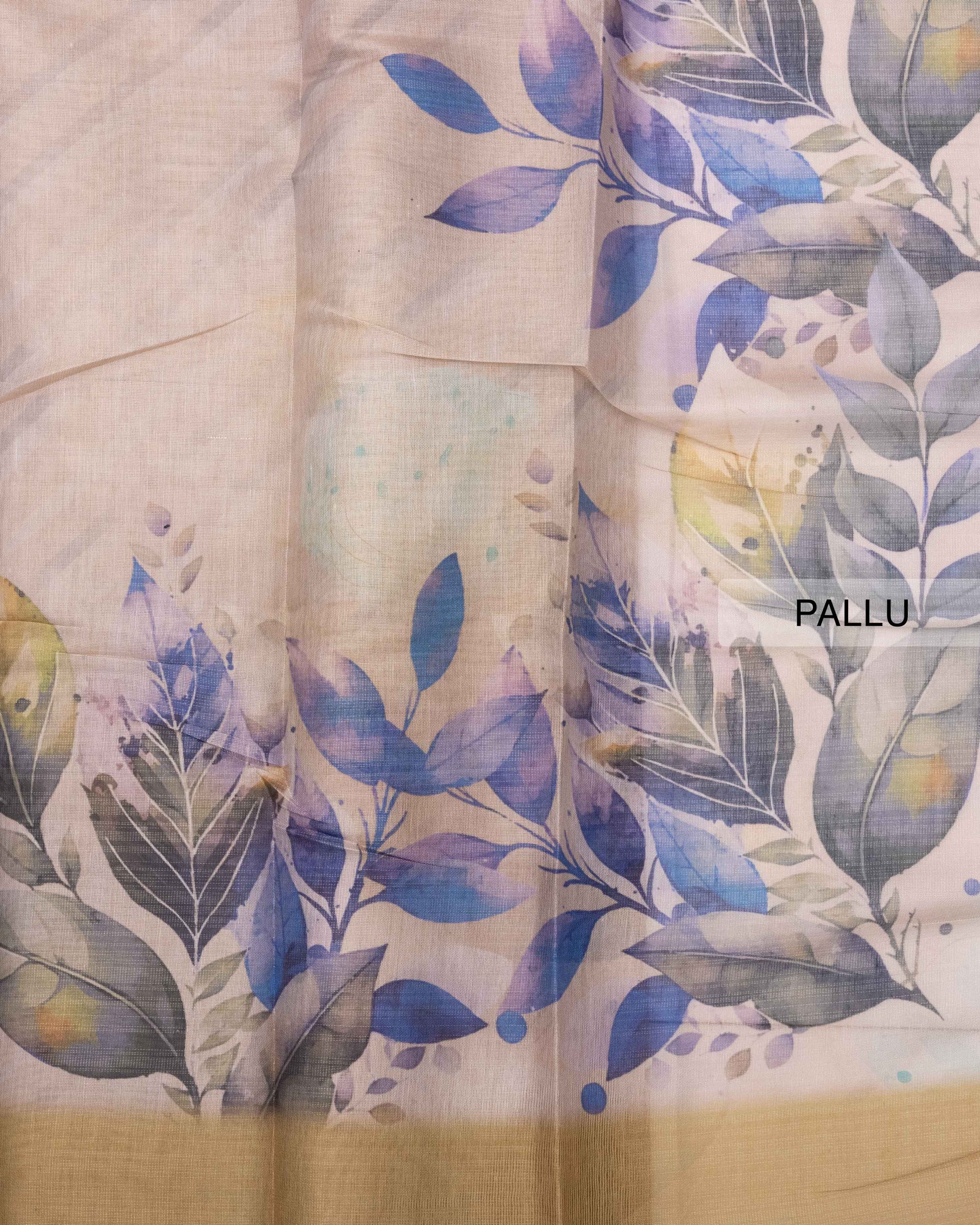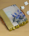 - Elevate your style with this elegant tissue saree, a beautiful floral print in shades of blue and green