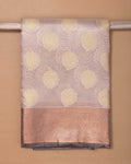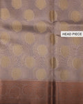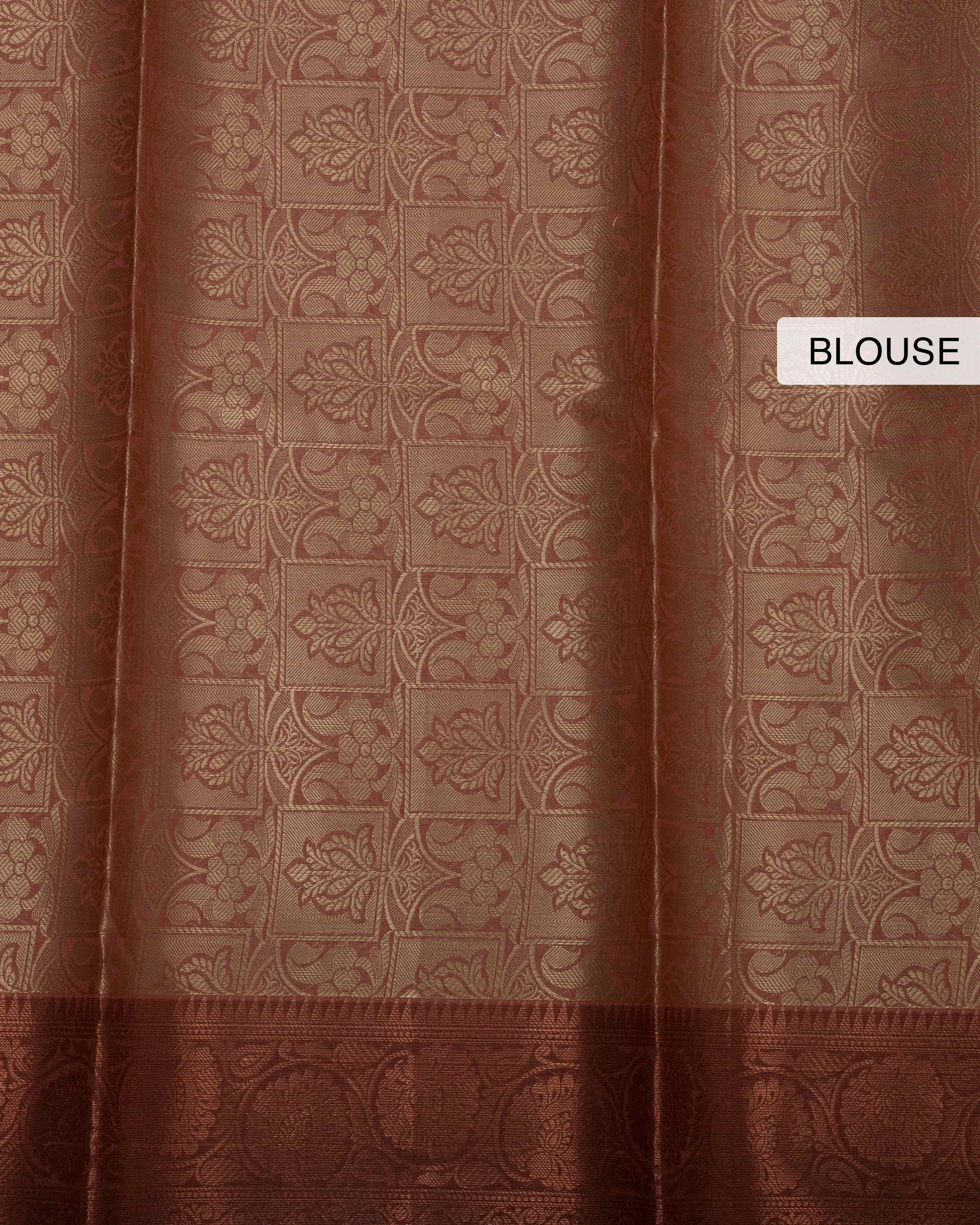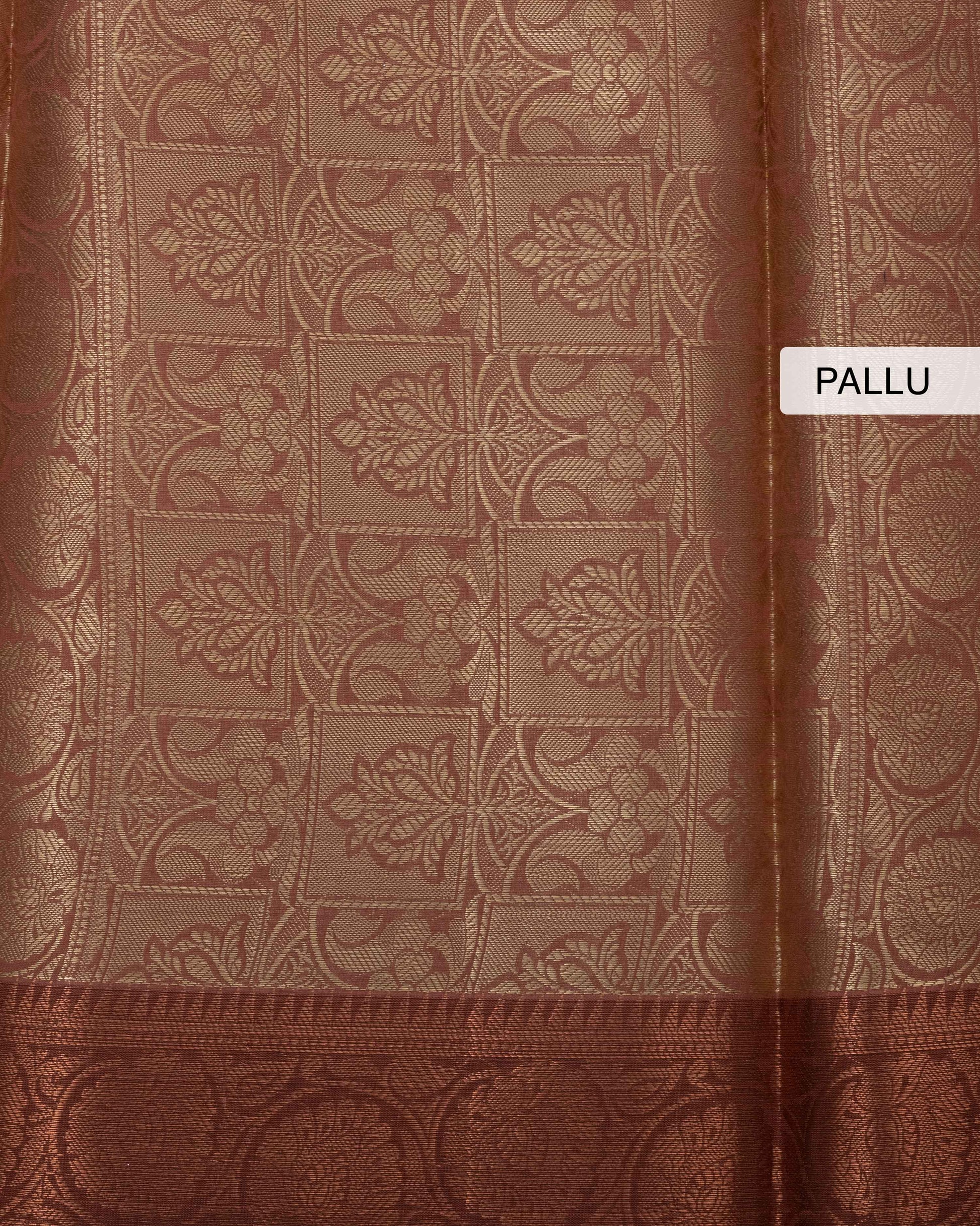 The rich, contrasting rose-gold zari border and pallu add a touch of timeless sophistication, making it perfect for festive occasions.