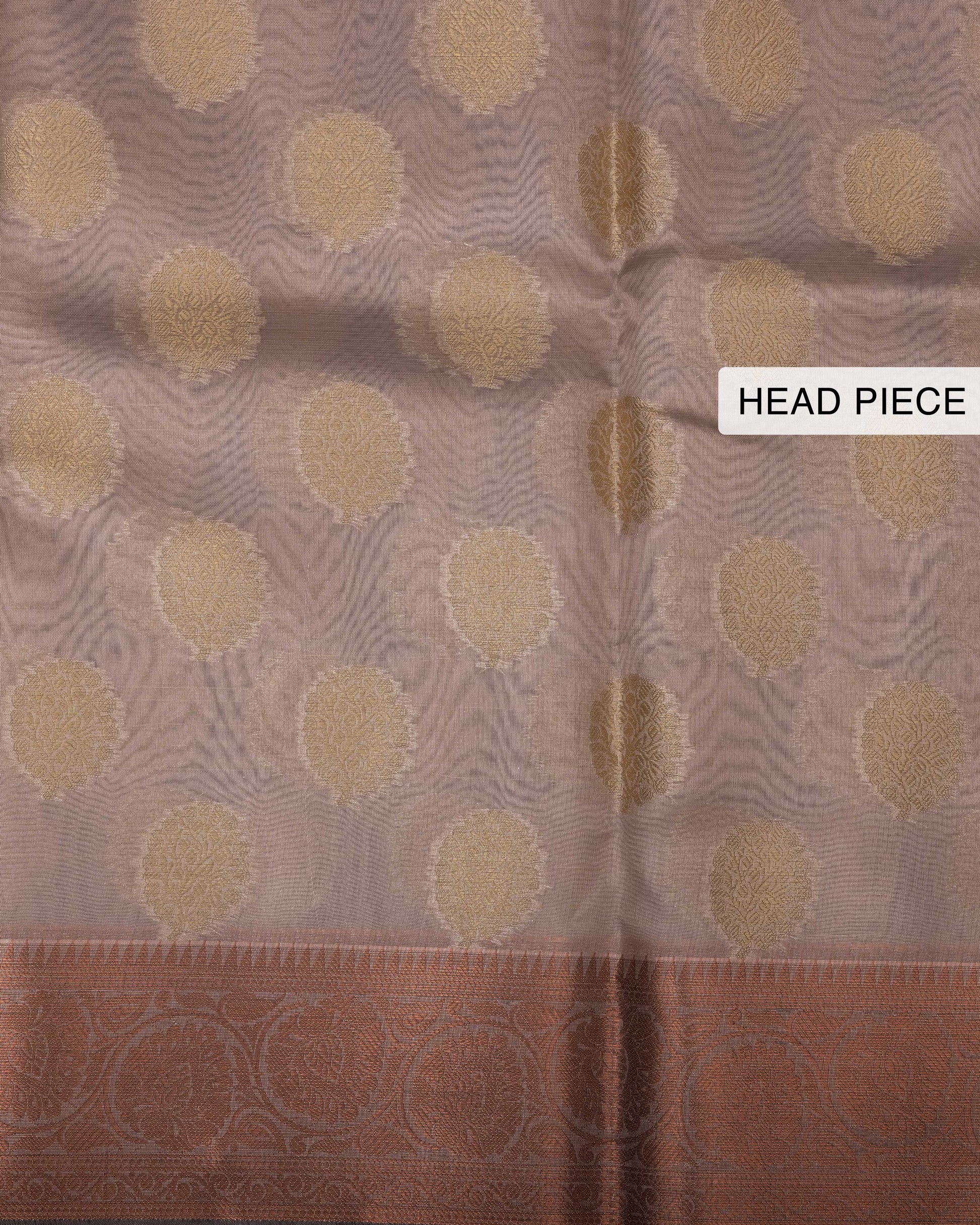 - This elegant tissue silk saree a delicate body adorned with shimmering gold zari polka dot motifs.