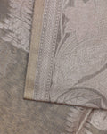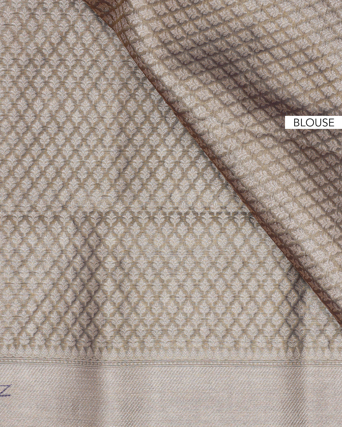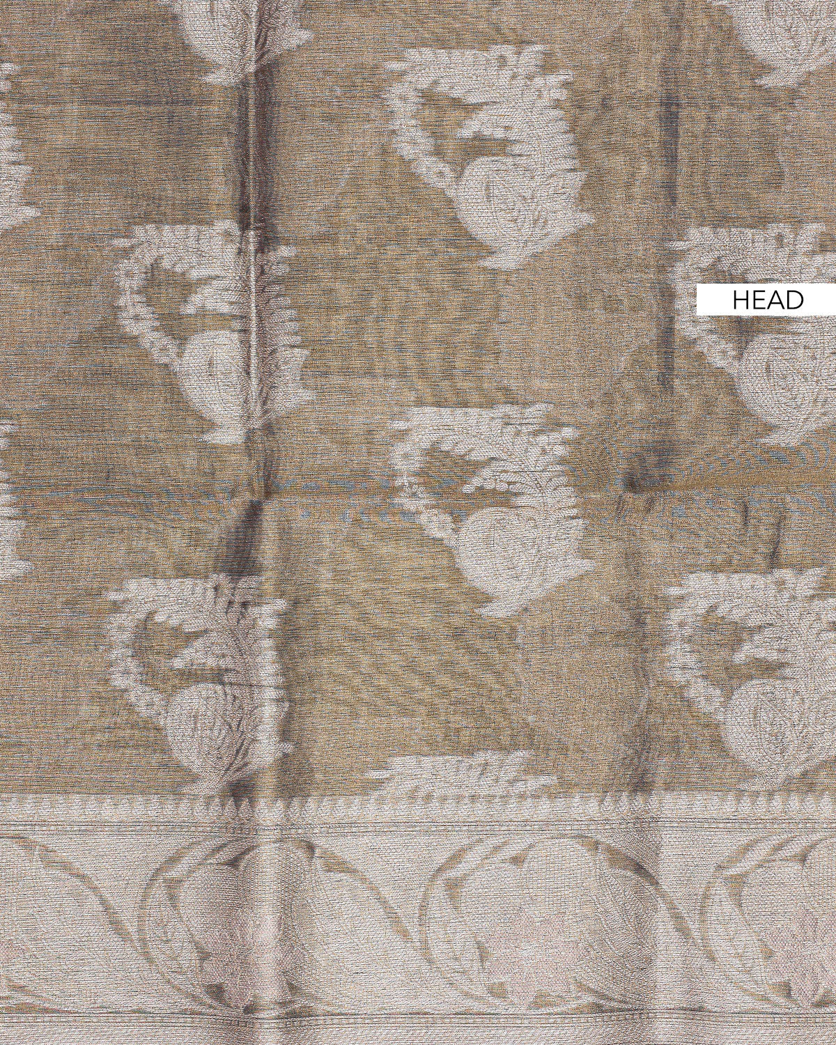 - This elegant tissue silk saree features a subtle grey body with intricate woven floral and vine motifs, creating a graceful and timeless look