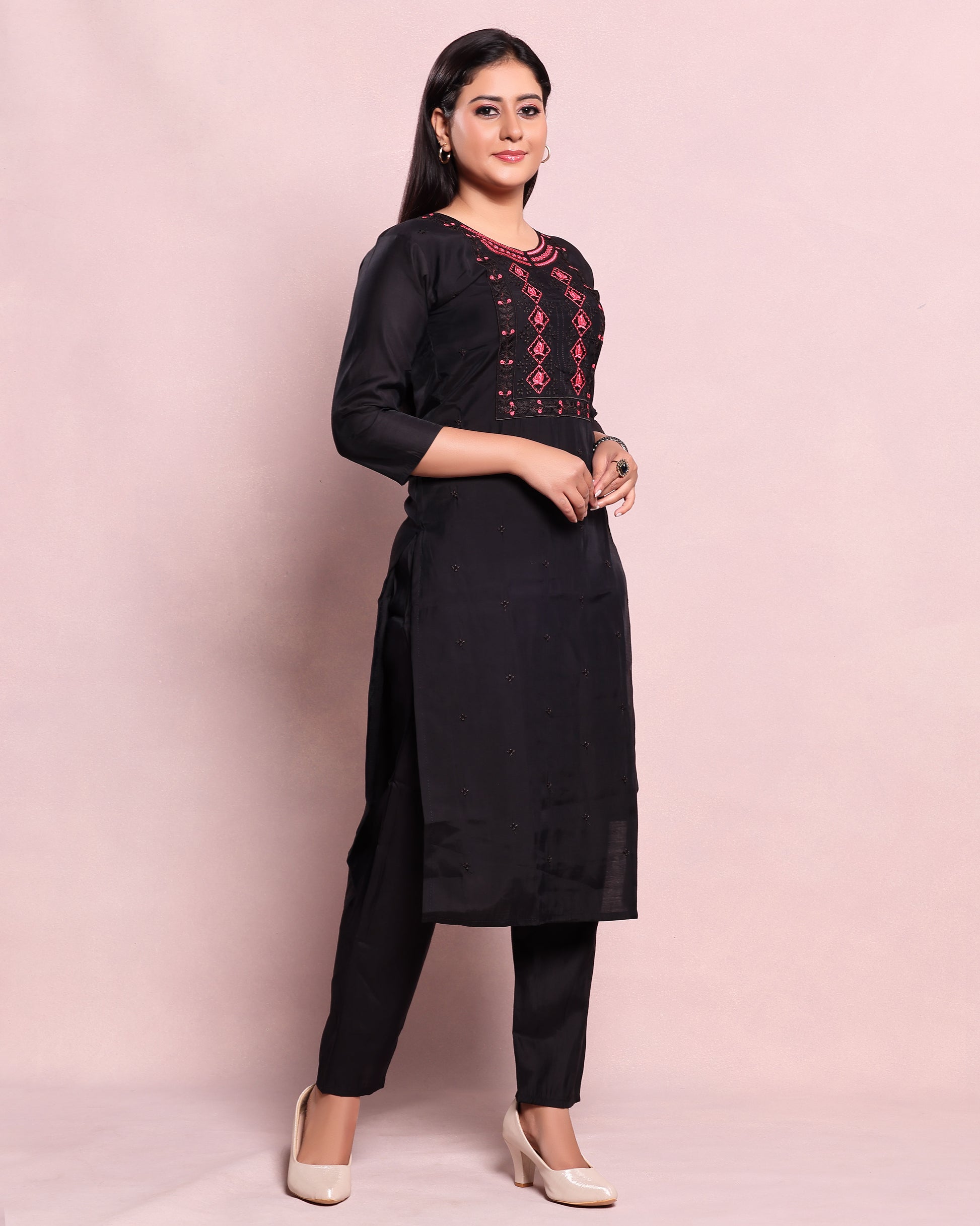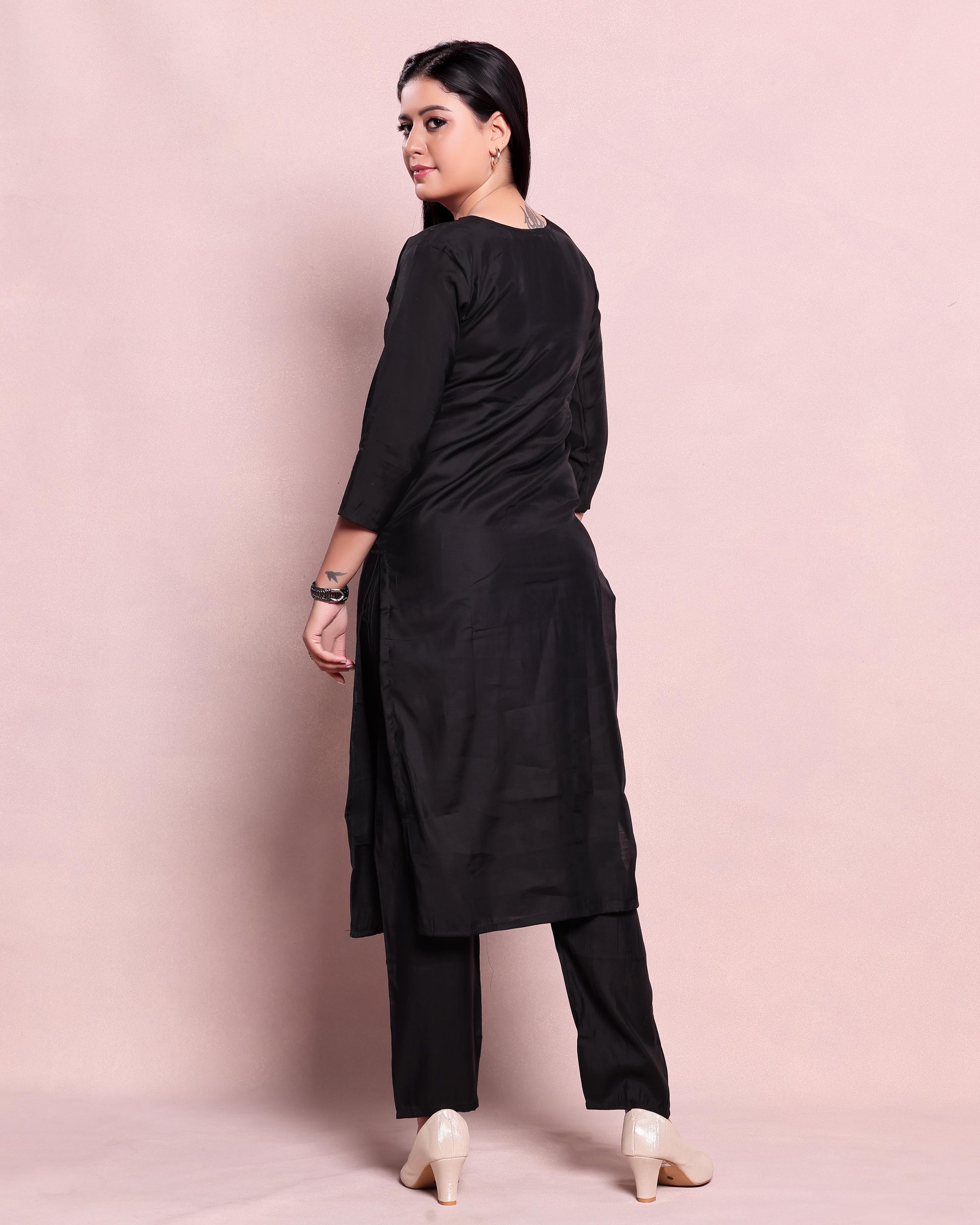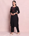 - Elevate your ethnic wardrobe with this stylish black straight fit kurta and palazzo set intricate ethnic motifs and thread embroidery on the yoke