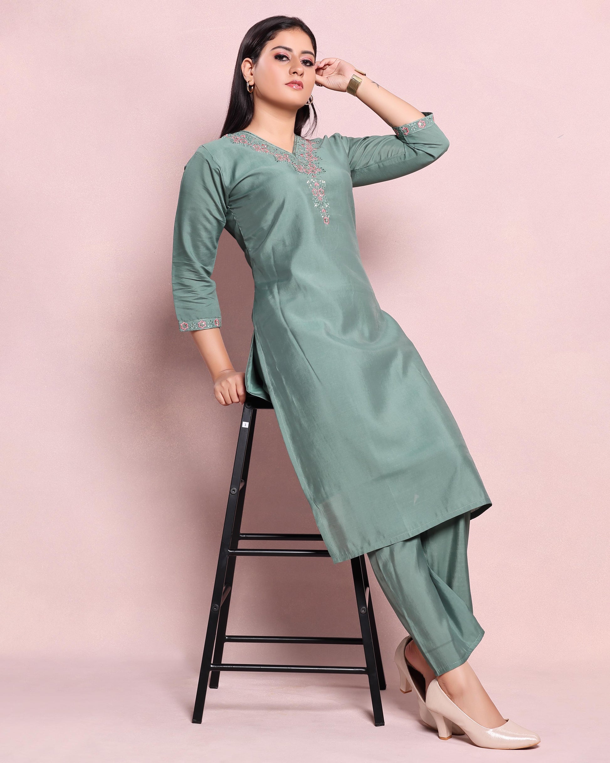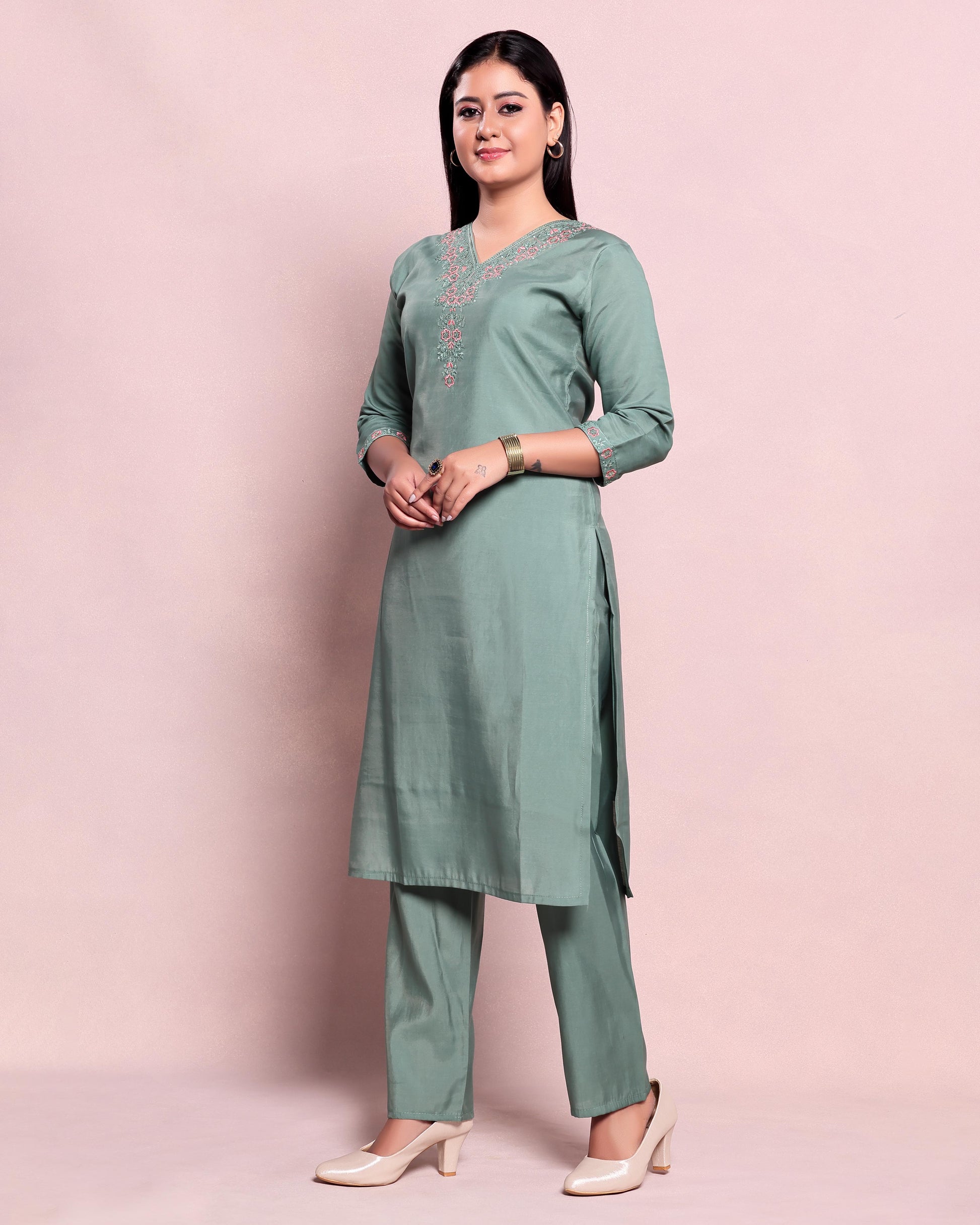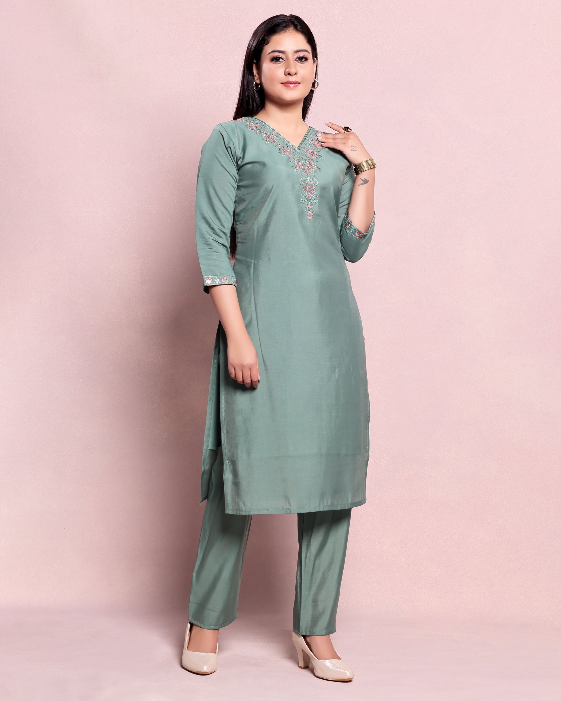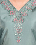 Elegant Women's Embroidered V-Neck Straight Kurta - Green
