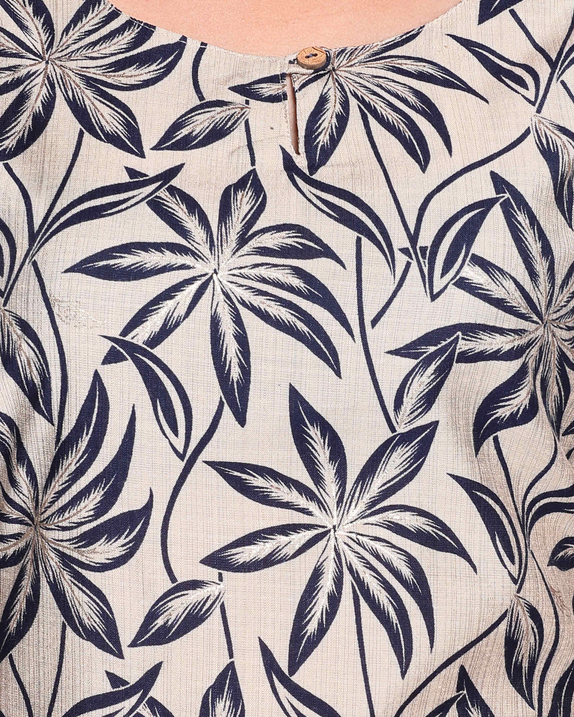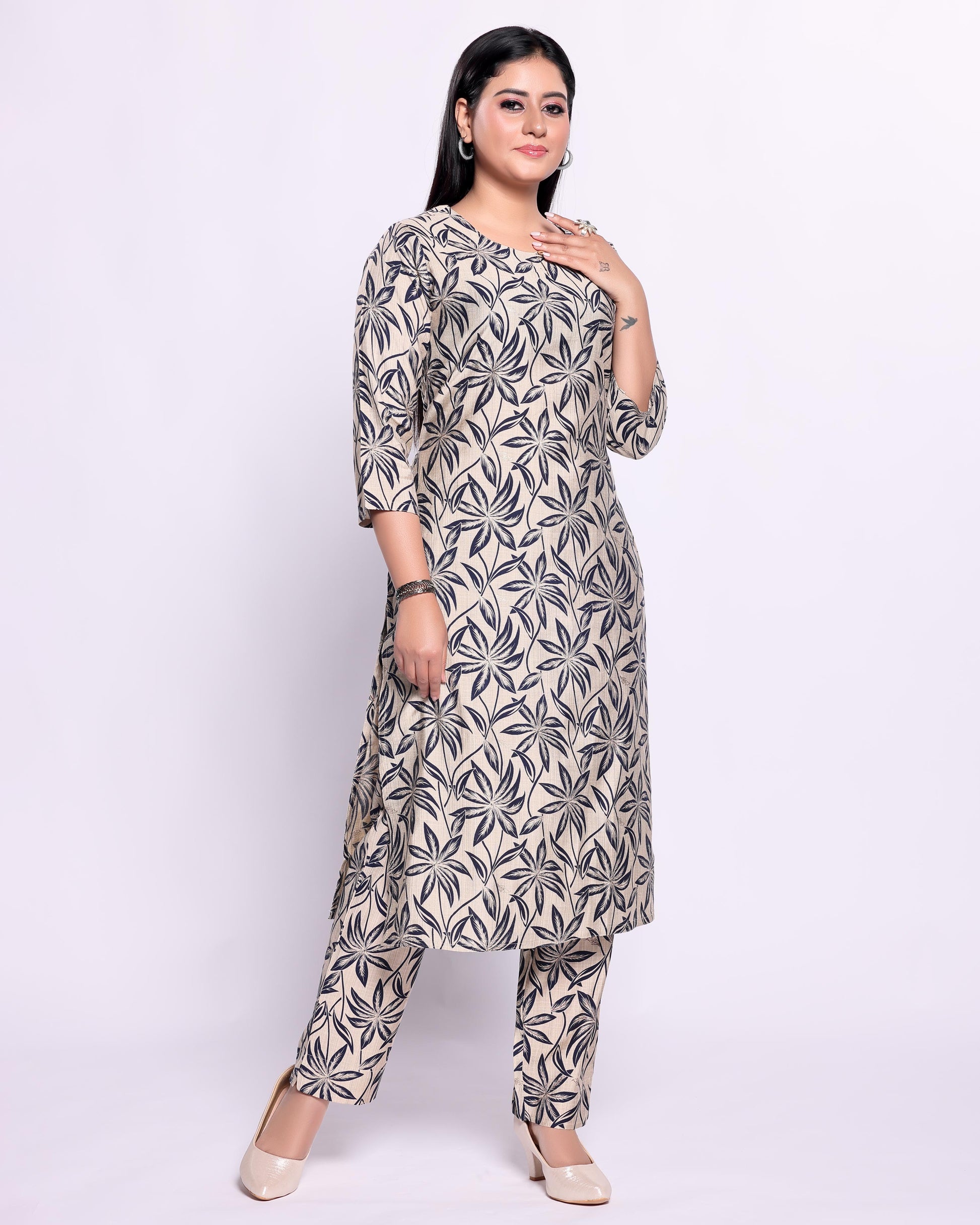 - Elevate your ethnic wardrobe with this elegant beige and blue floral print kurta and palazzo set.