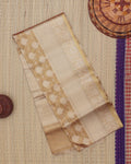 - This elegant tissue silk saree features a stunning beige body with intricate gold zari brocade and floral motifs