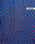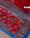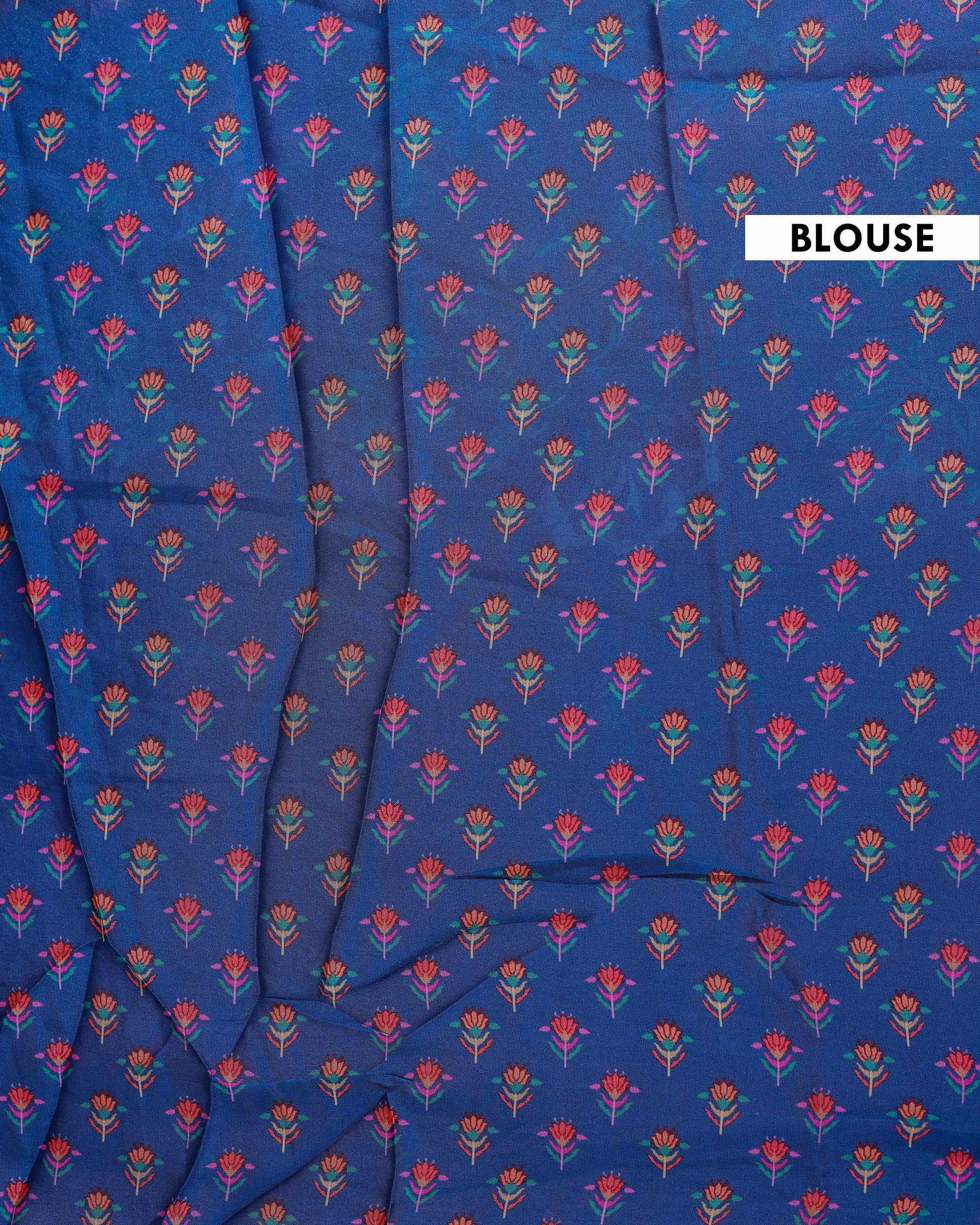 - Elevate your style with this stunning red Georgette saree a vibrant floral print and an intricately woven traditional blue border