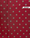 The saree a traditional-style print of a royal procession with elephants and other figures, complemented by an intricately woven border.
