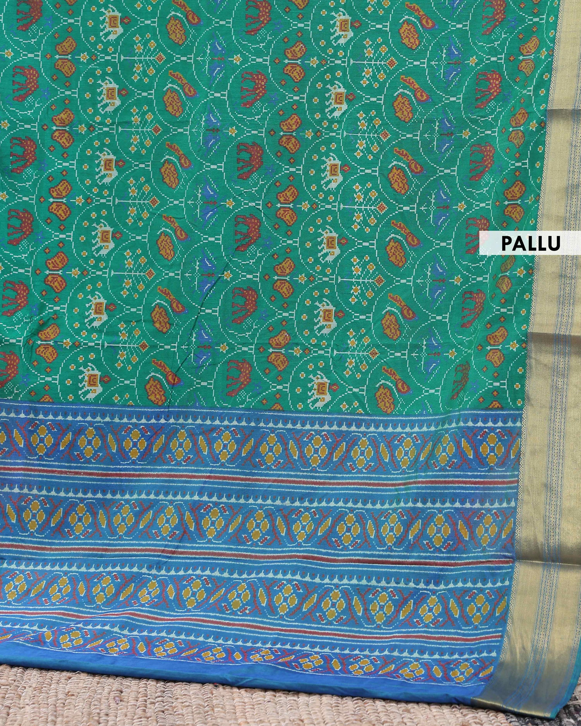 - This exquisite Patola silk saree a vibrant green body adorned with intricate traditional motifs, complemented by a striking blue border