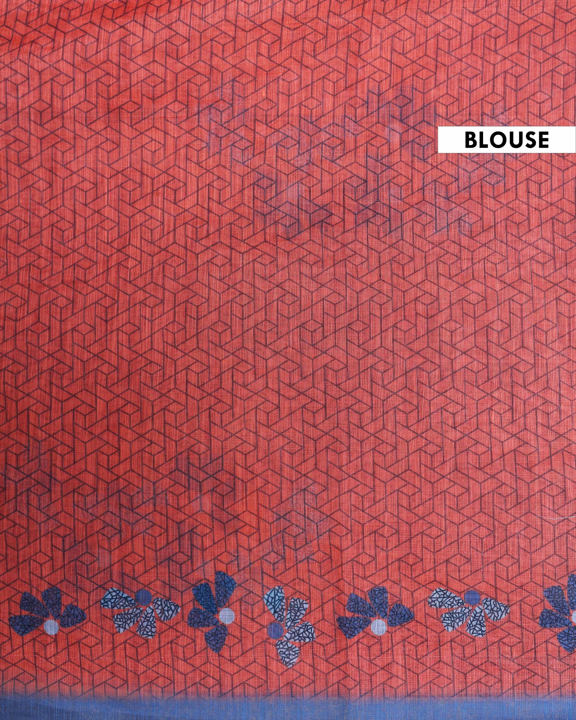 - This is a dual tone blue and rust linen saree with a floral printed pattern.