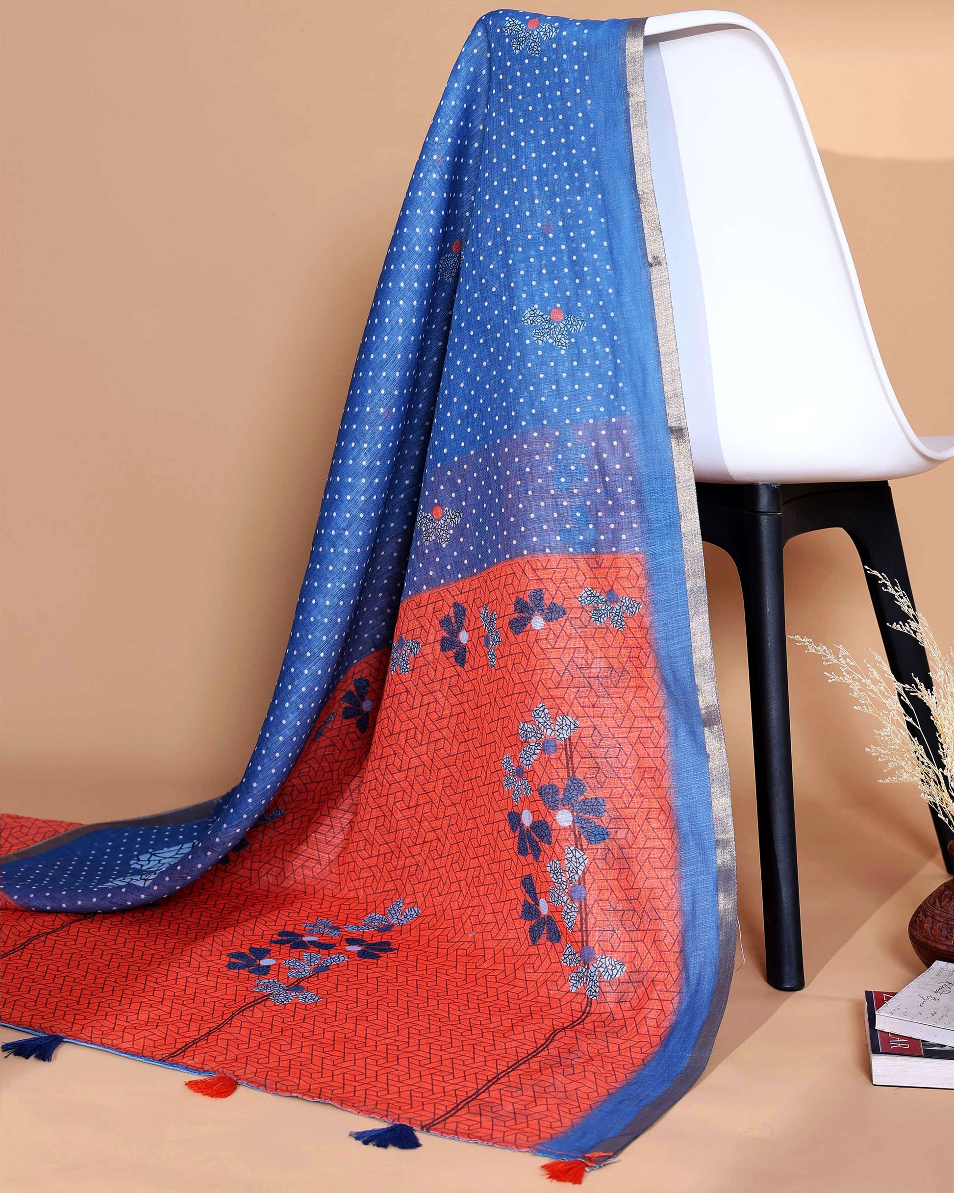Dual Tone Blue and Rust Linen Saree with White Polka Dots, Floral Printed Pattern and with Colourful Tassel Detailing