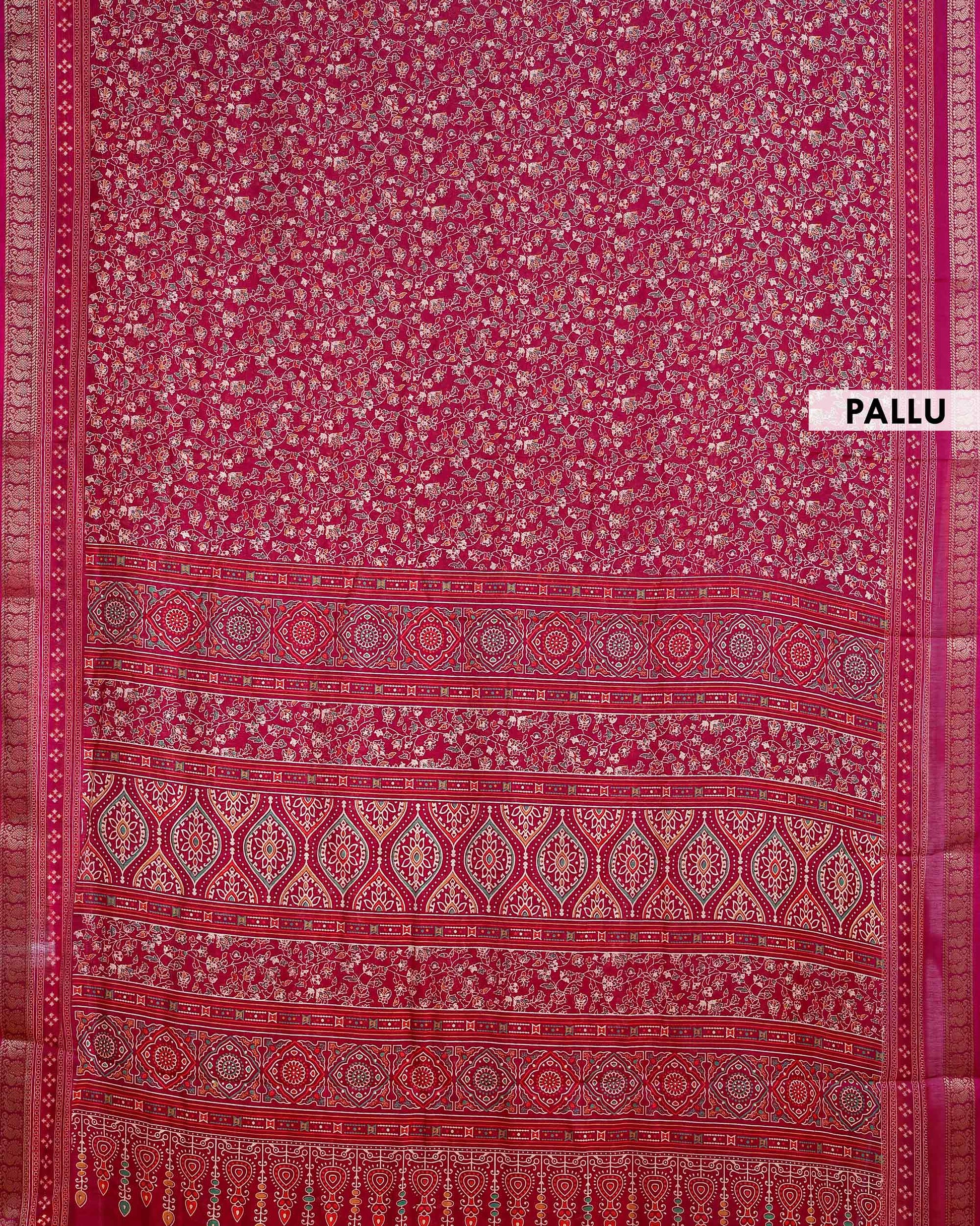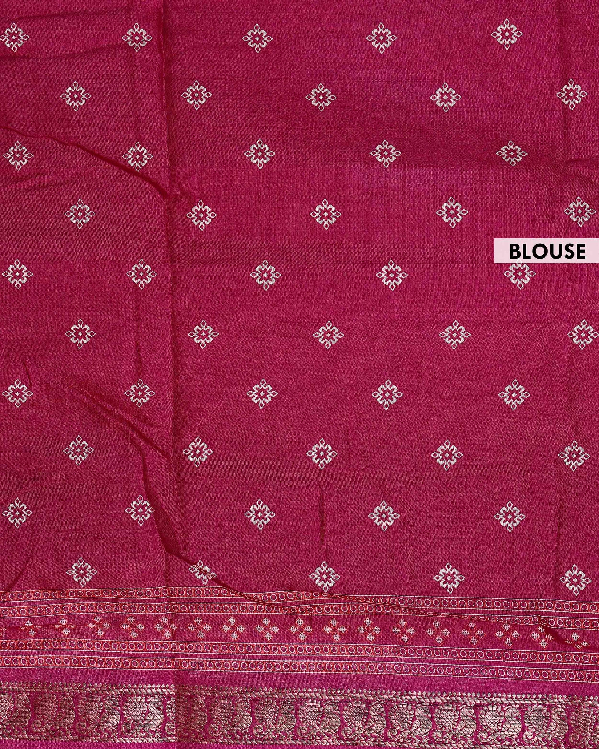 - Drape yourself in this stunning magenta art silk saree, featuring intricate traditional floral prints and a shimmering zari border that exudes timeless elegance