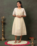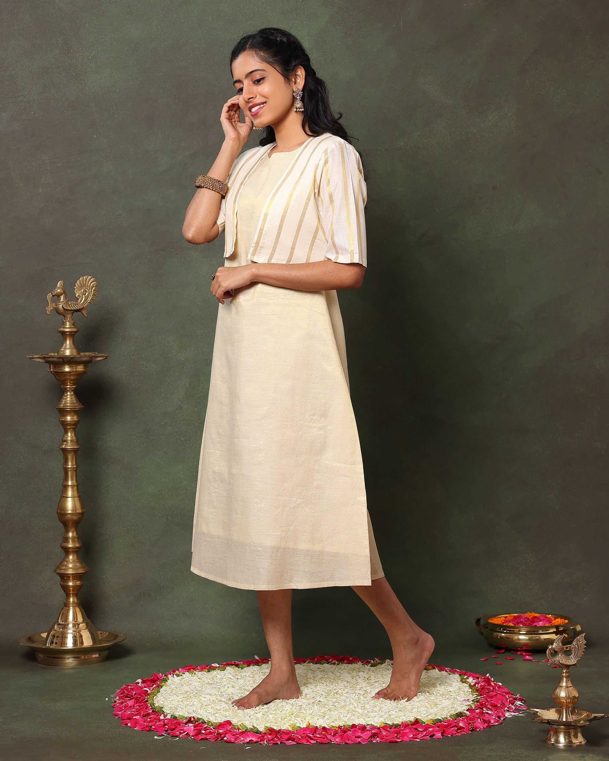 Elegant A-Line Dress with Striped Open Jacket With V-Neck Ethnic - Cream