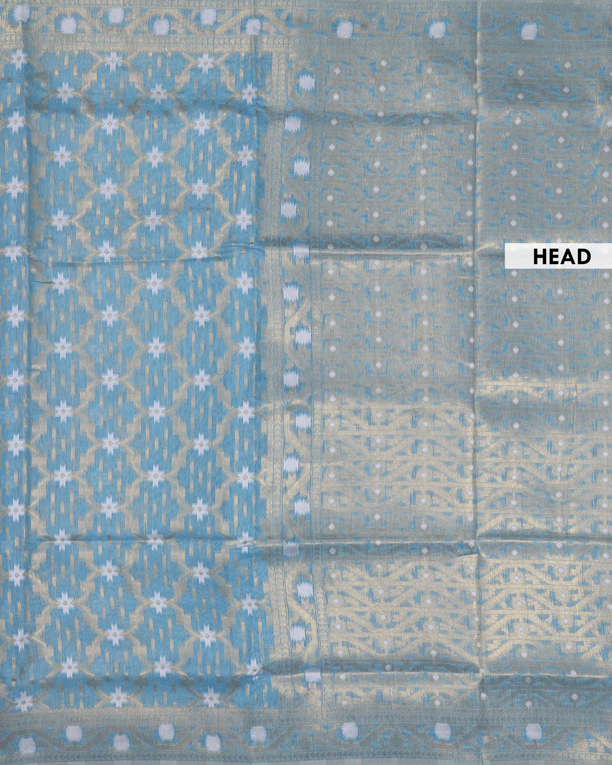 - This elegant art silk saree in a refreshing light blue hue features intricate woven floral patterns and subtle horizontal stripes