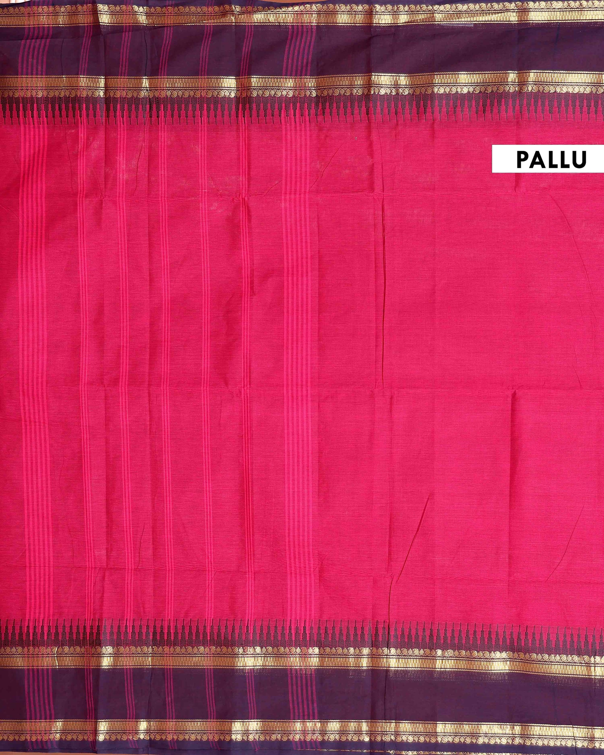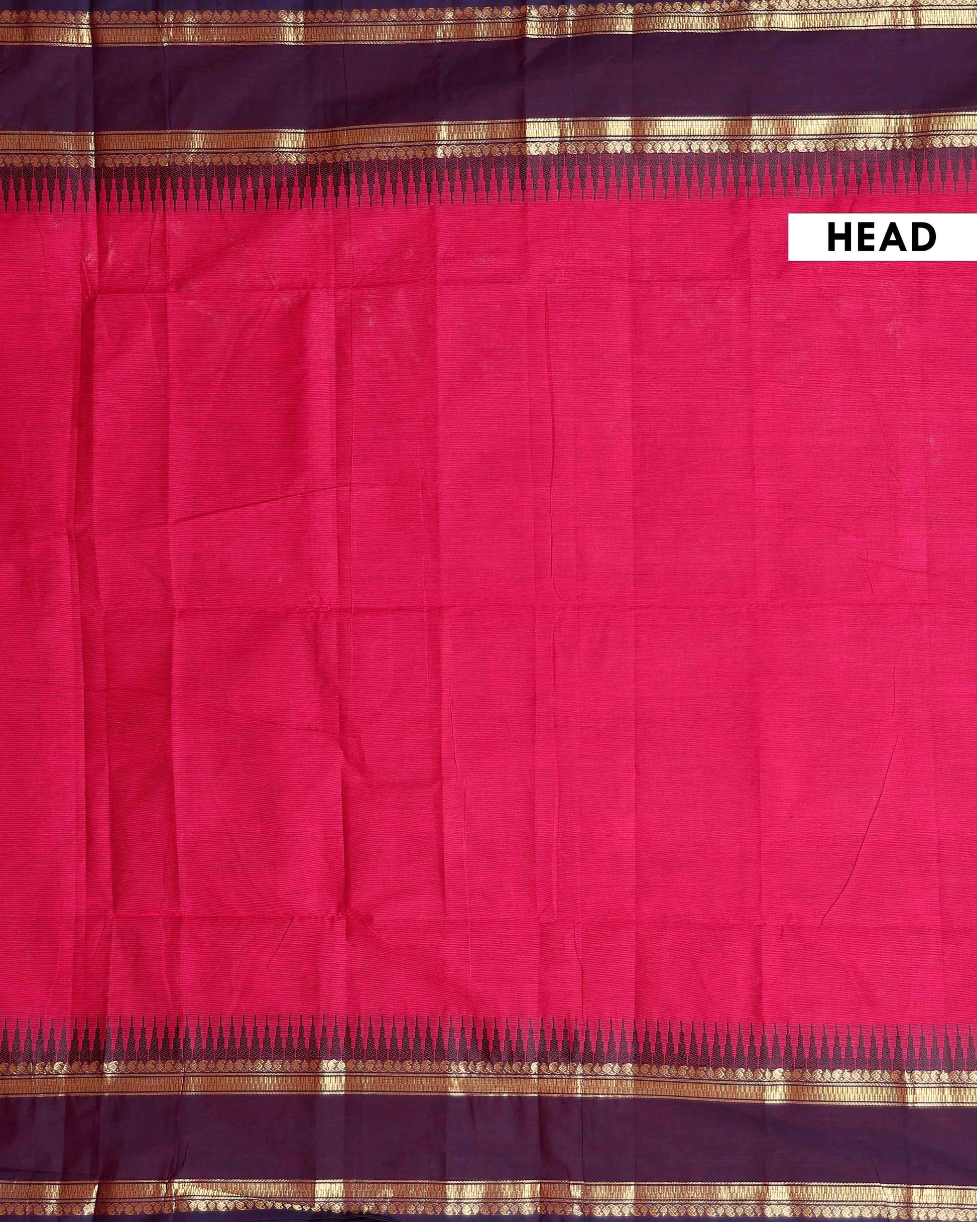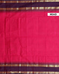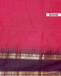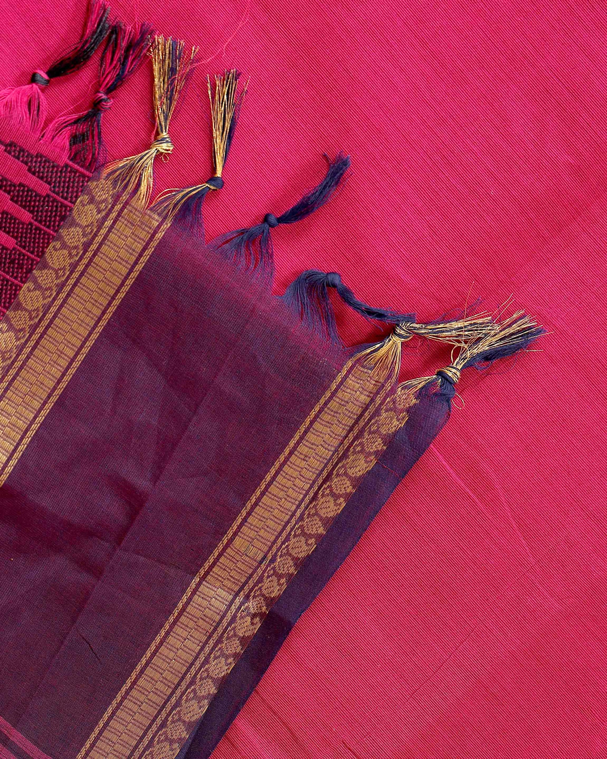 - Embrace tradition with this exquisite Kanchi cotton saree a vibrant pink body and a rich contrasting purple border adorned with traditional gold zari work.