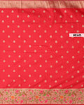 - This stunning red Banarasi silk saree intricate gold zari motifs and a vibrant, multi colored floral border, perfect for festive occasions or weddings
