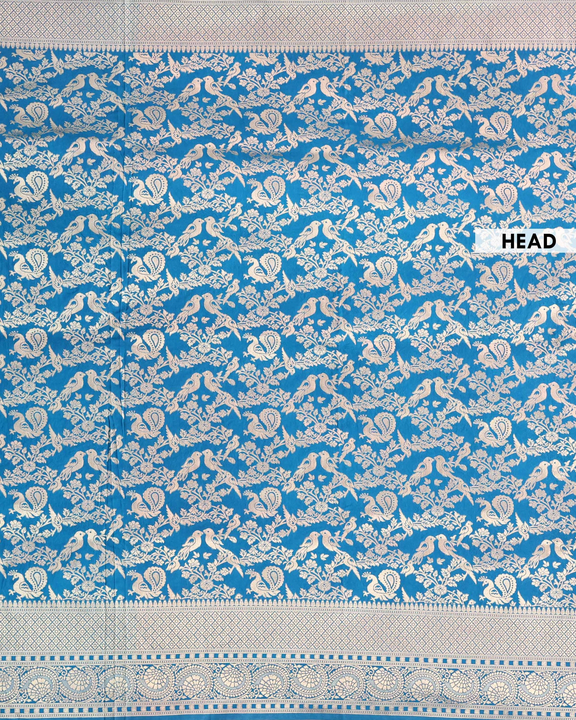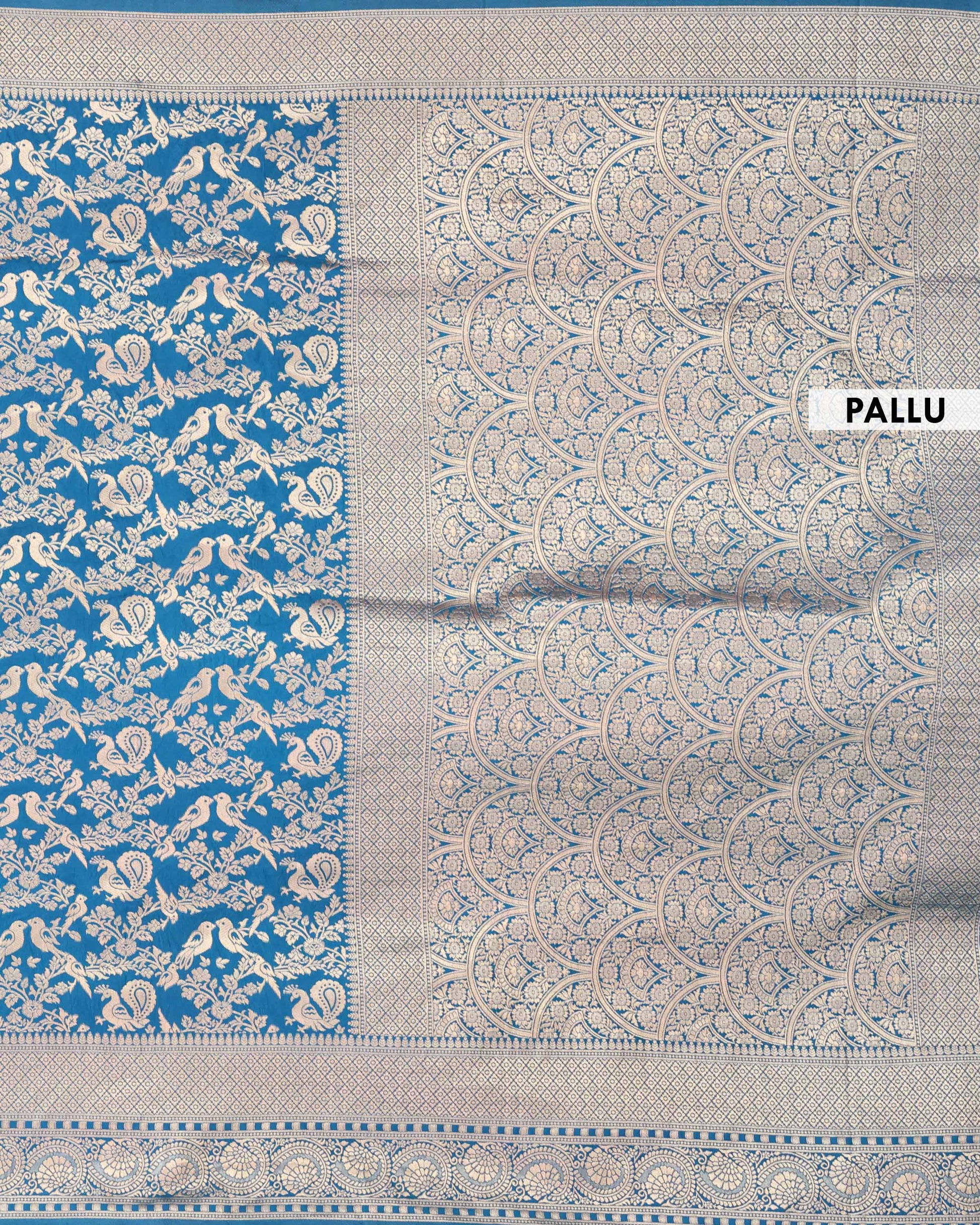 - An exquisite Peacock Blue Banarasi Semi Silk Saree intricate silver zari bird and floral Motif weaving.