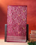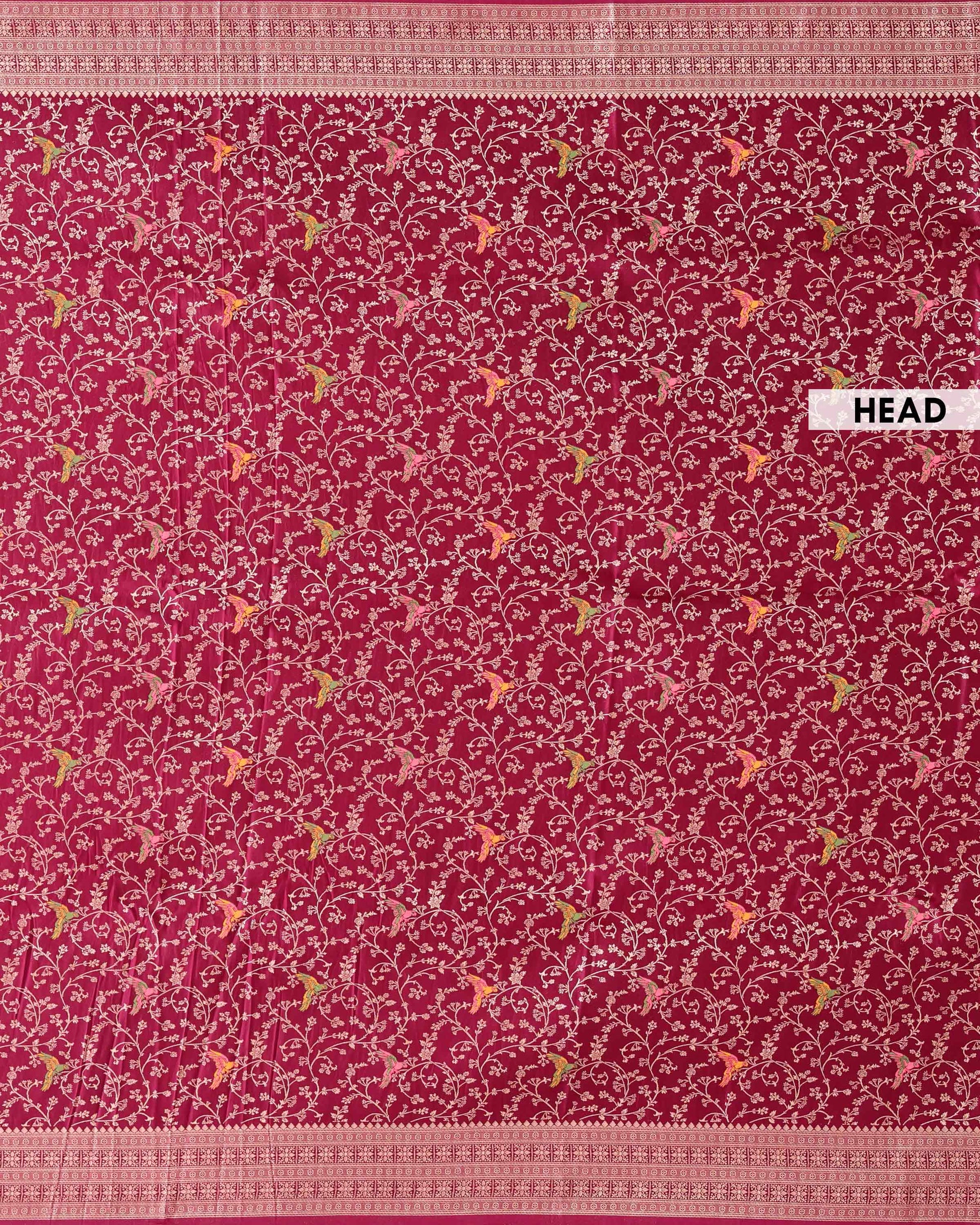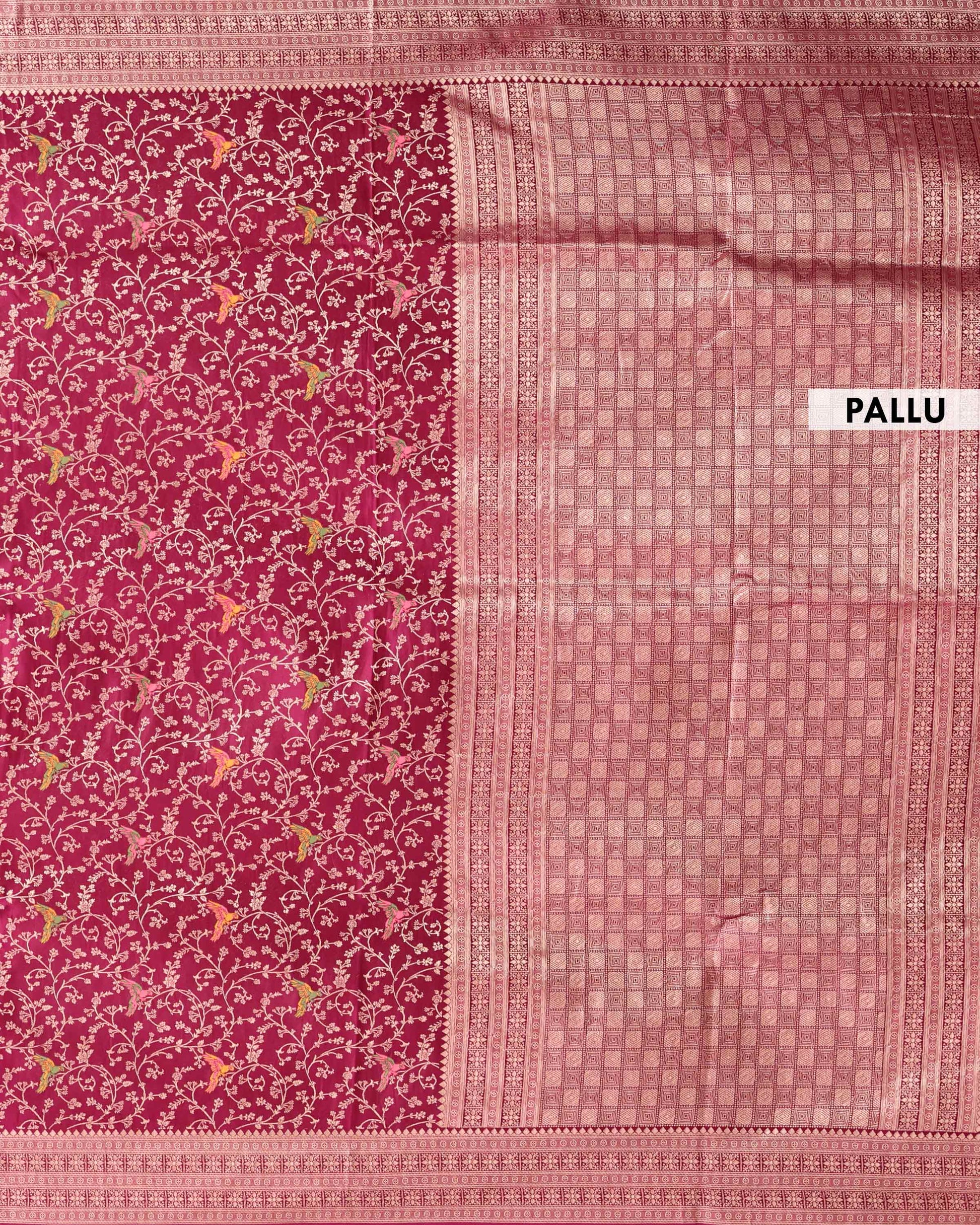 - This stunning Banarasi silk saree in a Burgundy intricate gold and silver zari weaving