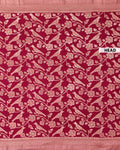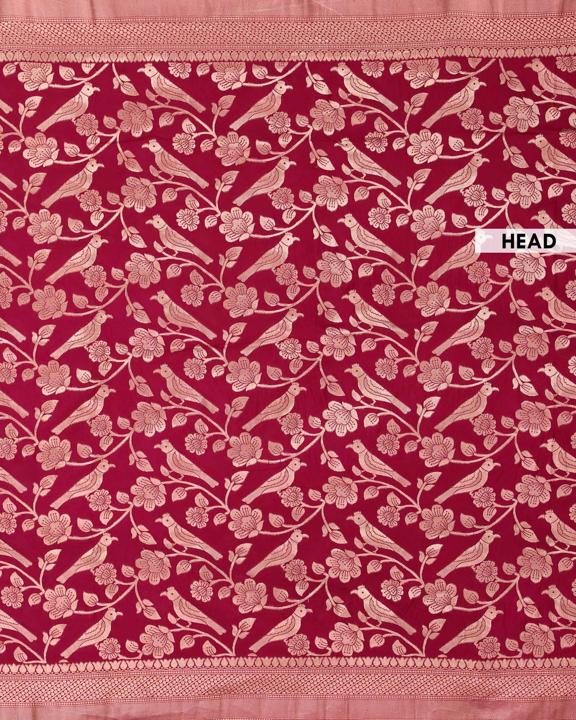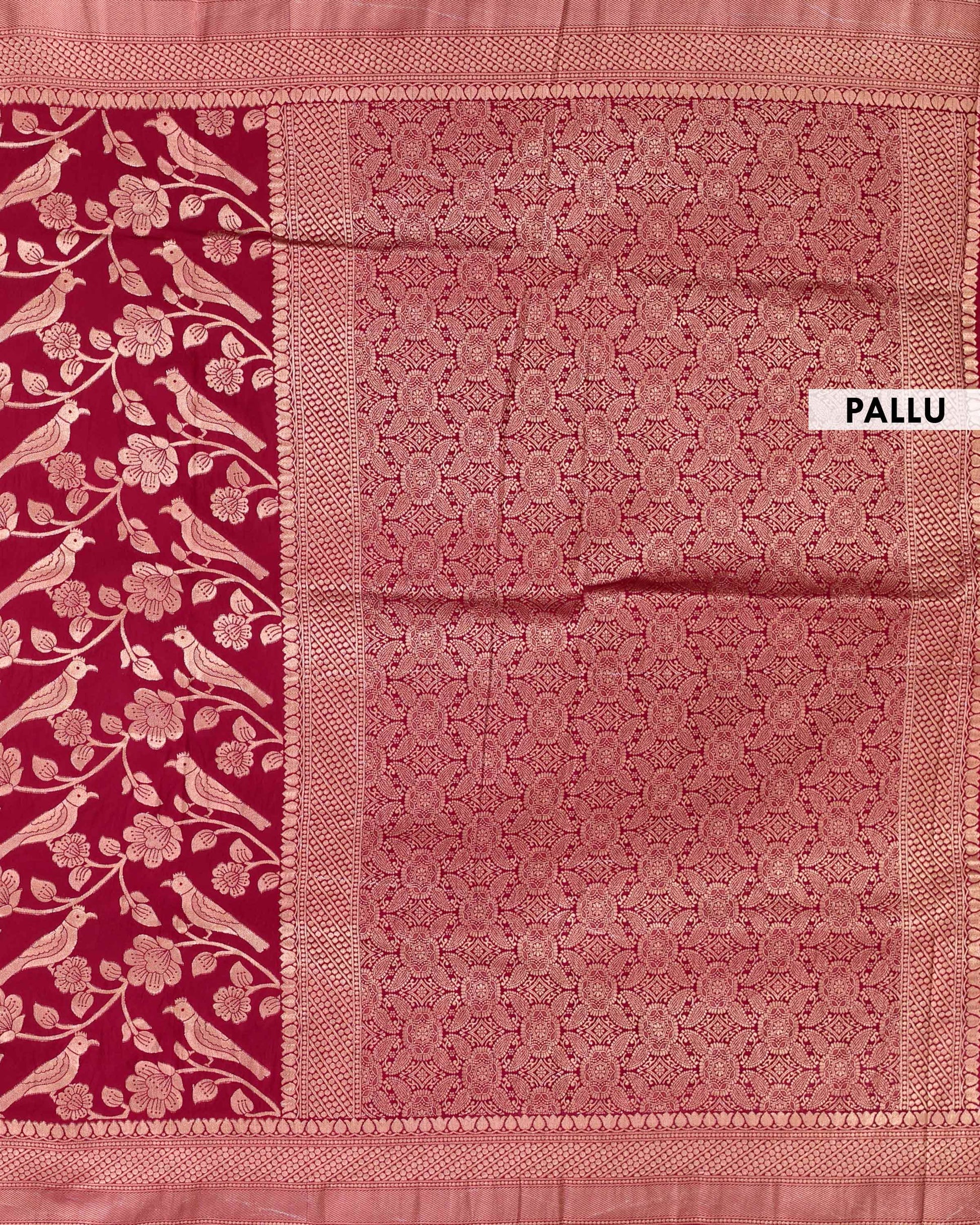 - This luxurious handwoven Banarasi silk saree in a rich Maroon intricate gold zari work with elegant floral and bird motifs.
