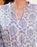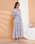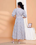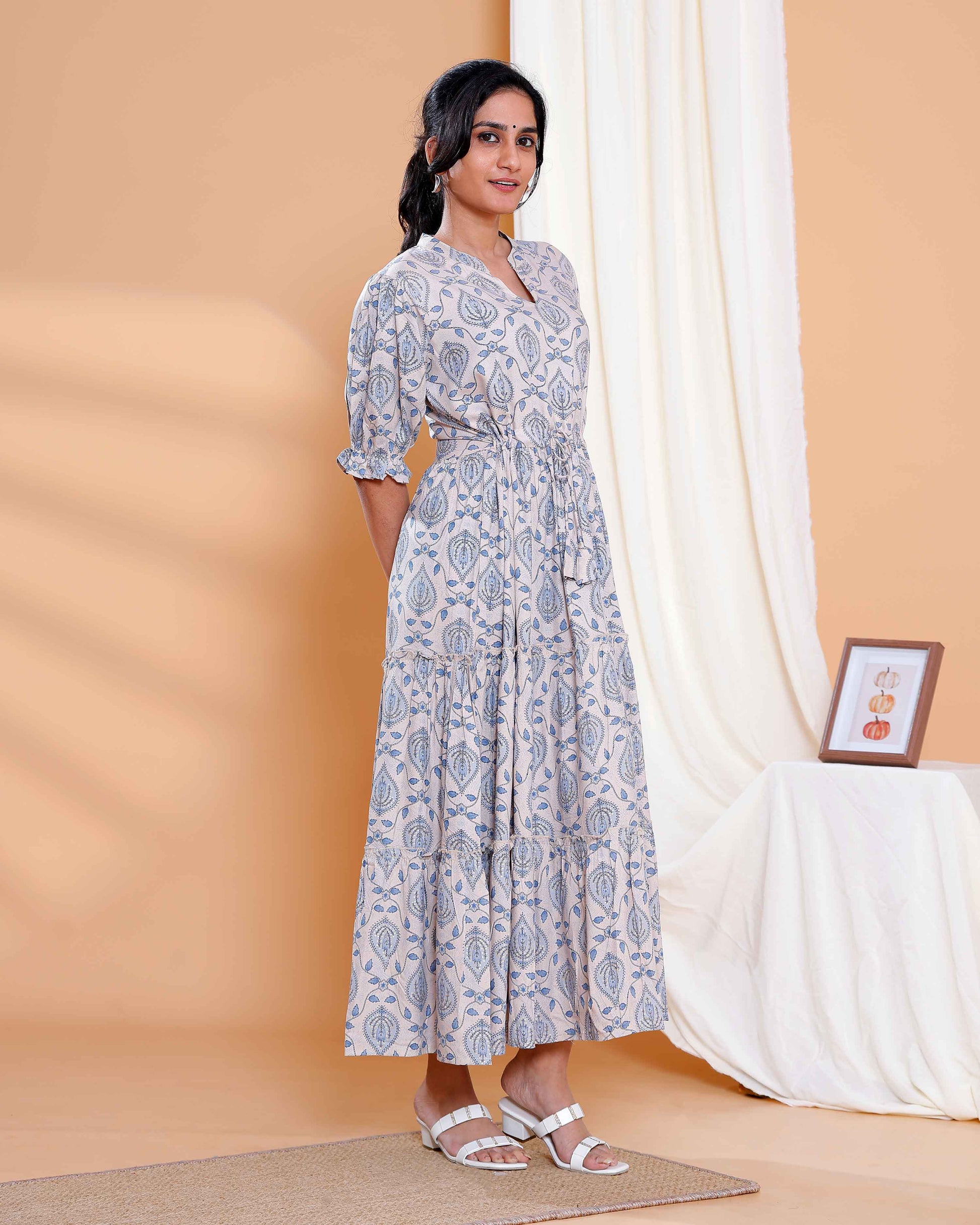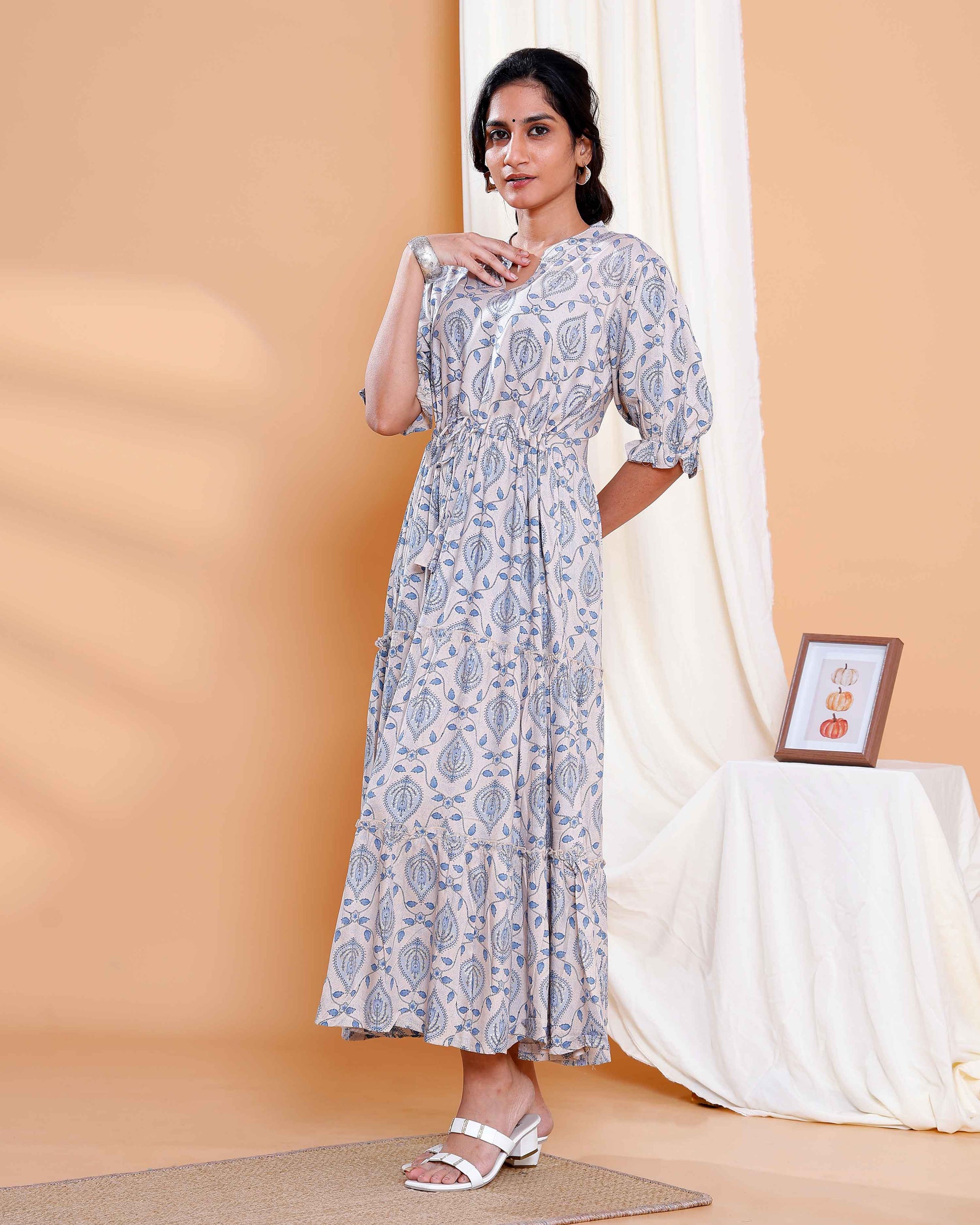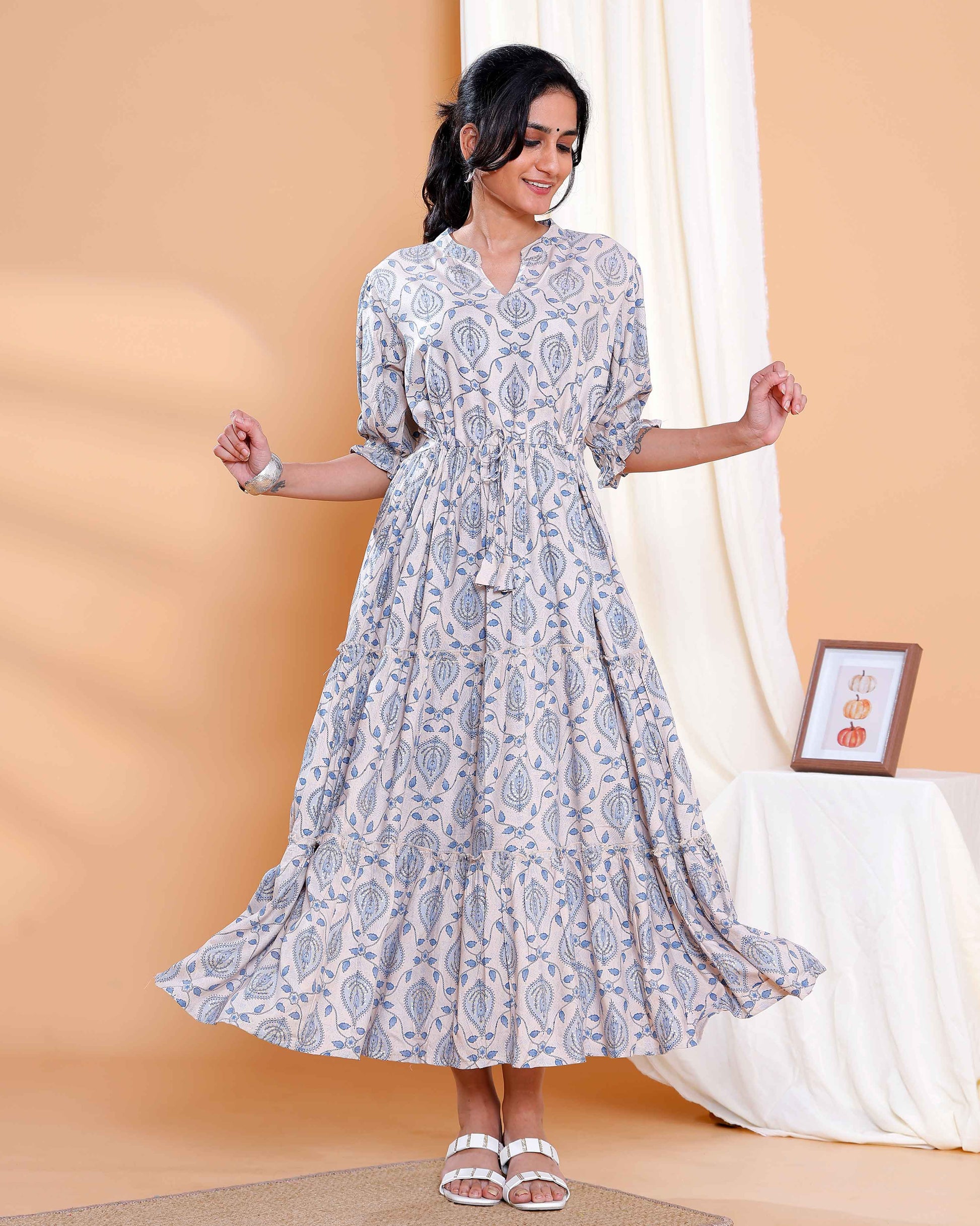 Elegant Beige Long Dress with Blue Leaf Motifs and Flared Hem