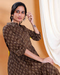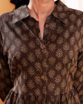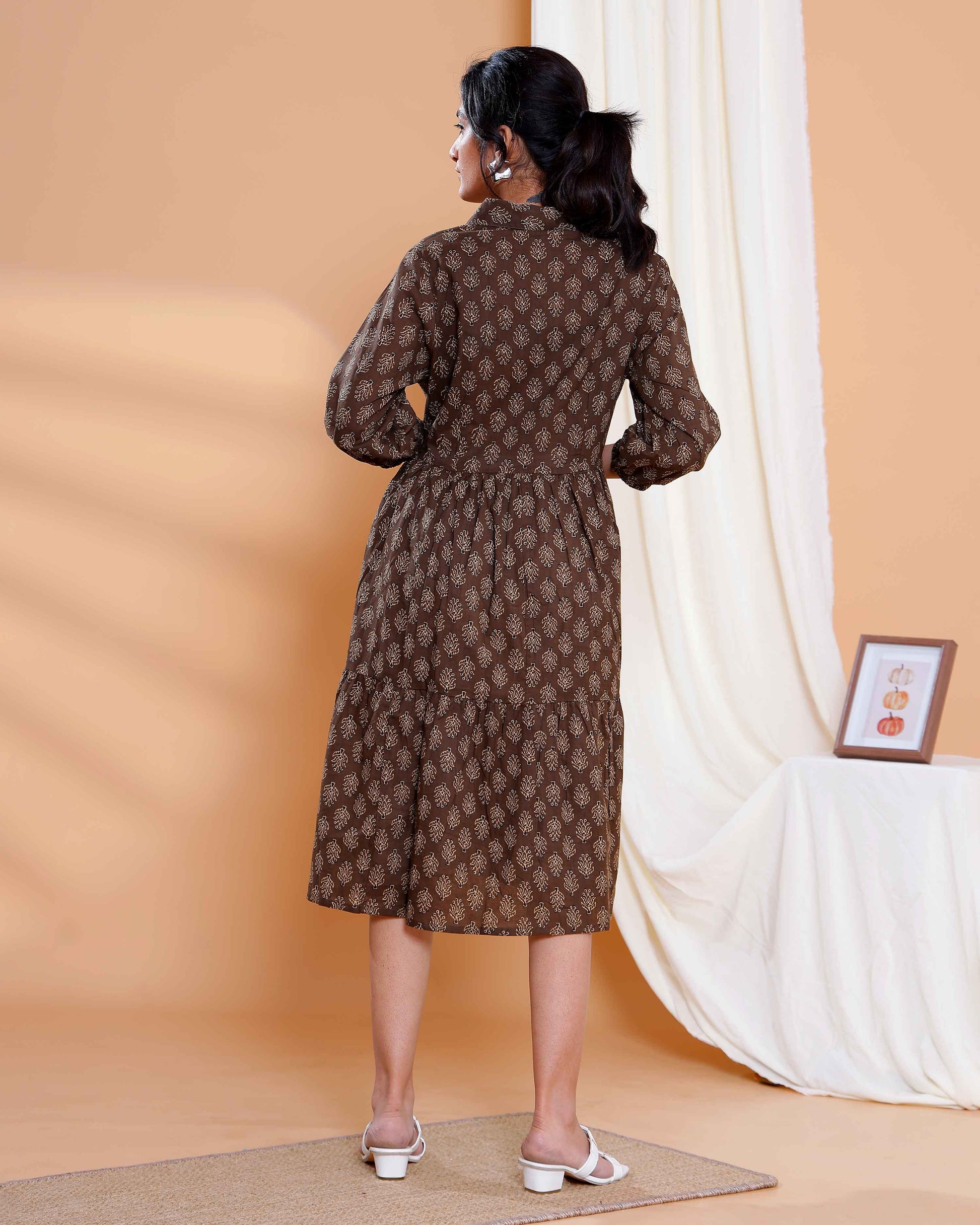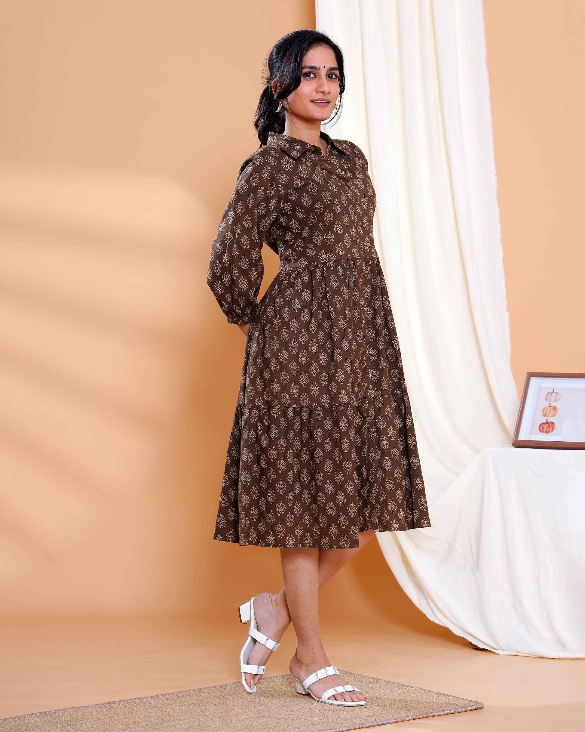 Elegant Brown Cotton Dress with Beige Leaf Motifs and Gathered Waist