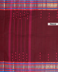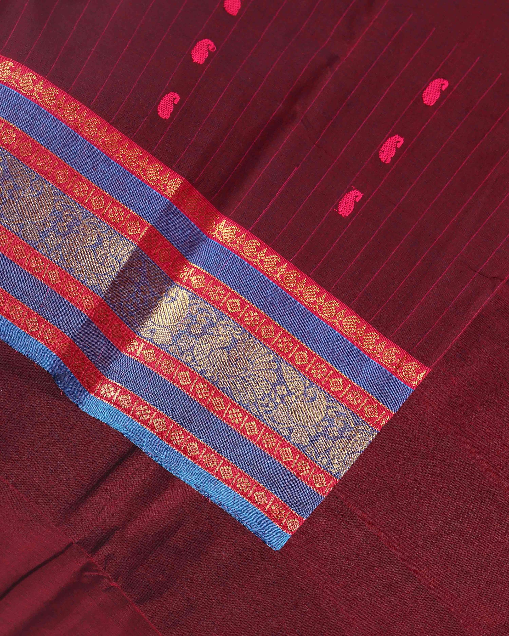 - This handwoven Chettinad cotton saree in Dark Maroon traditional striped body and a vibrant double-contrast border with intricate peacock and floral motifs.