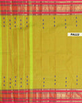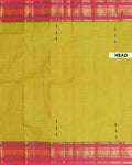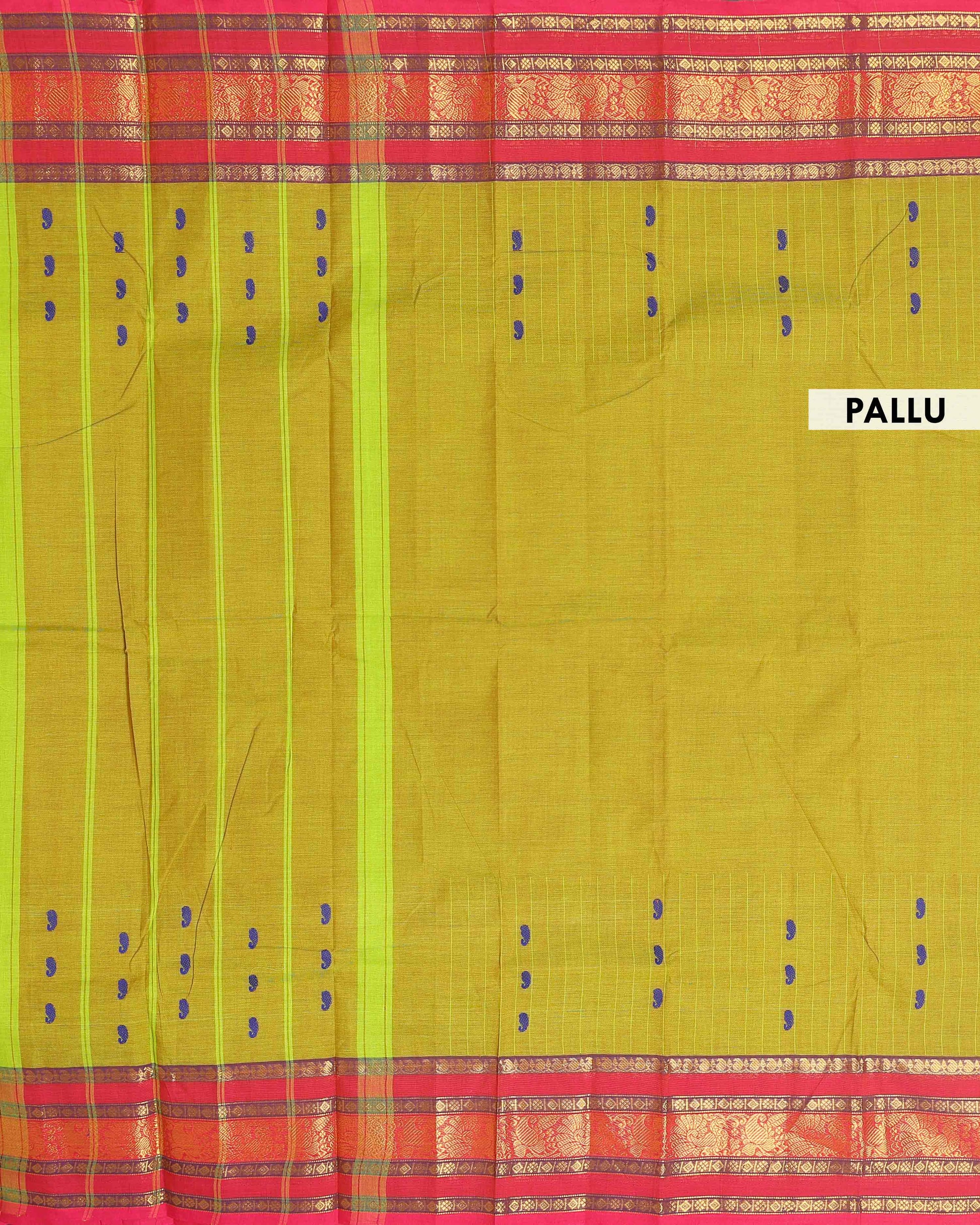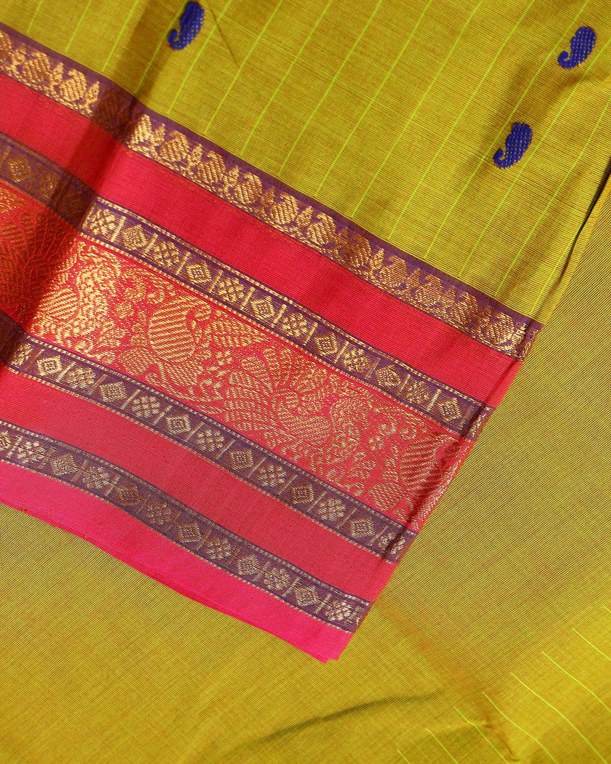 - This handwoven Chettinad cotton saree in Olive Green traditional striped body and a vibrant double-contrast border with intricate peacock and floral motifs.