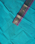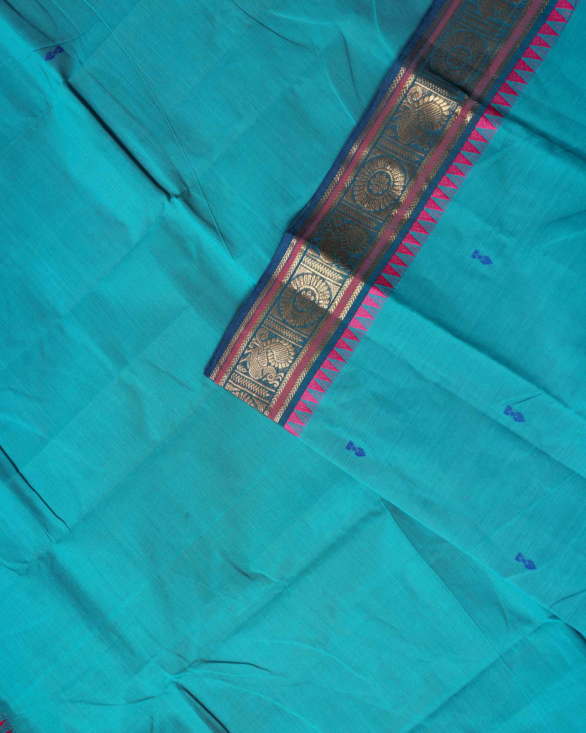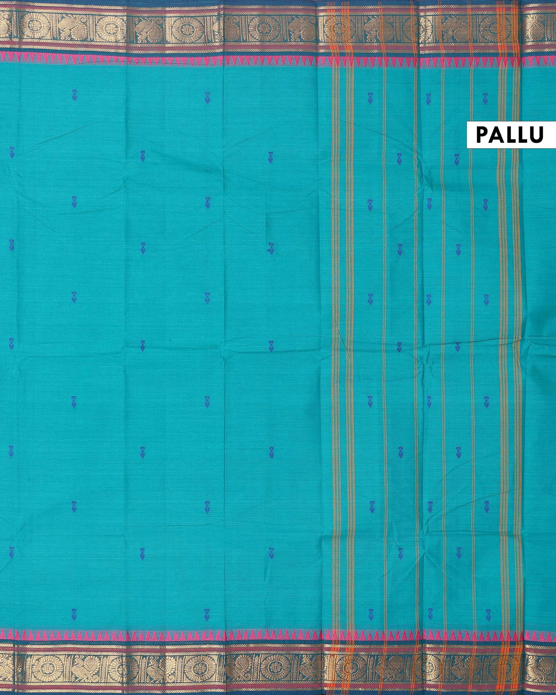 Elegant Chettinad Cotton Saree with Traditional Zari Border and Peacock Motifs - Teal