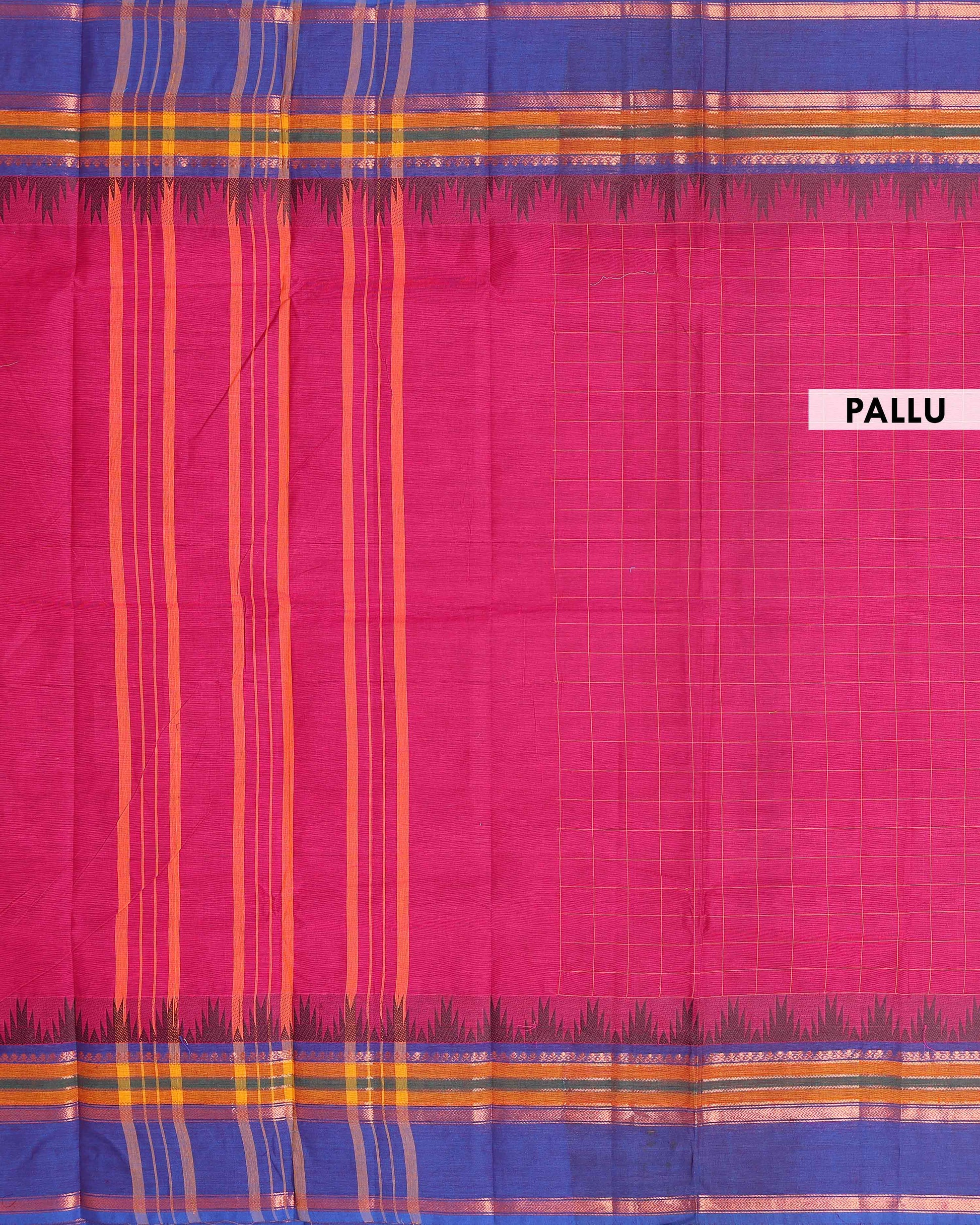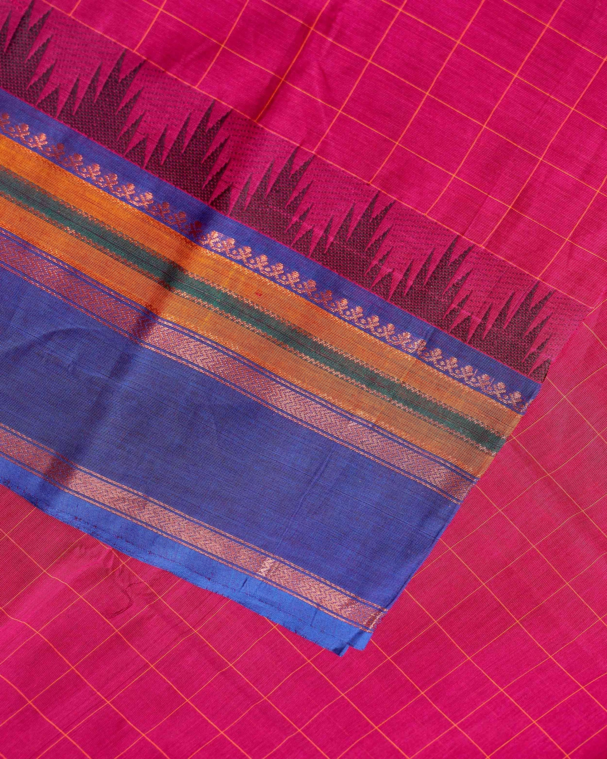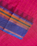 - This handloom Chettinad cotton saree a vibrant Dark Pink body with a subtle checkered pattern, offering a graceful drape and comfortable feel