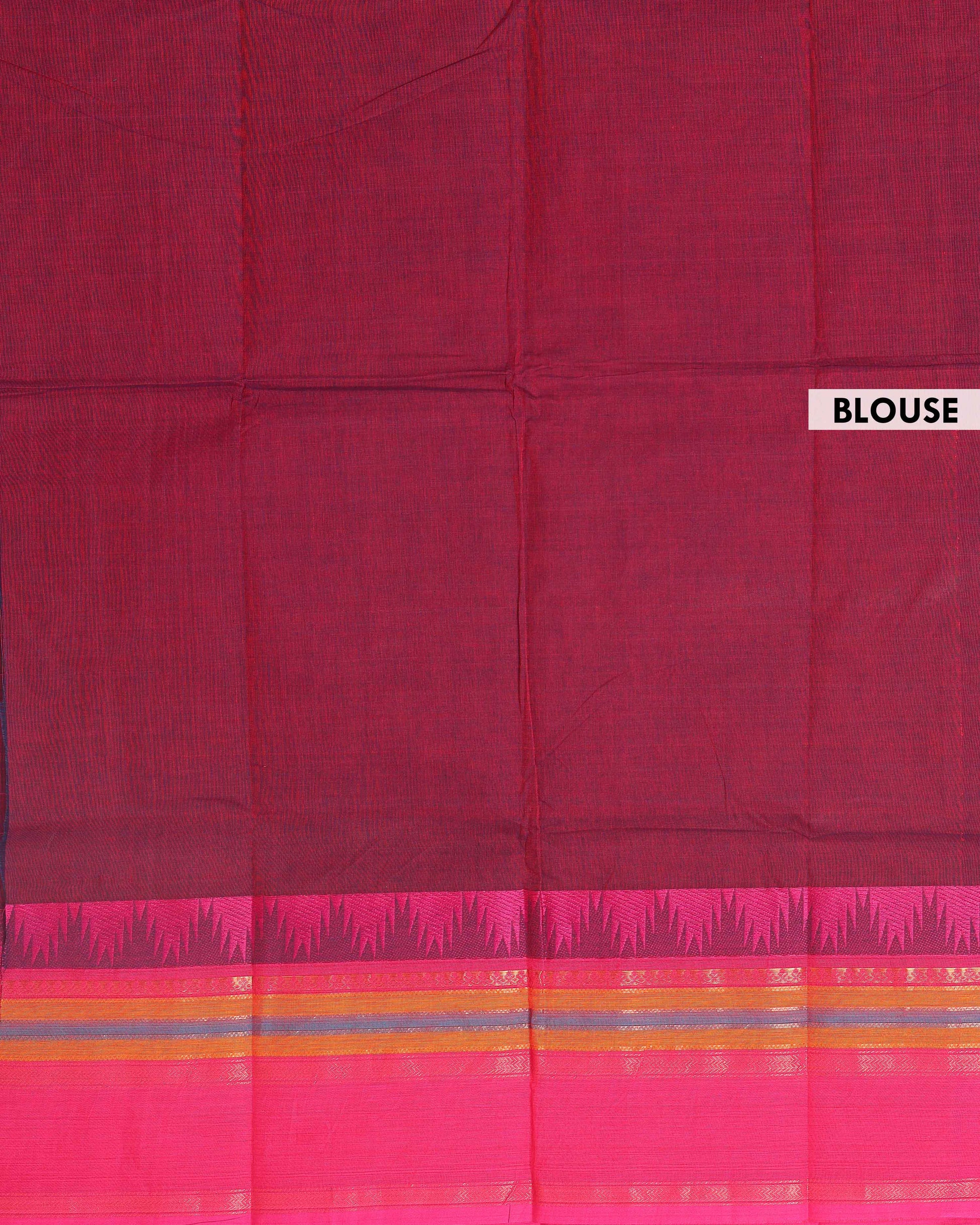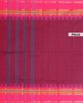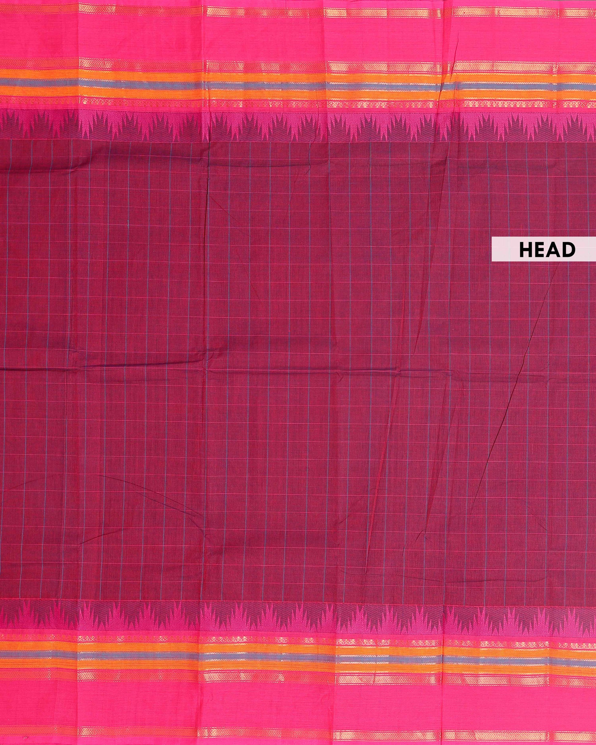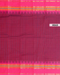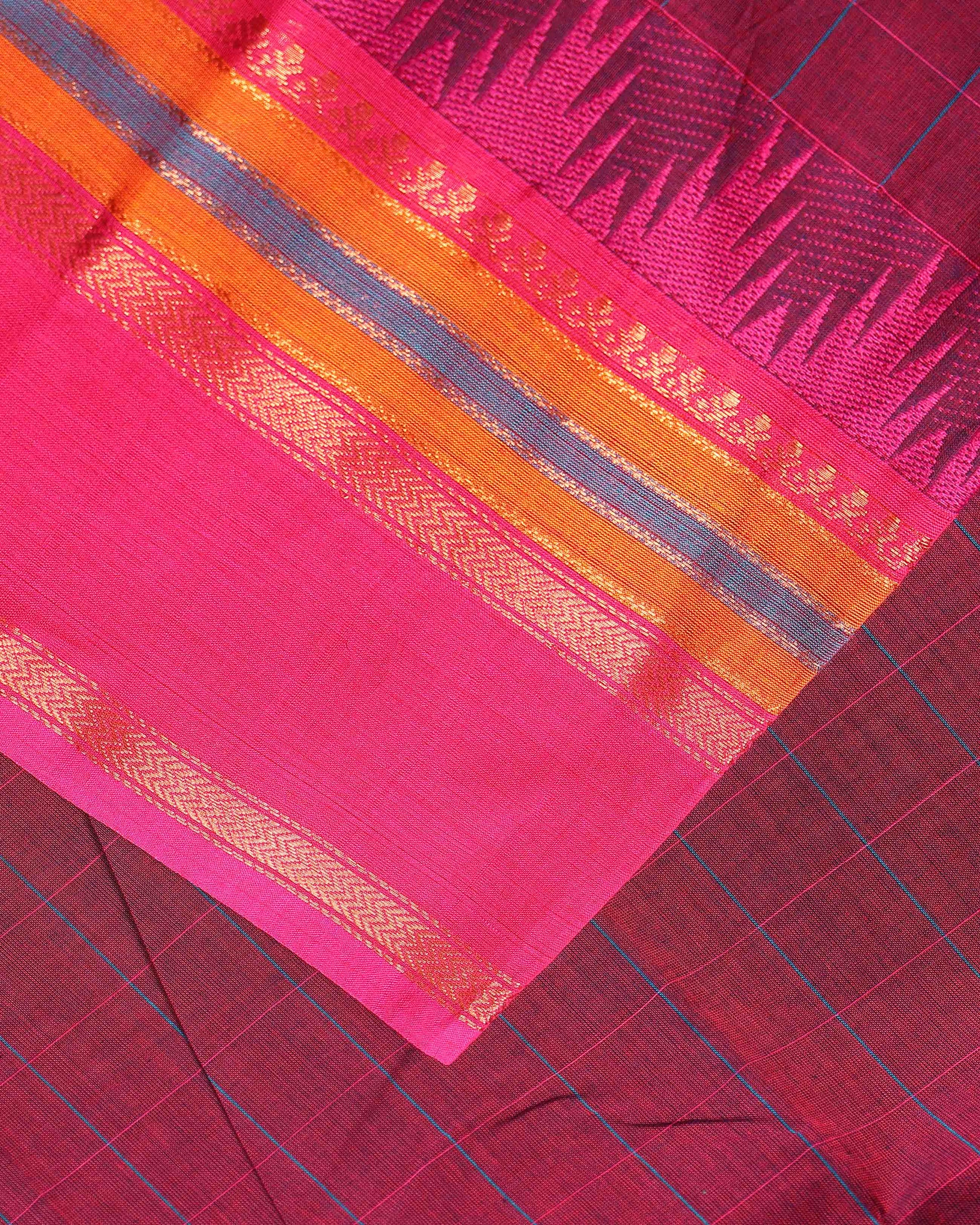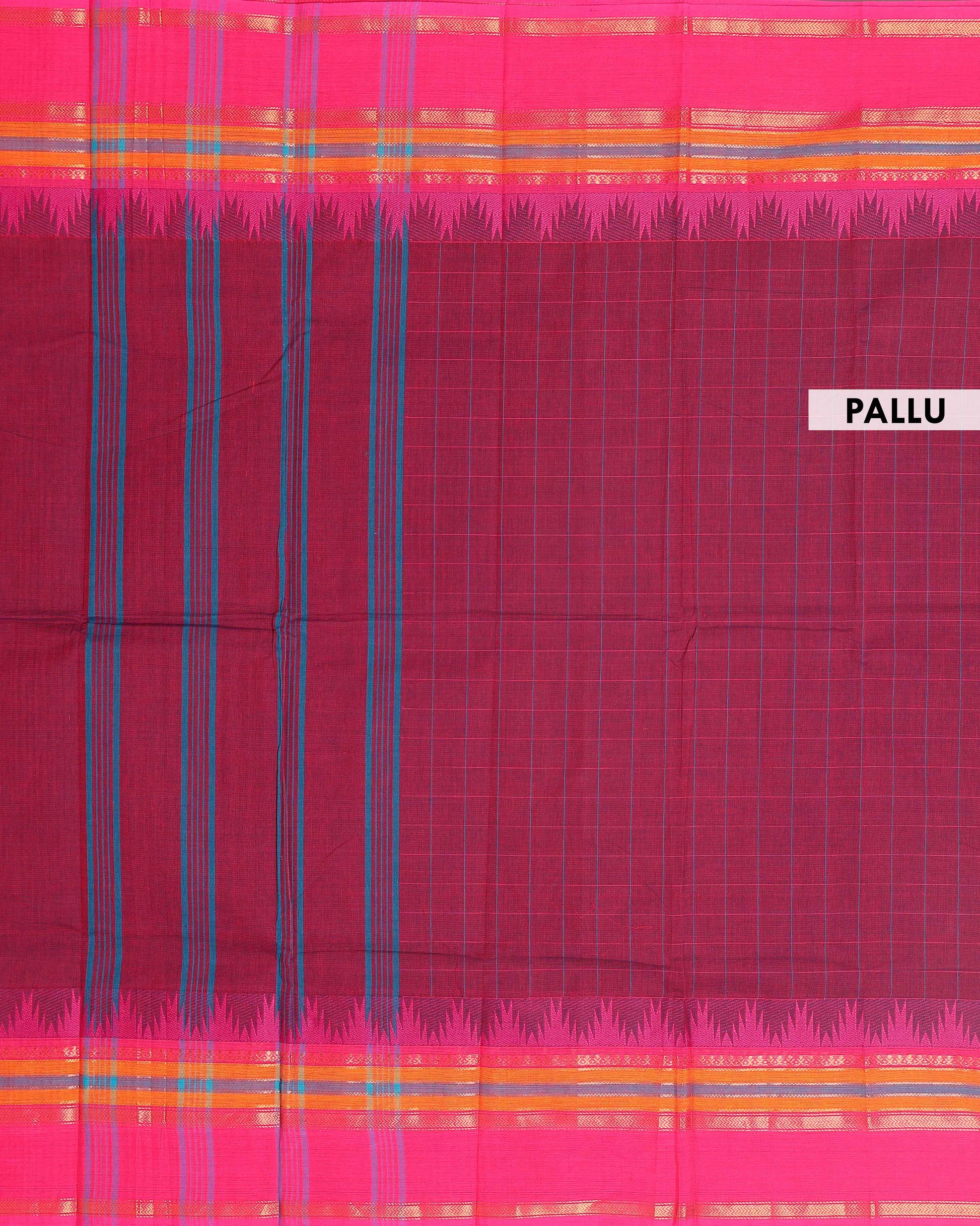 - This handloom Chettinad cotton saree a vibrant Maroon body with a subtle checkered pattern, offering a graceful drape and comfortable feel
