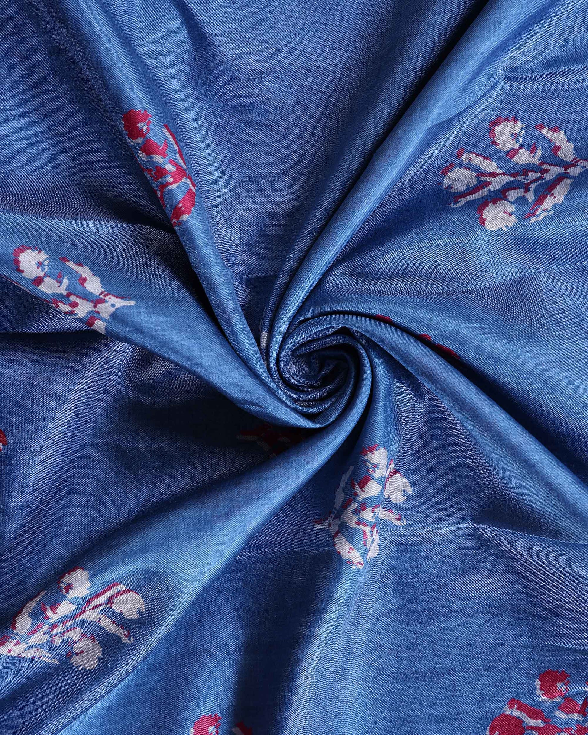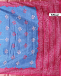 This elegant dola Semi silk saree a vibrant Blue body with intricate white floral patterns - The contrasting border showcases floral motifs, making it a perfect blend of traditional and contemporary design