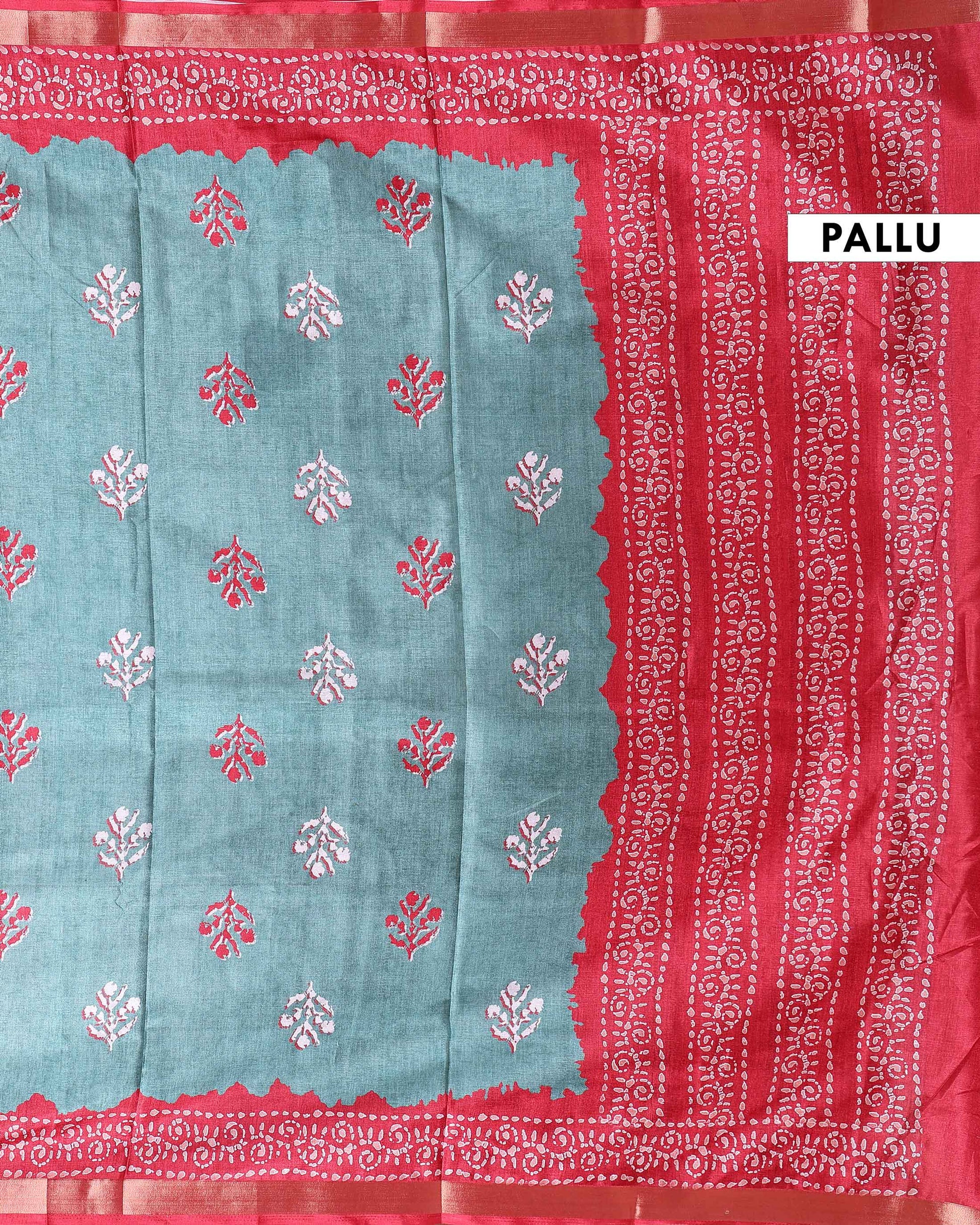 - This elegant dola Semi silk saree a vibrant Green body with intricate white floral patterns