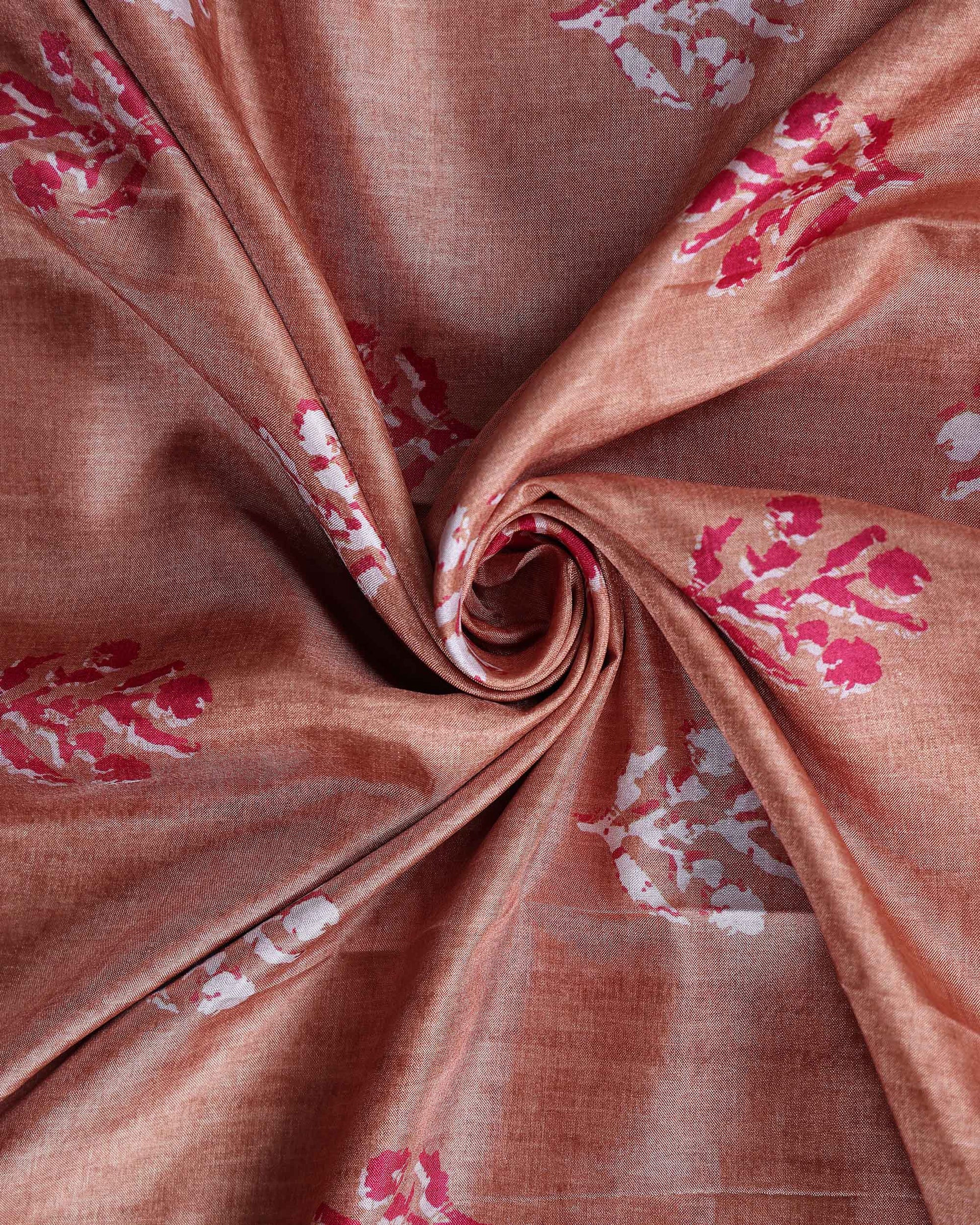 This elegant dola Semi silk saree a vibrant Brown body with intricate white floral patterns - The contrasting border showcases floral motifs, making it a perfect blend of traditional and contemporary design