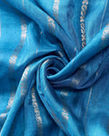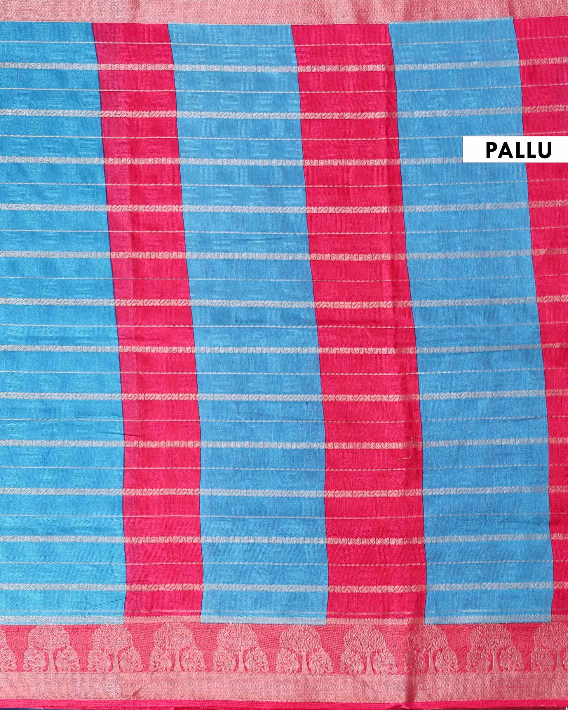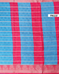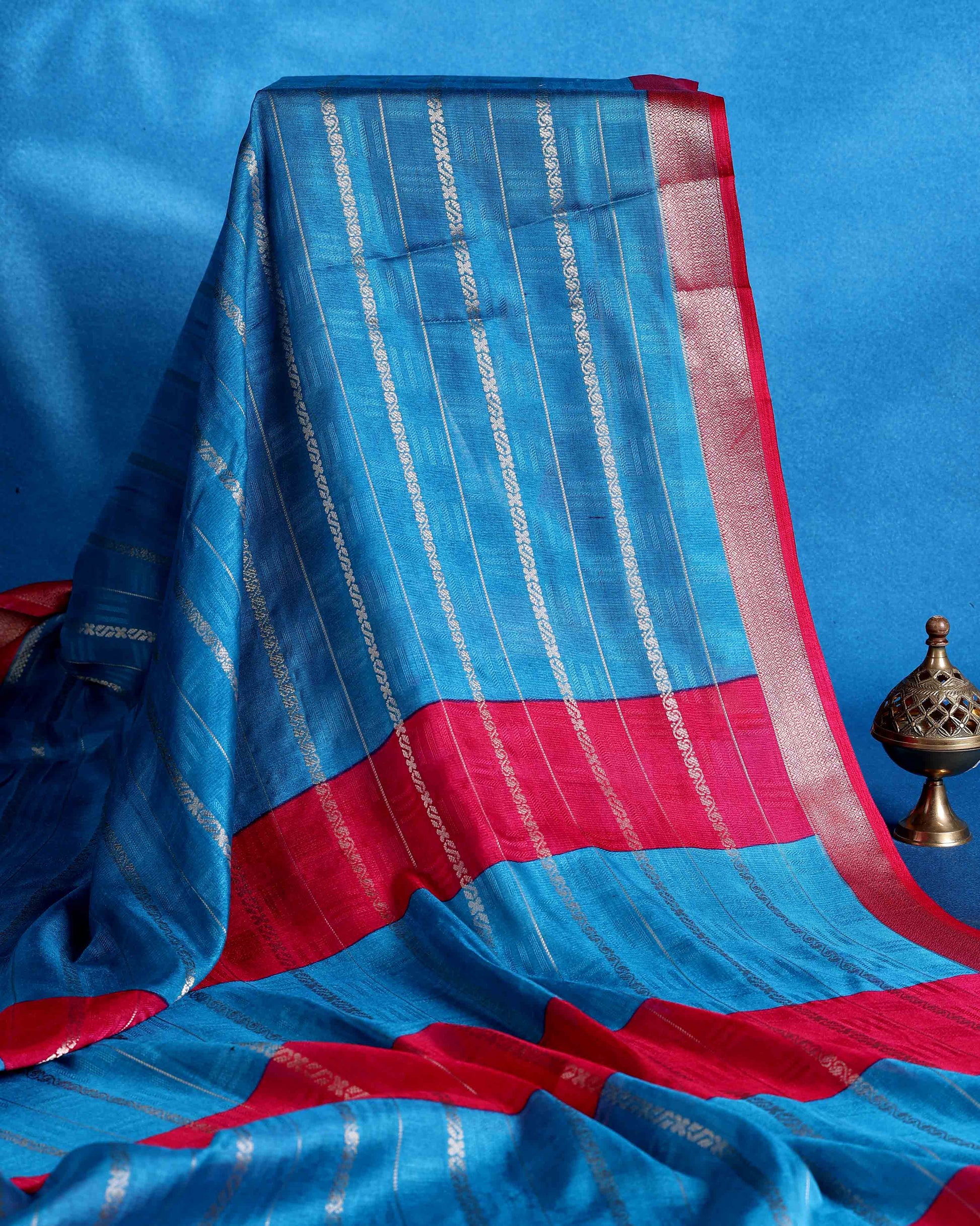 - This stunning blue and red Dola silk saree elegant vertical zari stripes and a rich contrast border, perfect for any festive occasion or wedding.
