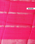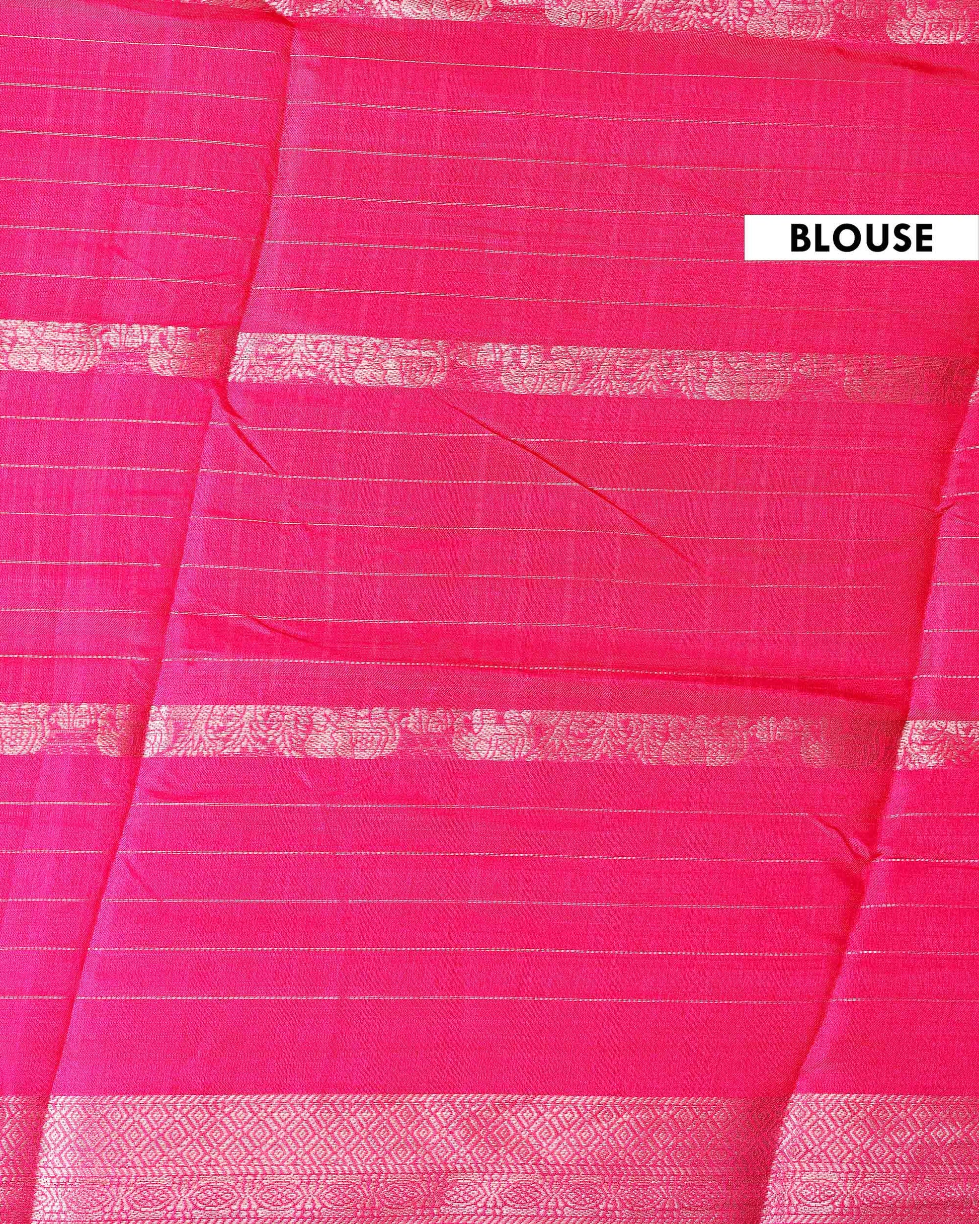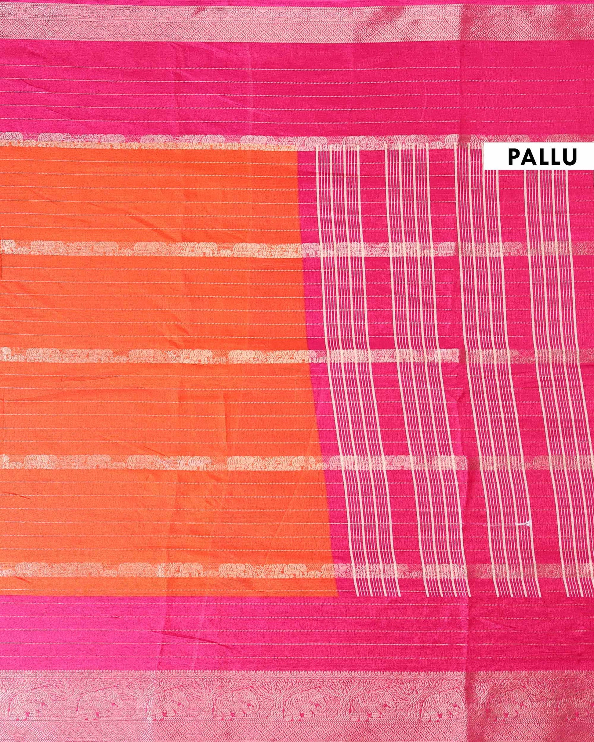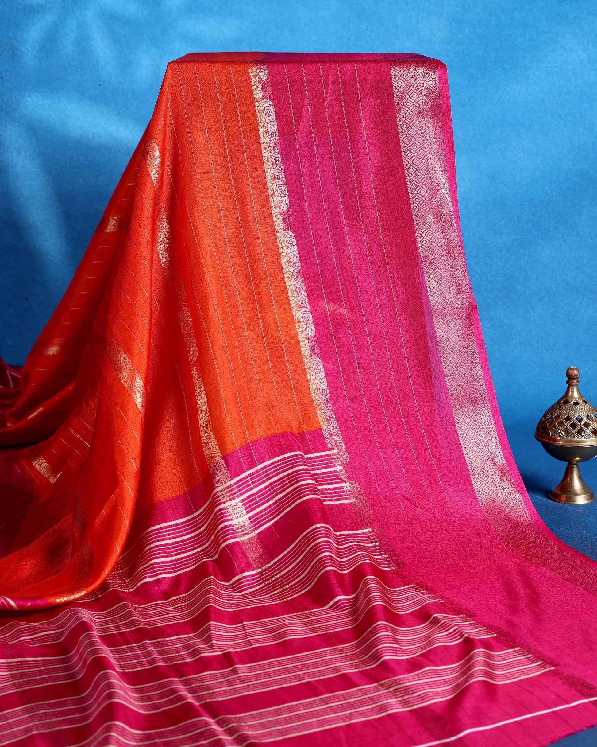 - Vibrant orange and pink dola silk saree with a stunning gold zari border and elegant striped pattern on the pallu.