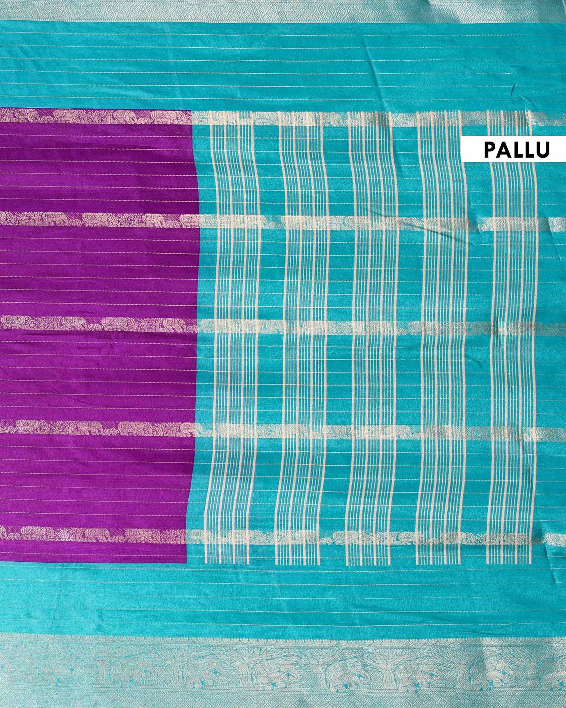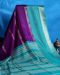 - In the vibrant elegance of this exquisite Dola Saree blending rich purple with a striking teal border
