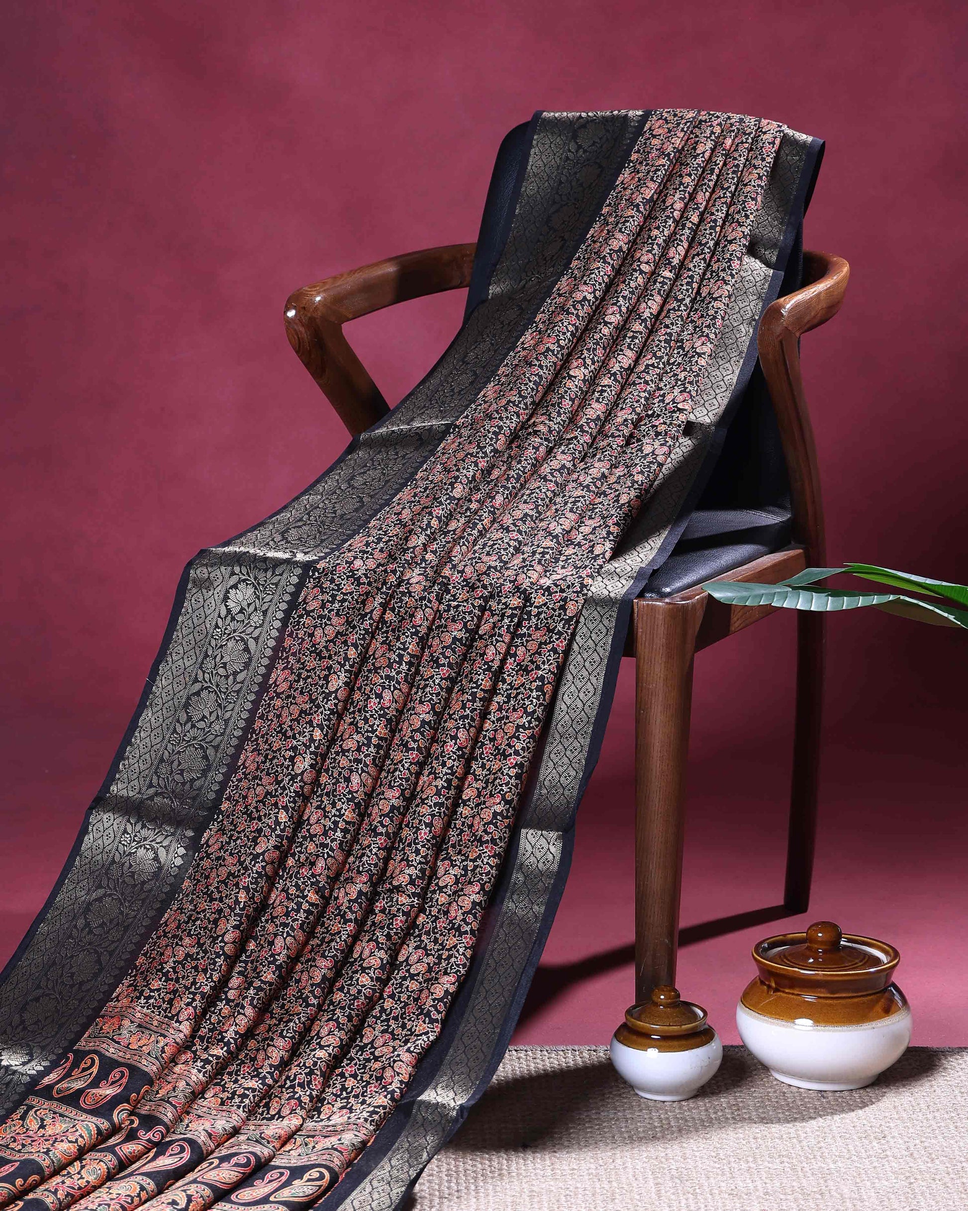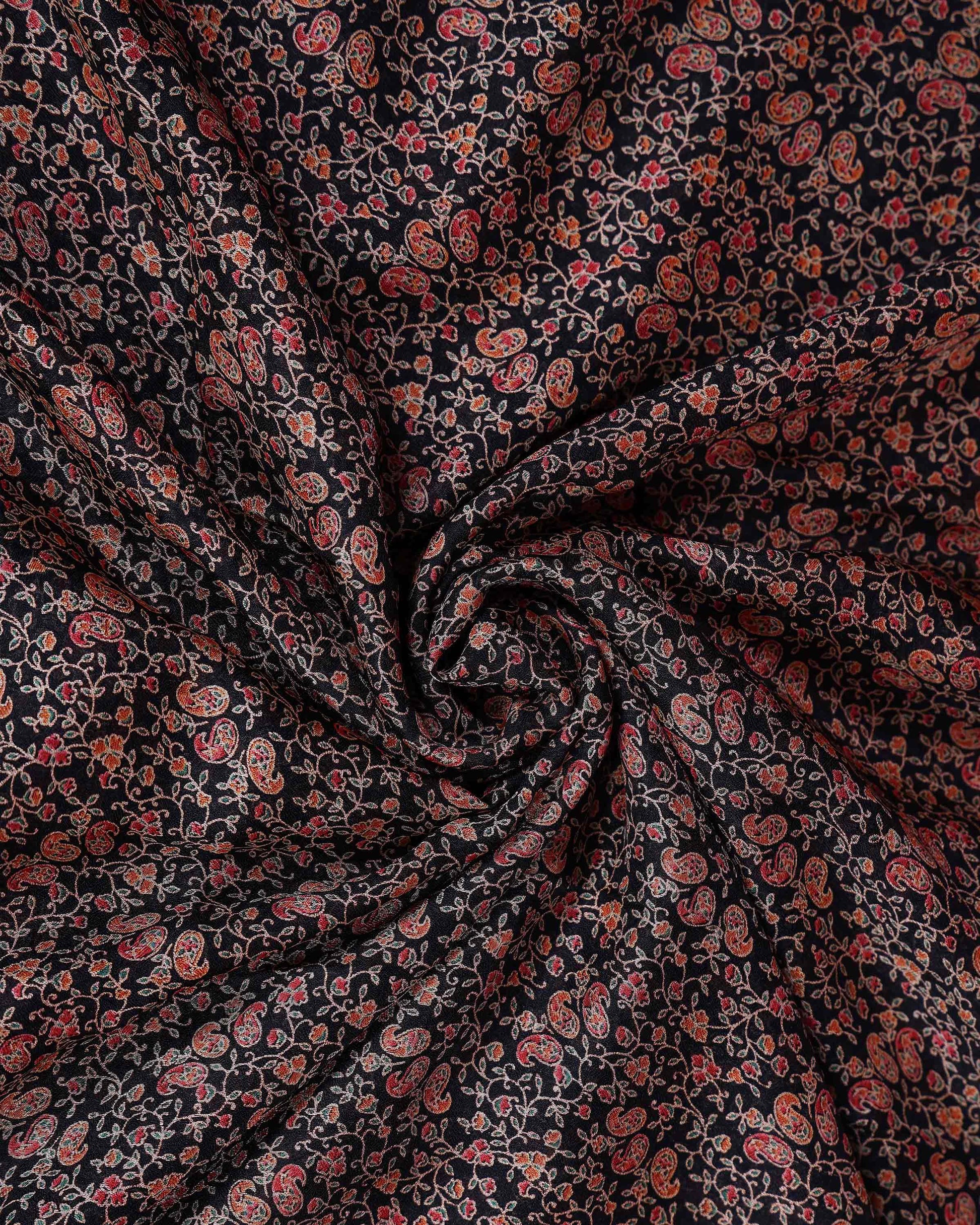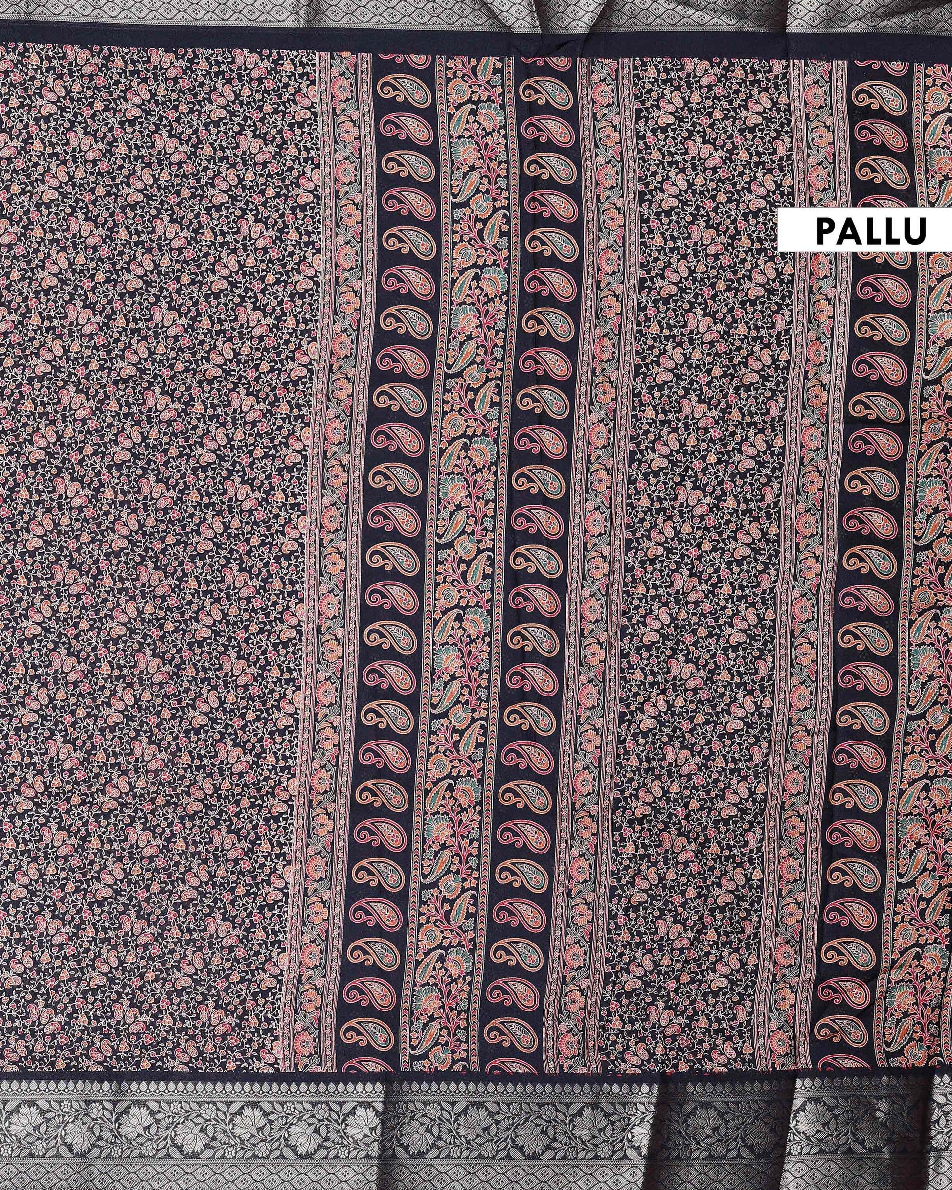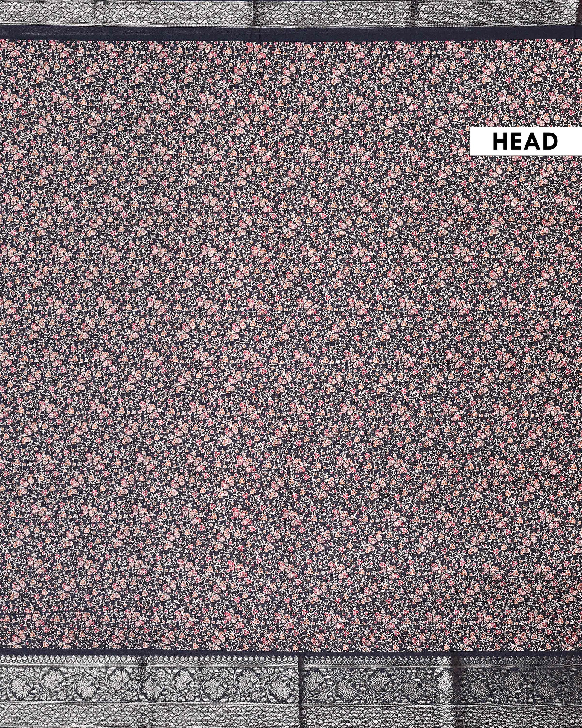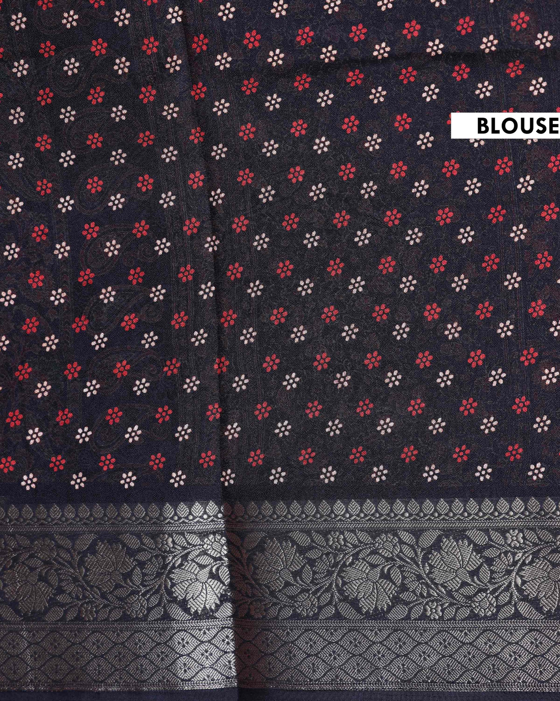 - Elegant Black Dola Silk Saree adorned with intricate all over floral buti motifs and a beautifully woven traditional border, perfect for festive and wedding occasions.