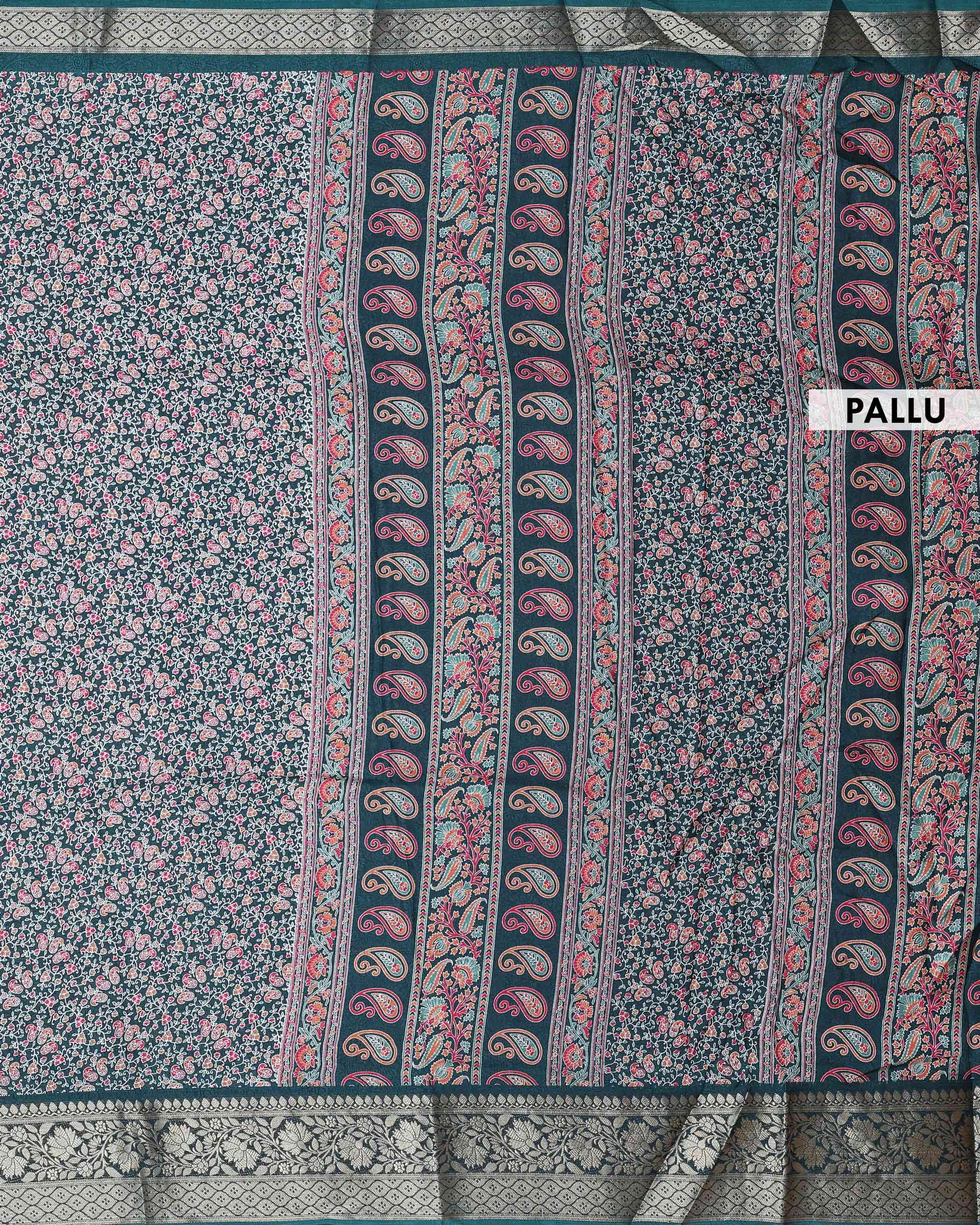 Elegant Dola Silk Saree with All Over Floral Print and Rich Woven Zari Border - Bottle Green