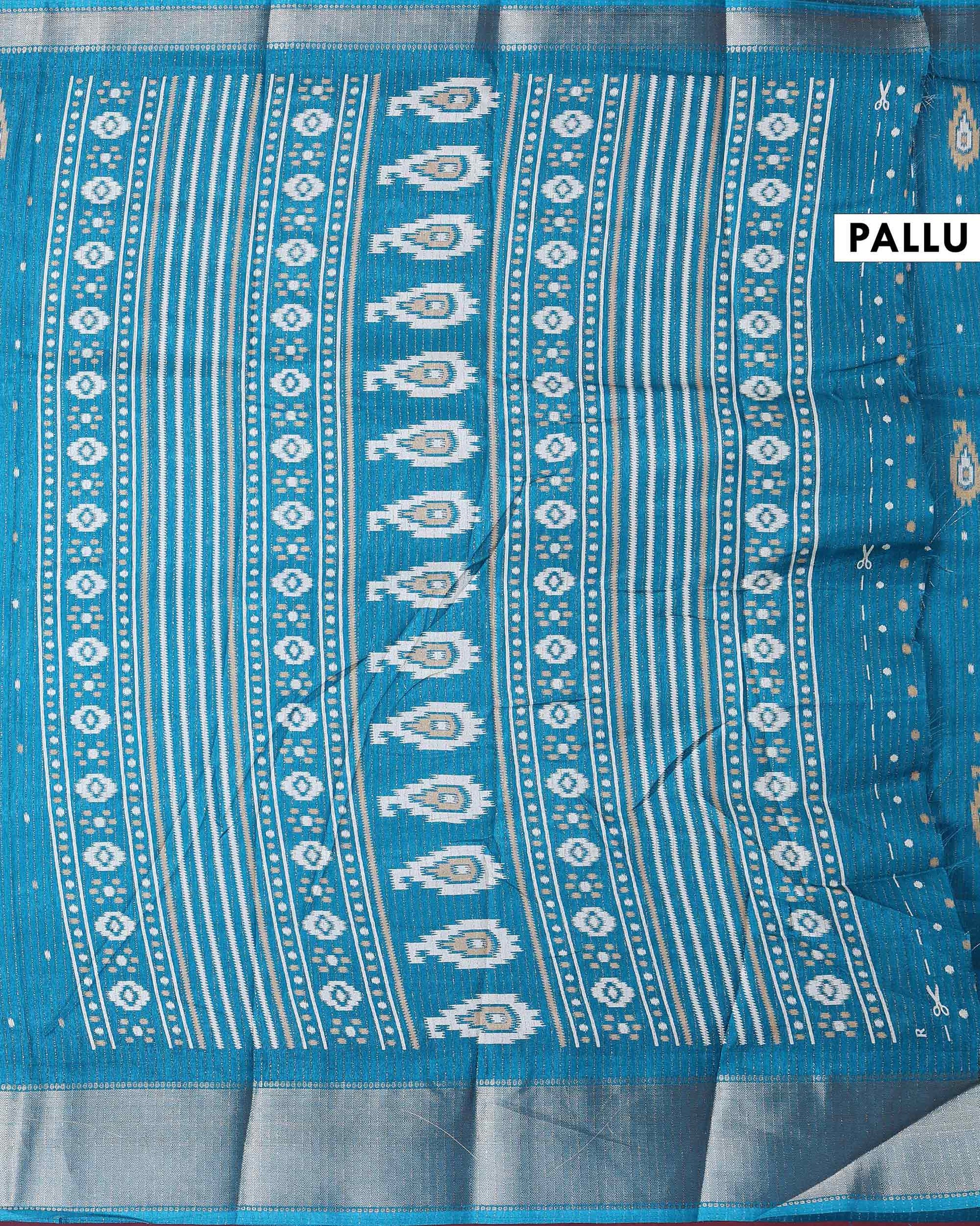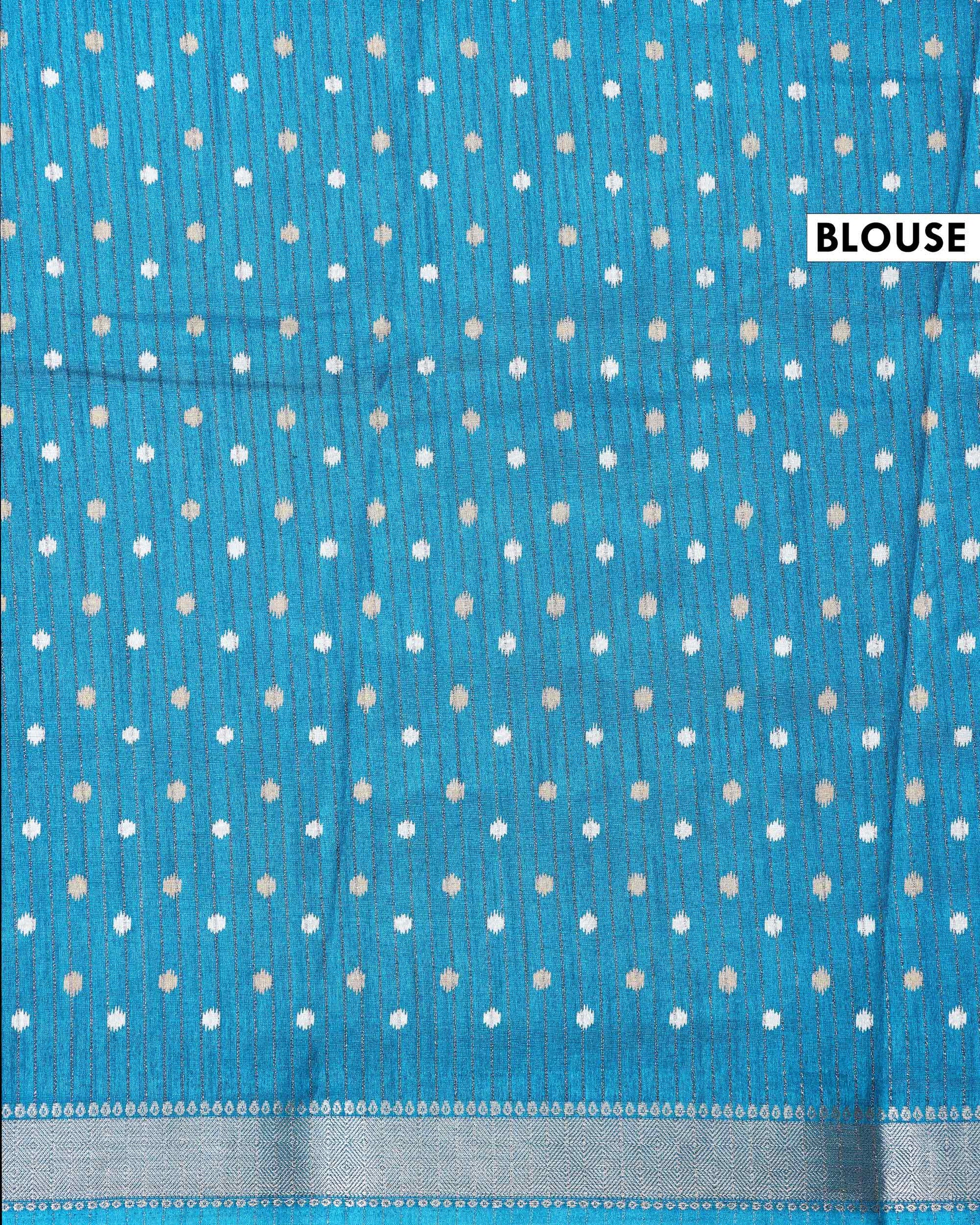 Elegant Blue Dola Silk Saree with a rich woven zari border and subtle buti motifs.