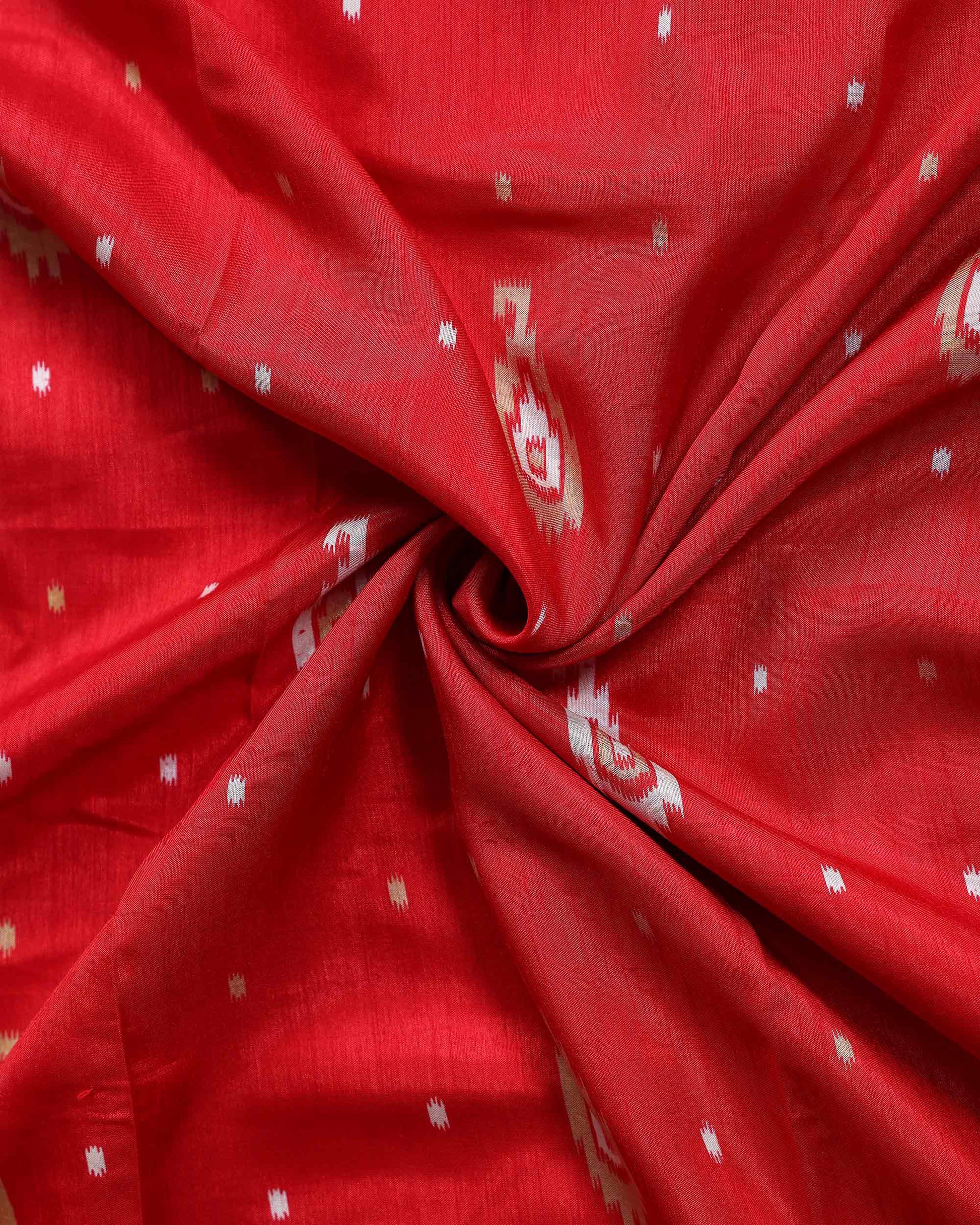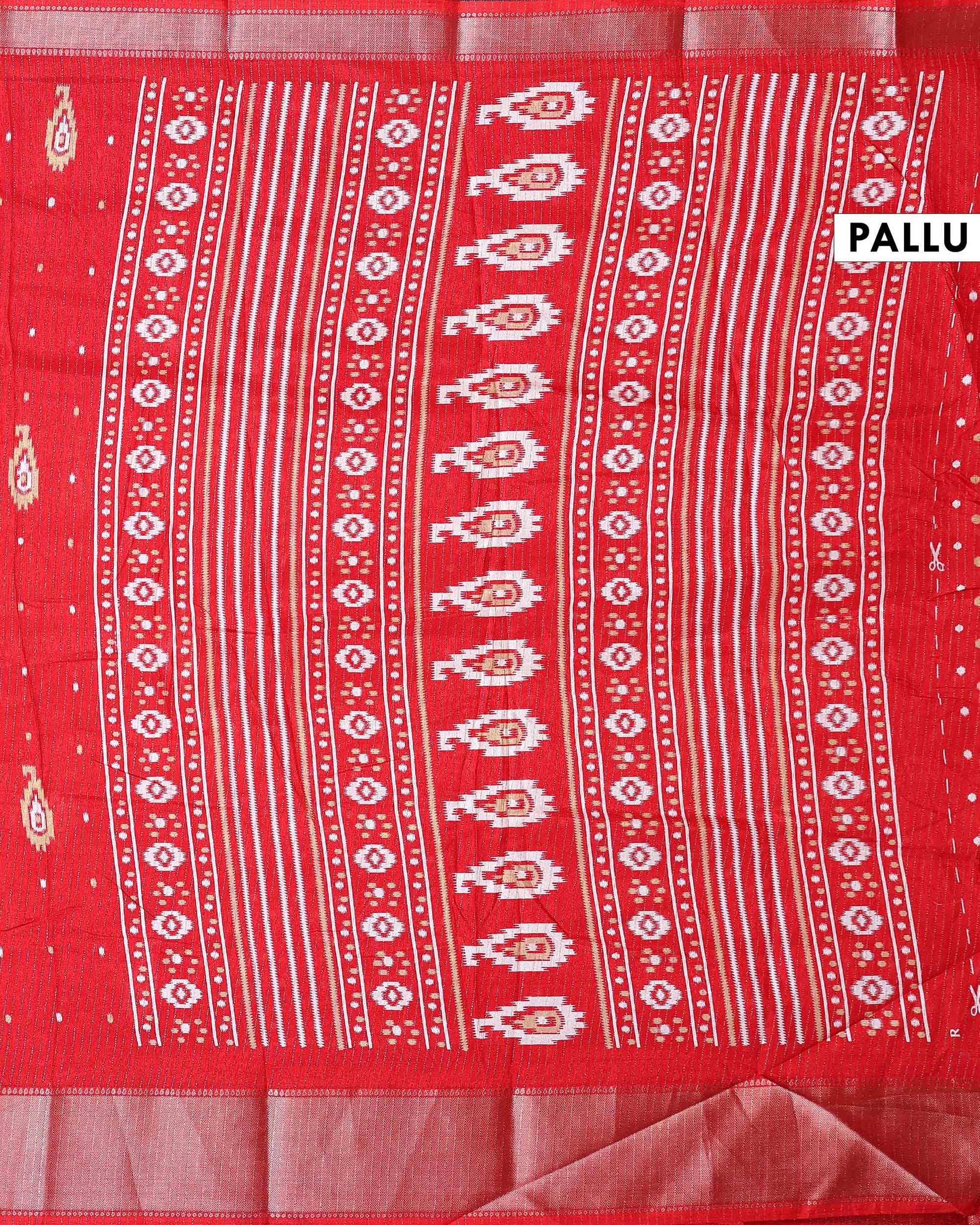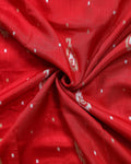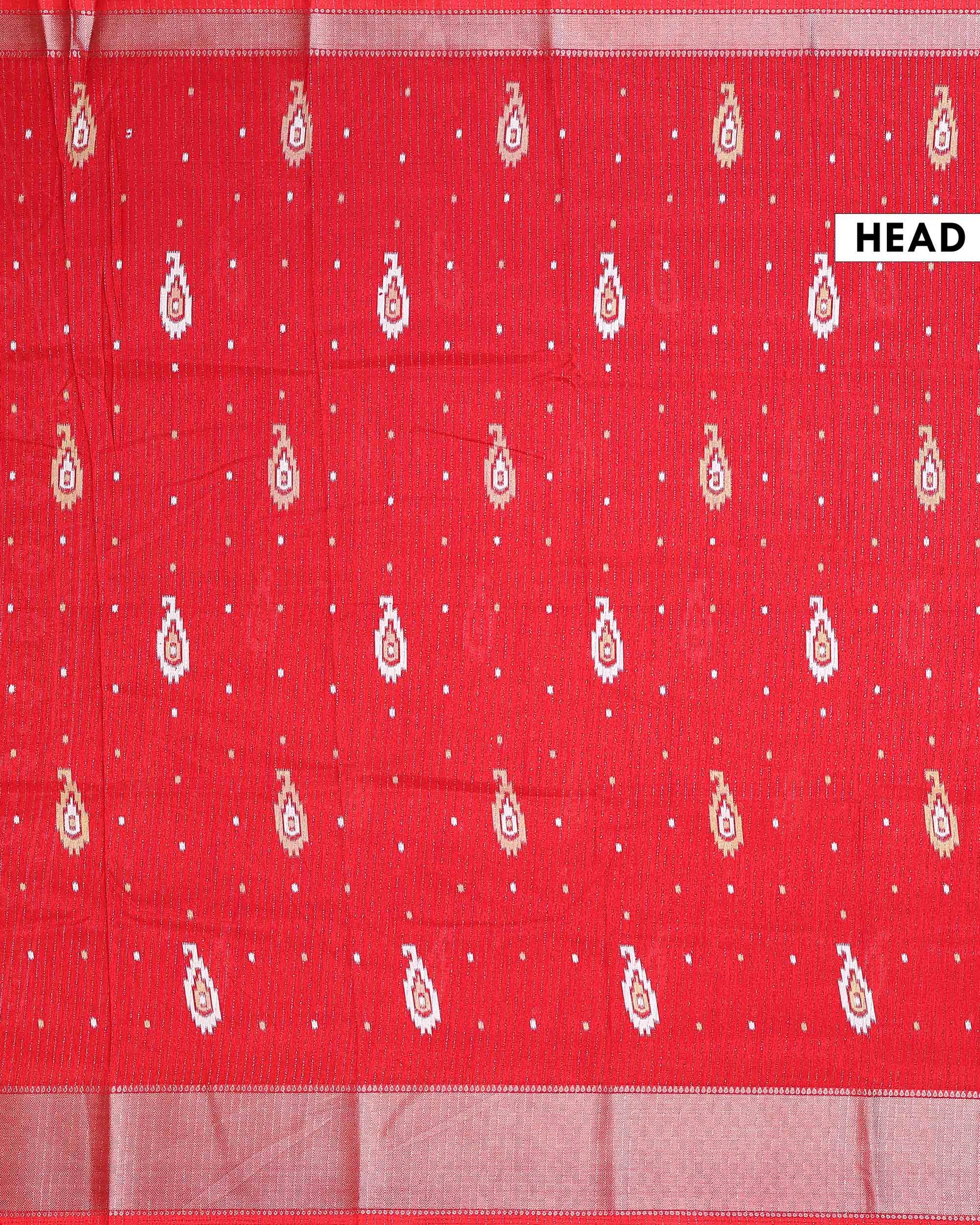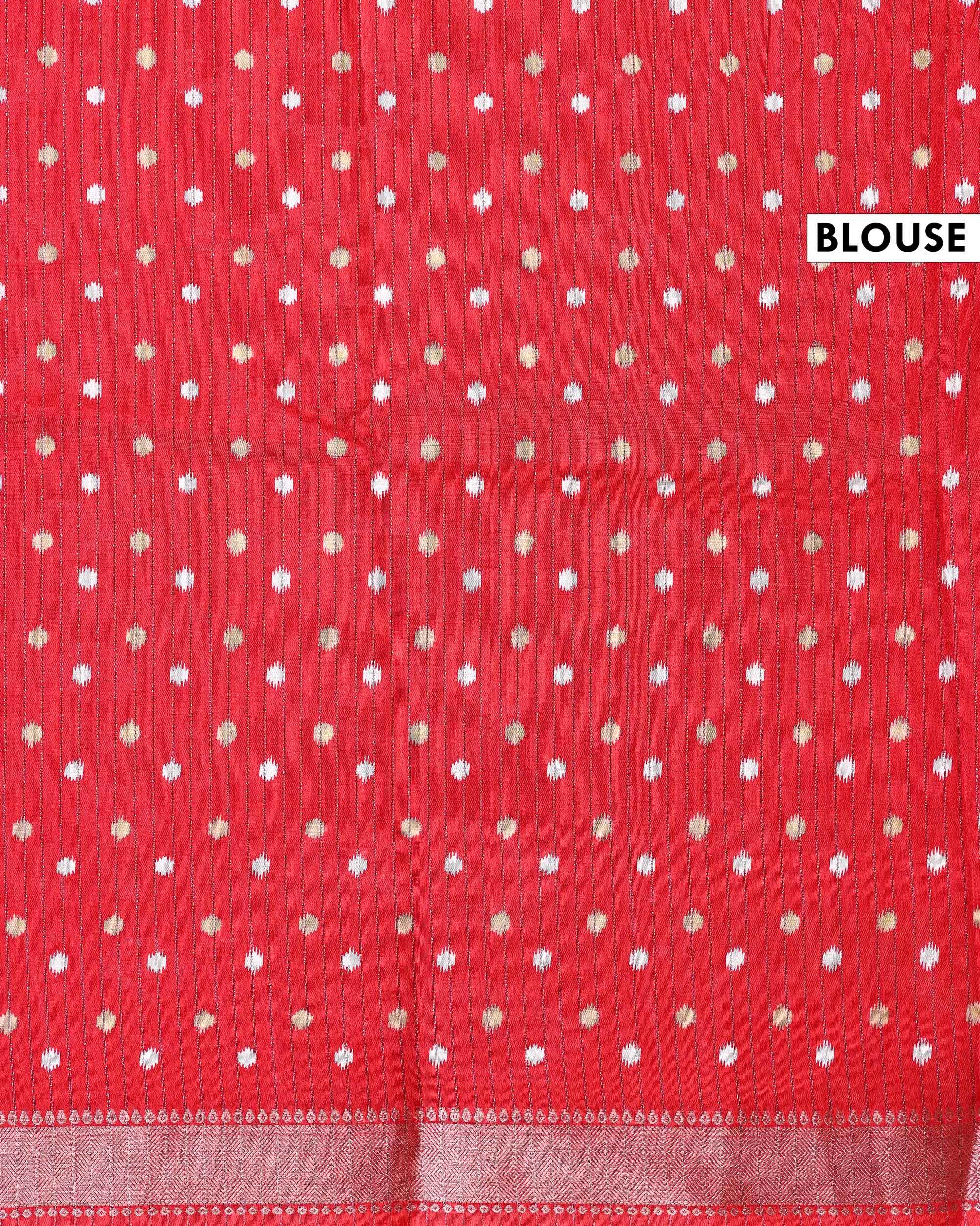 Elegant Red Dola Silk Saree with a rich woven zari border and subtle buti motifs.