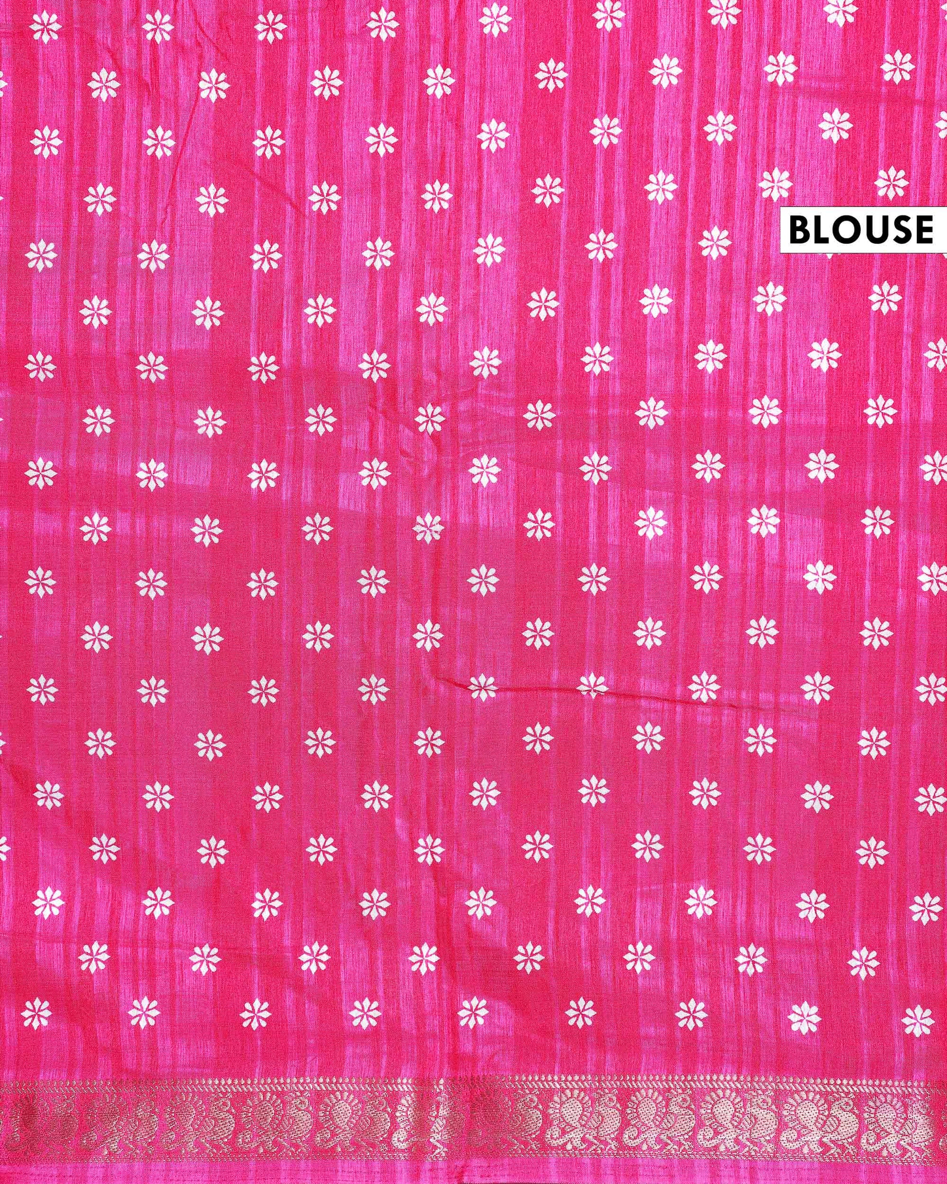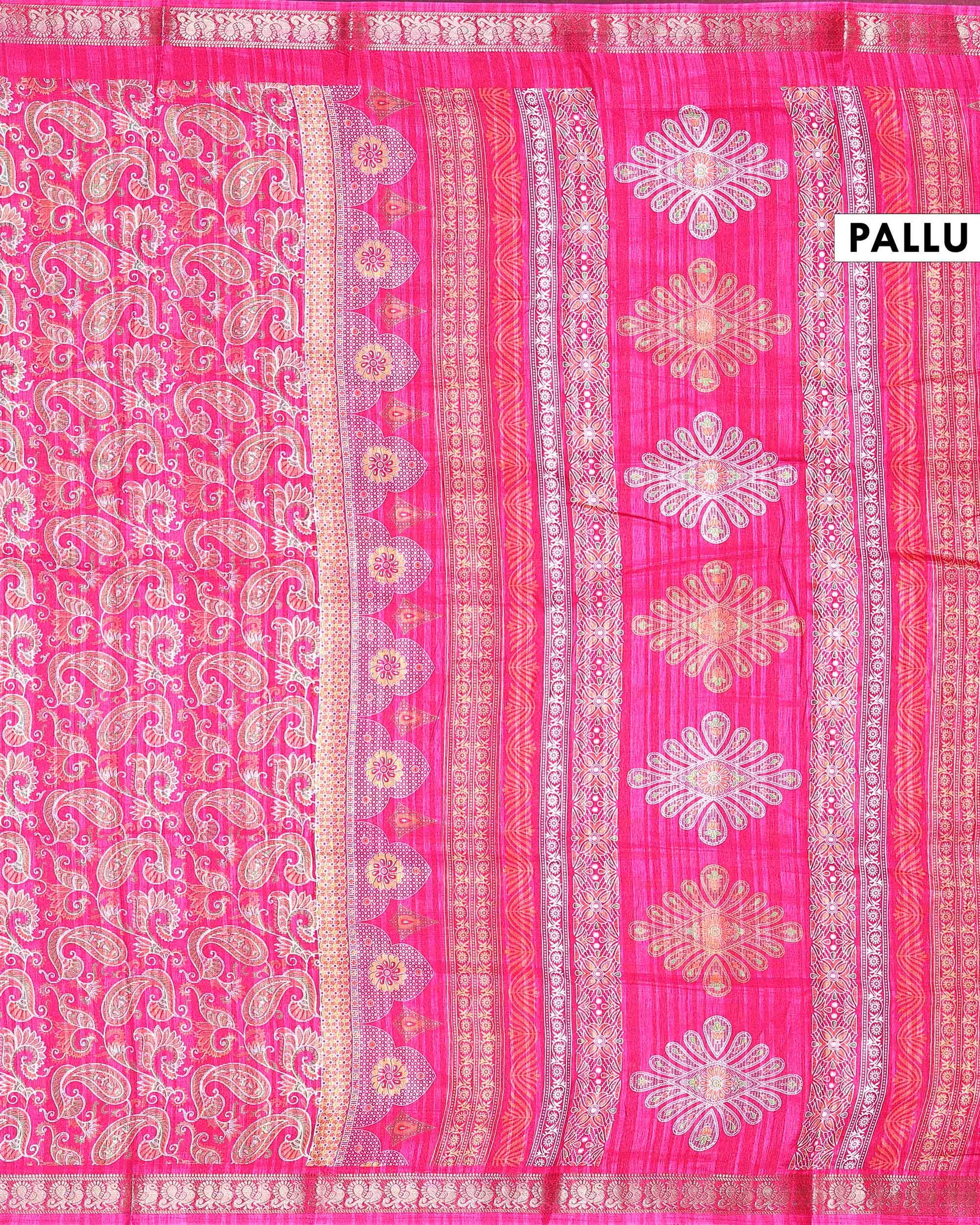 - This elegant Dola silk saree all over traditional paisley buti motifs complemented by an intricate zari woven floral border, showcasing timeless craftsmanship and rich ethnic appeal.