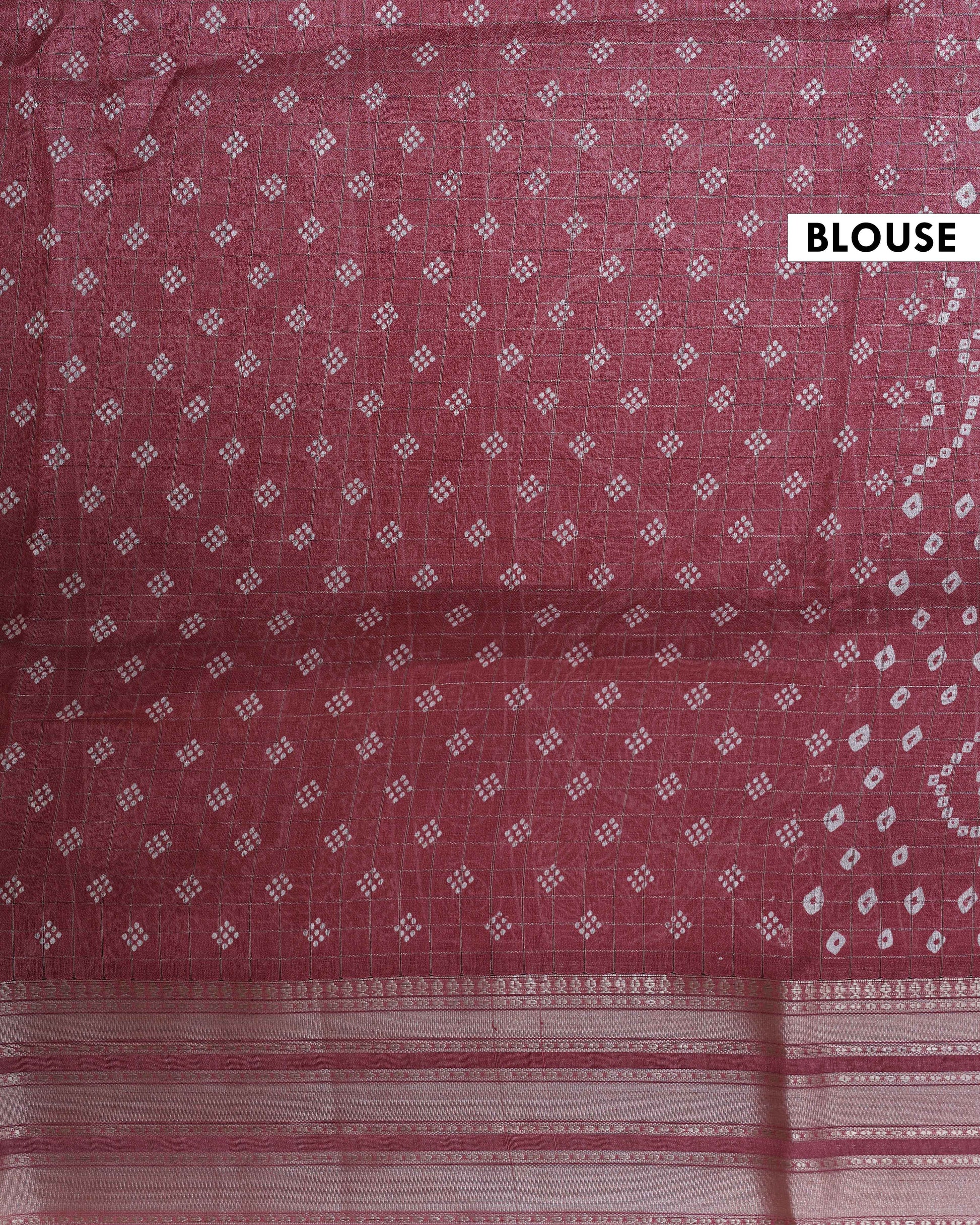 - This elegant Dola silk saree a vibrant Burgundy adorned with a traditional Bandhani inspired print