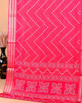 - This vibrant pink semi dola saree an all over bandhani print with a contrasting zari woven border