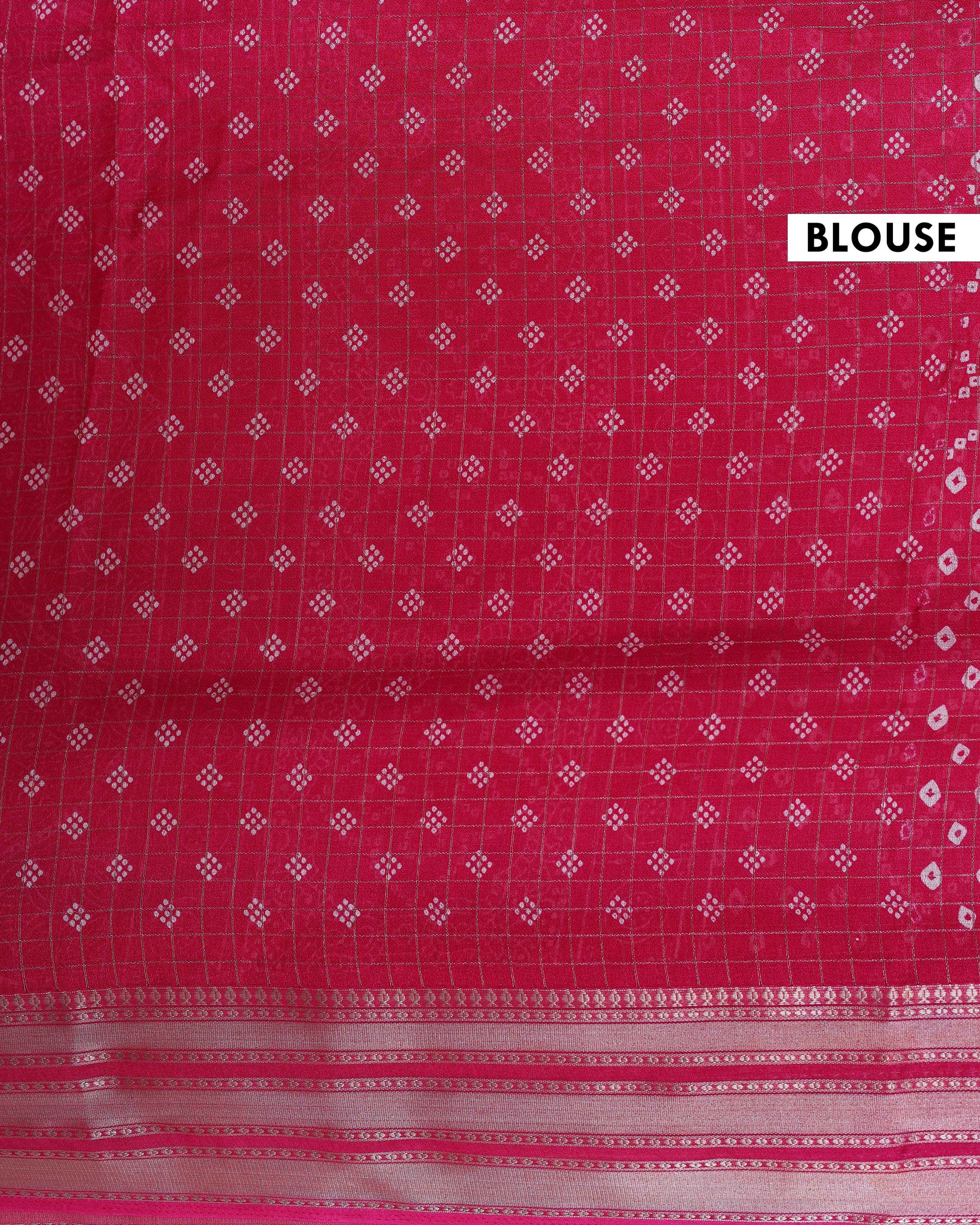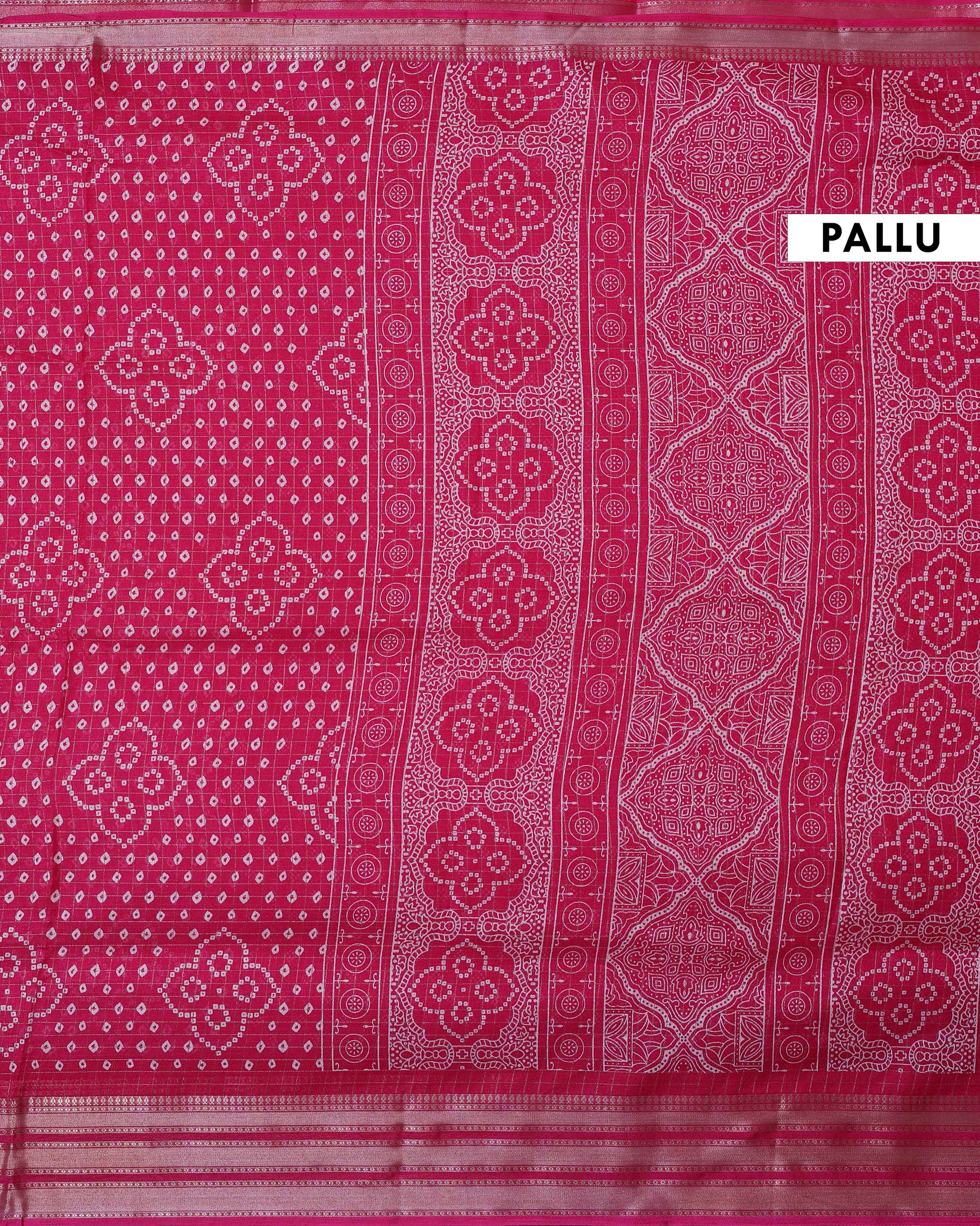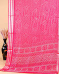 - Elevate your style with this vibrant pink Dola silk saree an intricate all over bandhani print and a contrasting zari woven border.