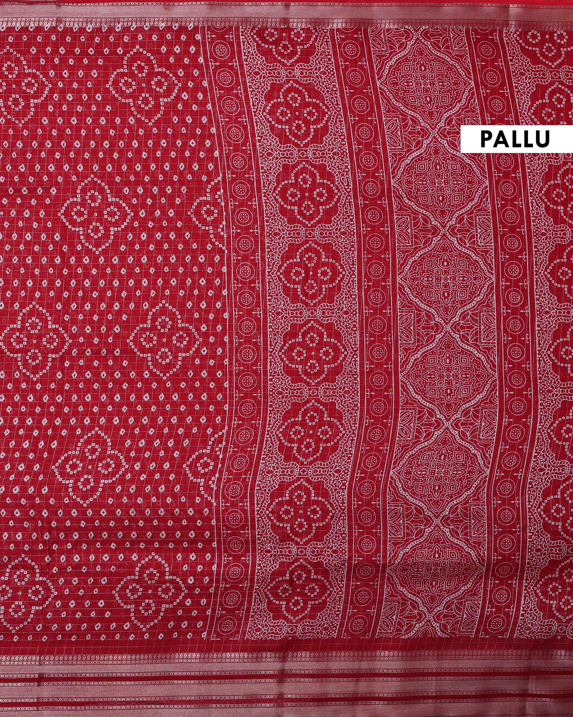 - This elegant red Dola silk saree a traditional bandhani print with intricate patterns throughout the body